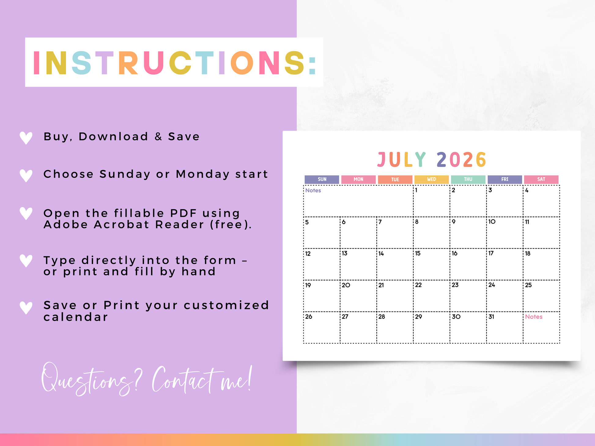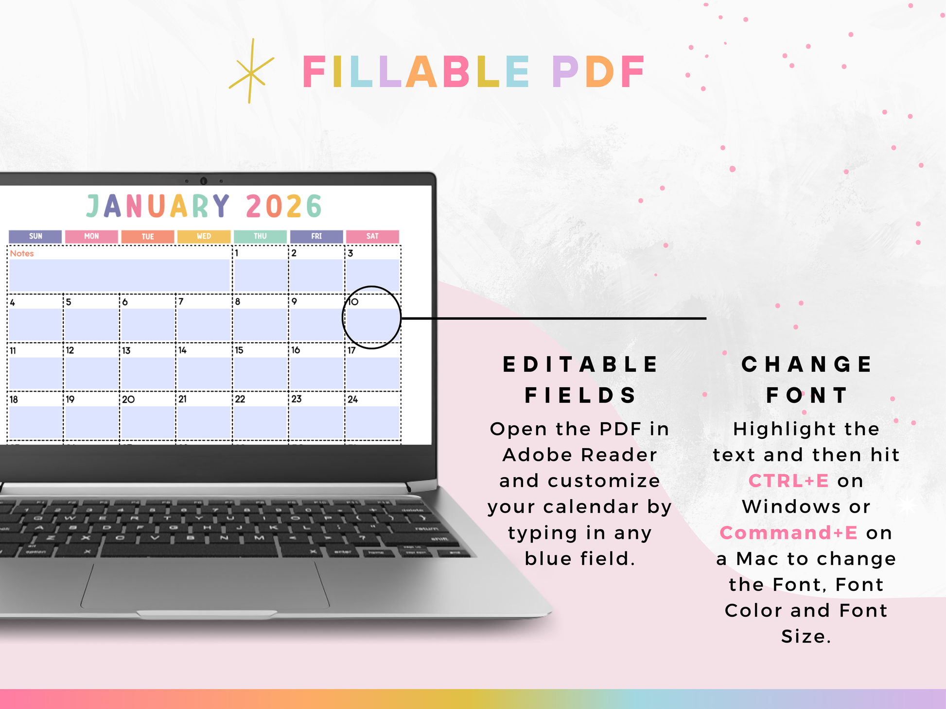 Type directly into each calendar using free Adobe Acrobat Reader, or print it out for your planner, binder, or command center. Includes both Sunday and Monday start versions.