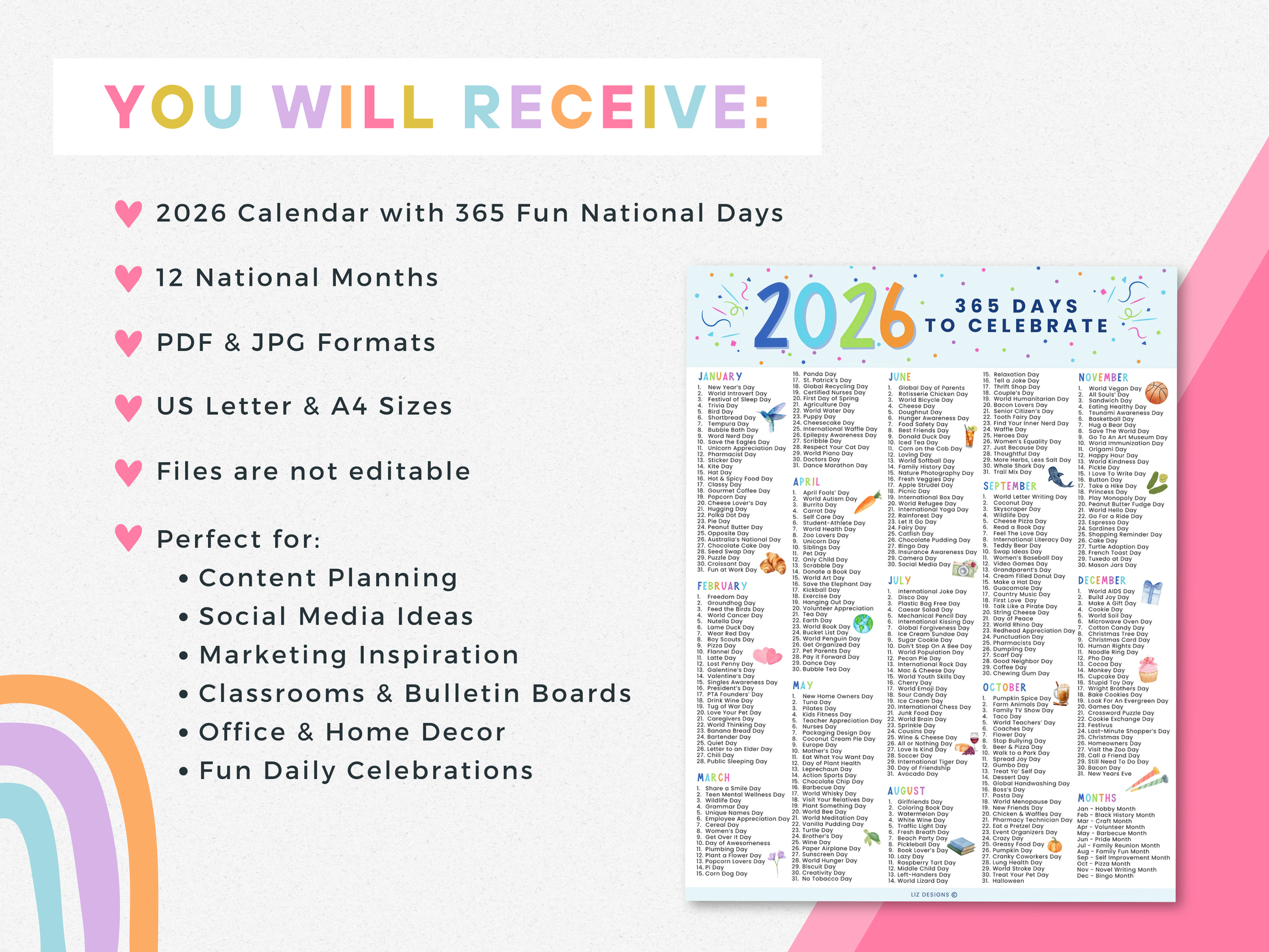 The ππππ ππππππππ ππππ ππππππππ is your go-to guide for planning, posting, and celebrating all year long! With 365 fun, quirky, and meaningful holidays, this one-page printable is perfect for content creators, business owners, and anyone who loves adding a little joy to each day. Itβs a great tool for sparking creativity, generating social media ideas, and staying inspired every day of the year.