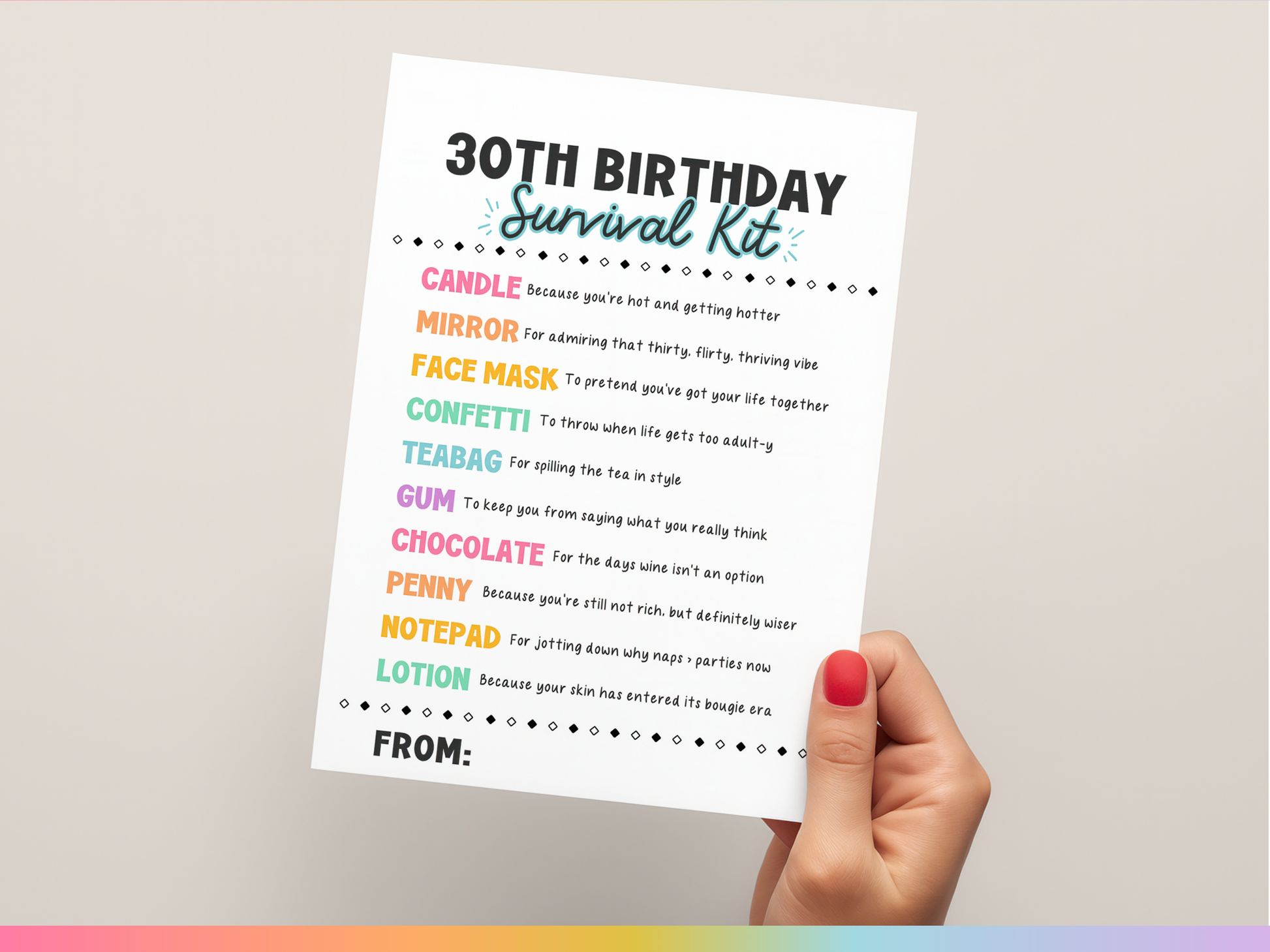 Celebrate the big 3-0 with a laugh! This sassy ππππ ππππππππ ππππππππ πππ πππ is a hilarious way to kick off a new decade. Just print, trim, and attach to a bag filled with small goodies. It's perfect for milestone birthday parties and as a funny gag gift for friends or coworkers!