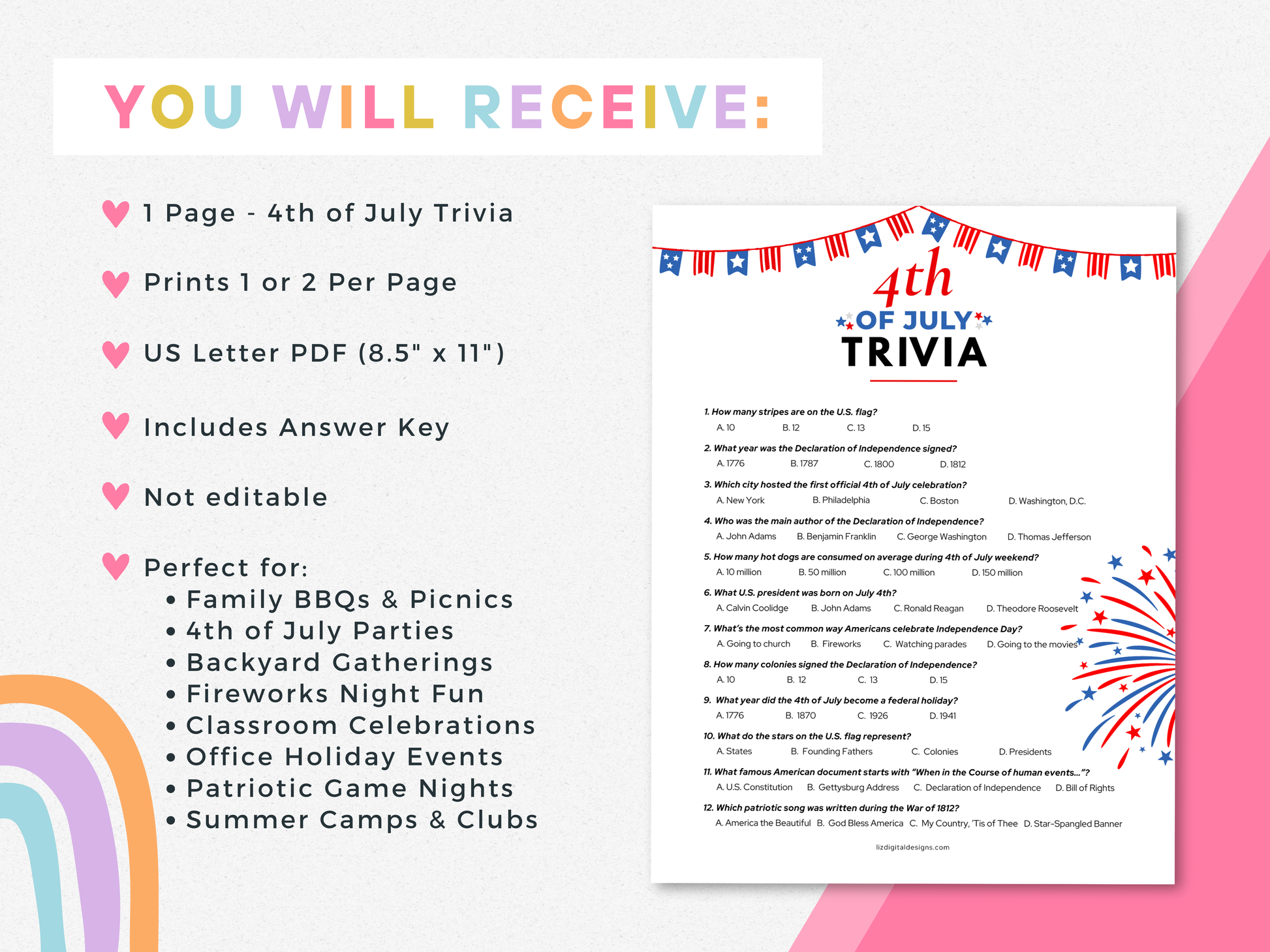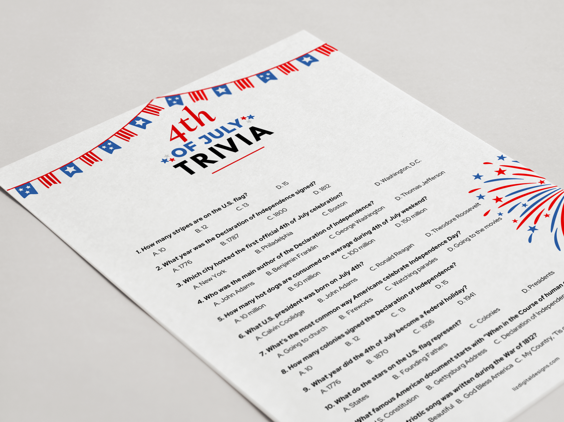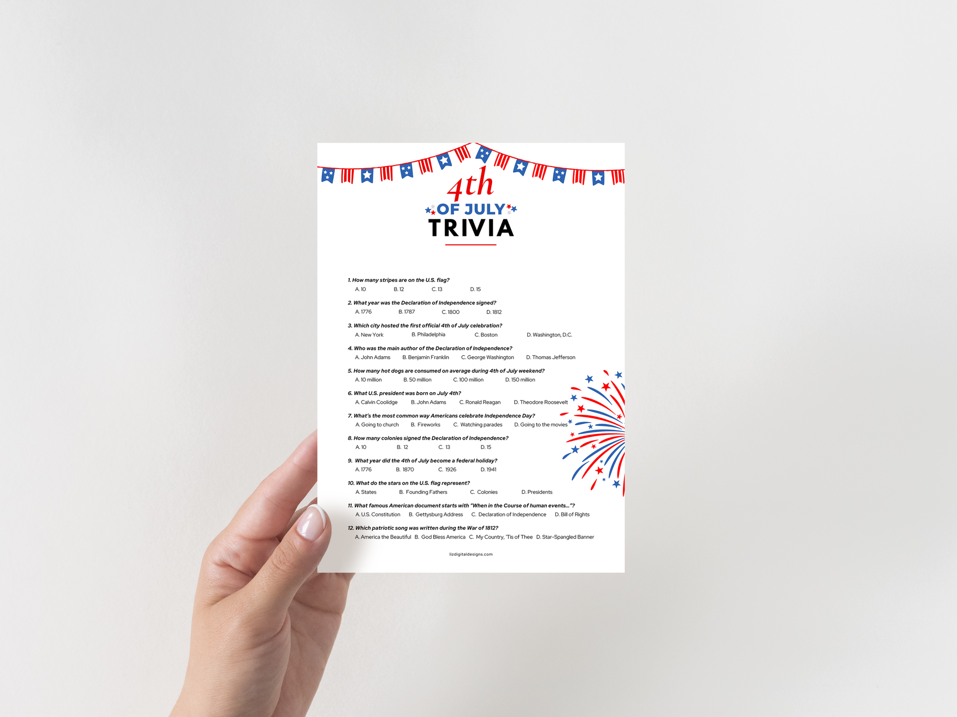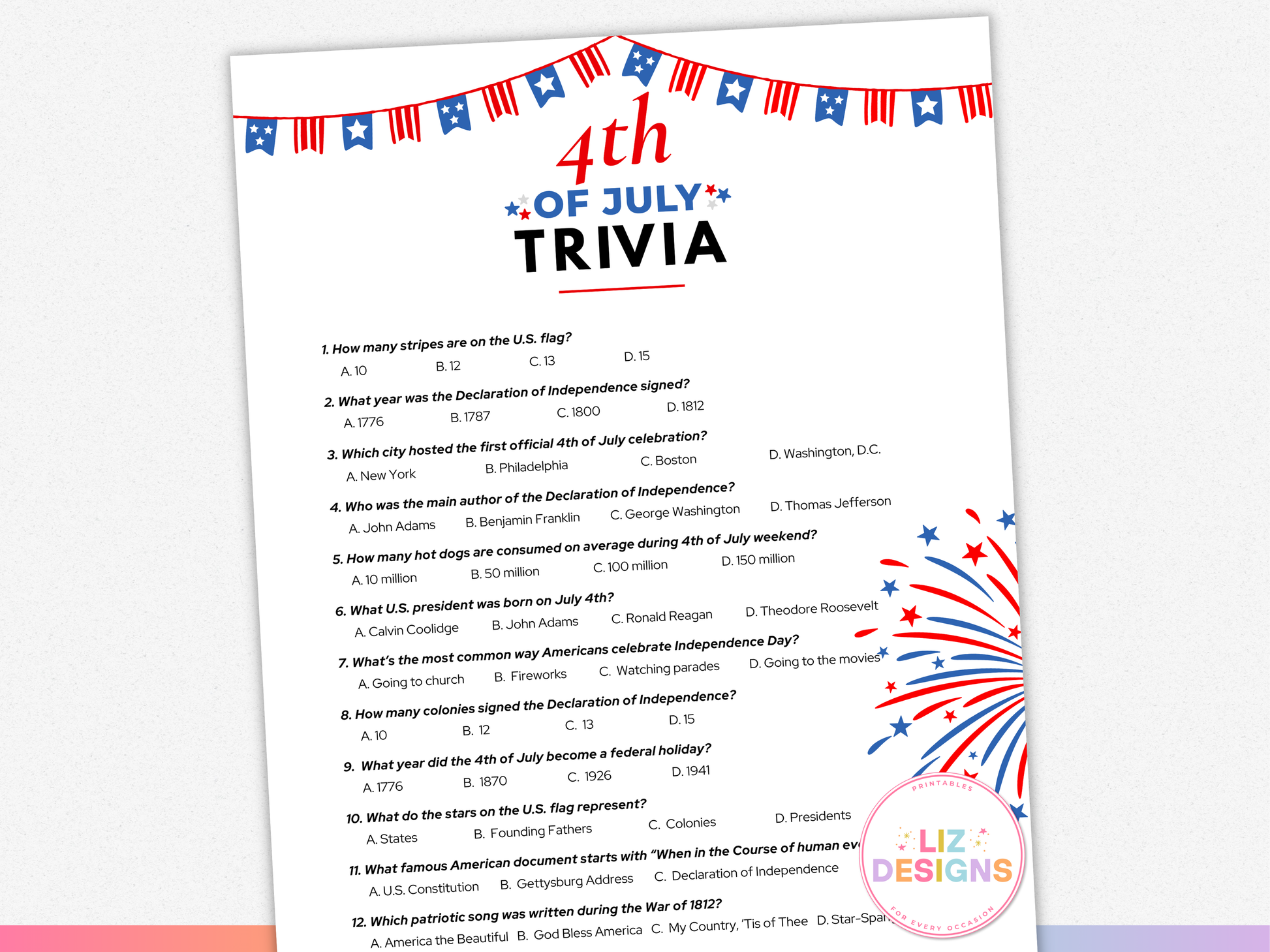 π 4th of July Trivia Game β 12 multiple choice questions