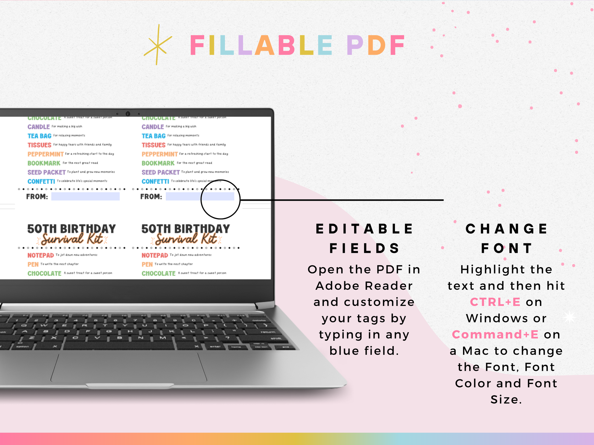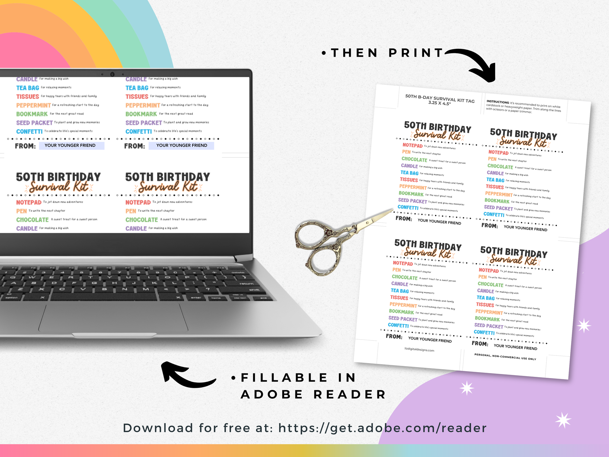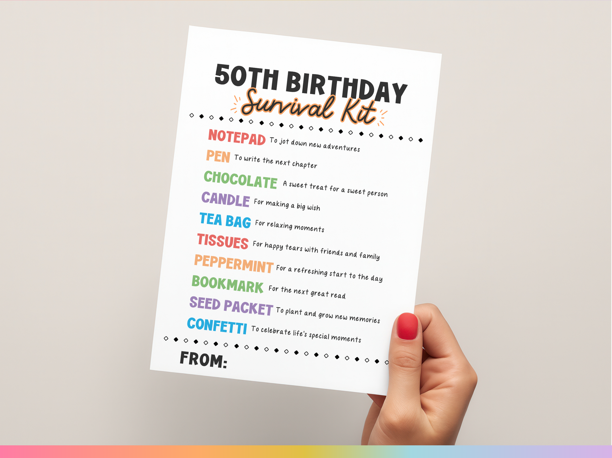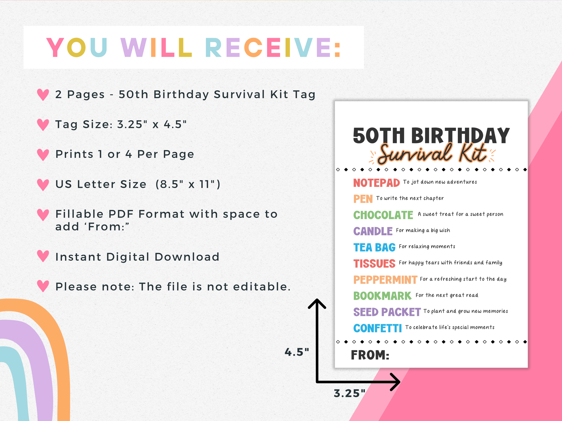 Celebrate the big 5-0 with this thoughtful ππππ ππππππππ ππππππππ πππ πππ. A perfect milestone birthday gift for friends, family, or coworkers, this printable gift tag label makes it easy to create a unique and memorable birthday present. Simply attach to a bag of small goodies for a creative, affordable, and heartfelt 50th birthday gift or party favor!