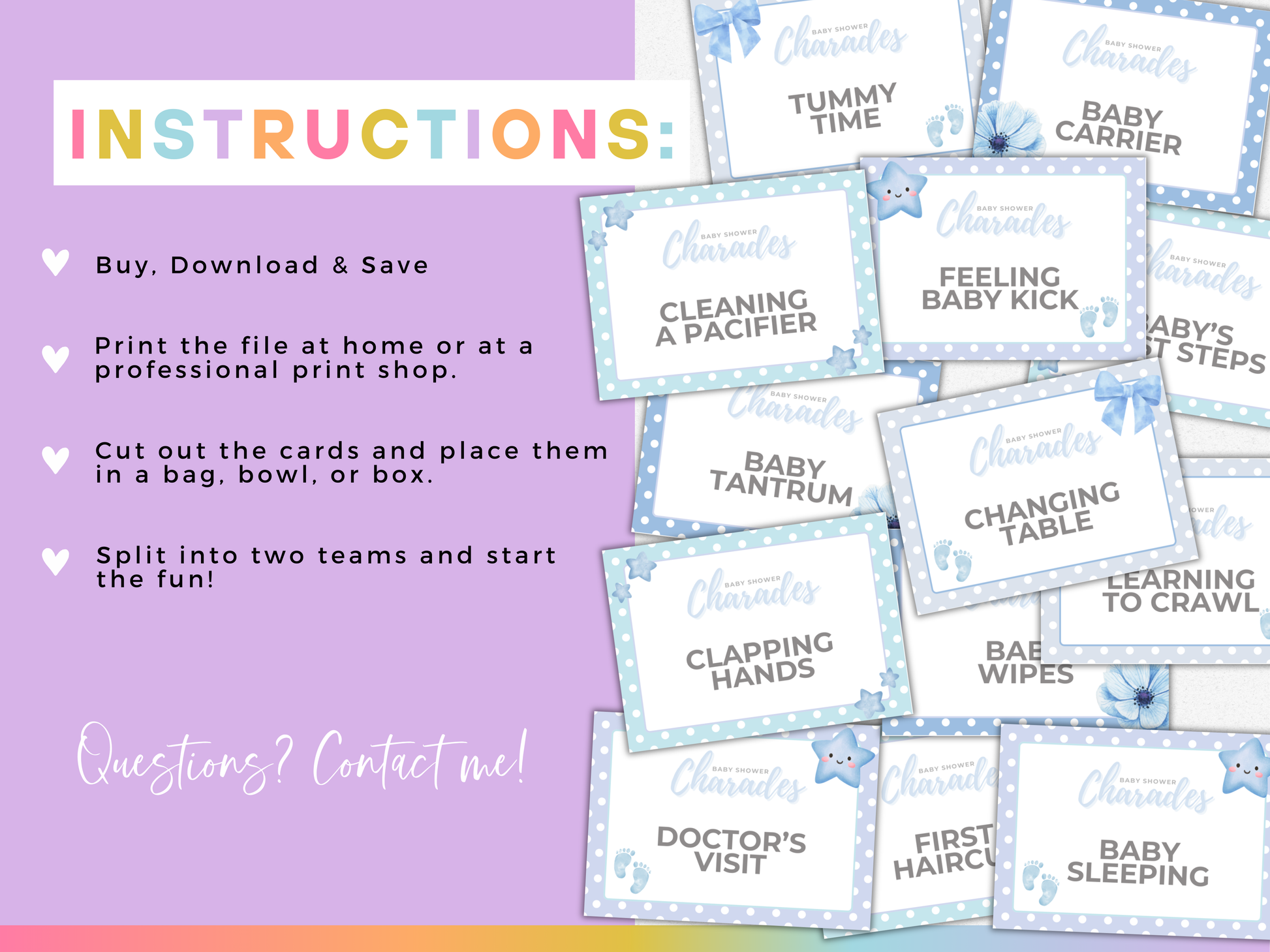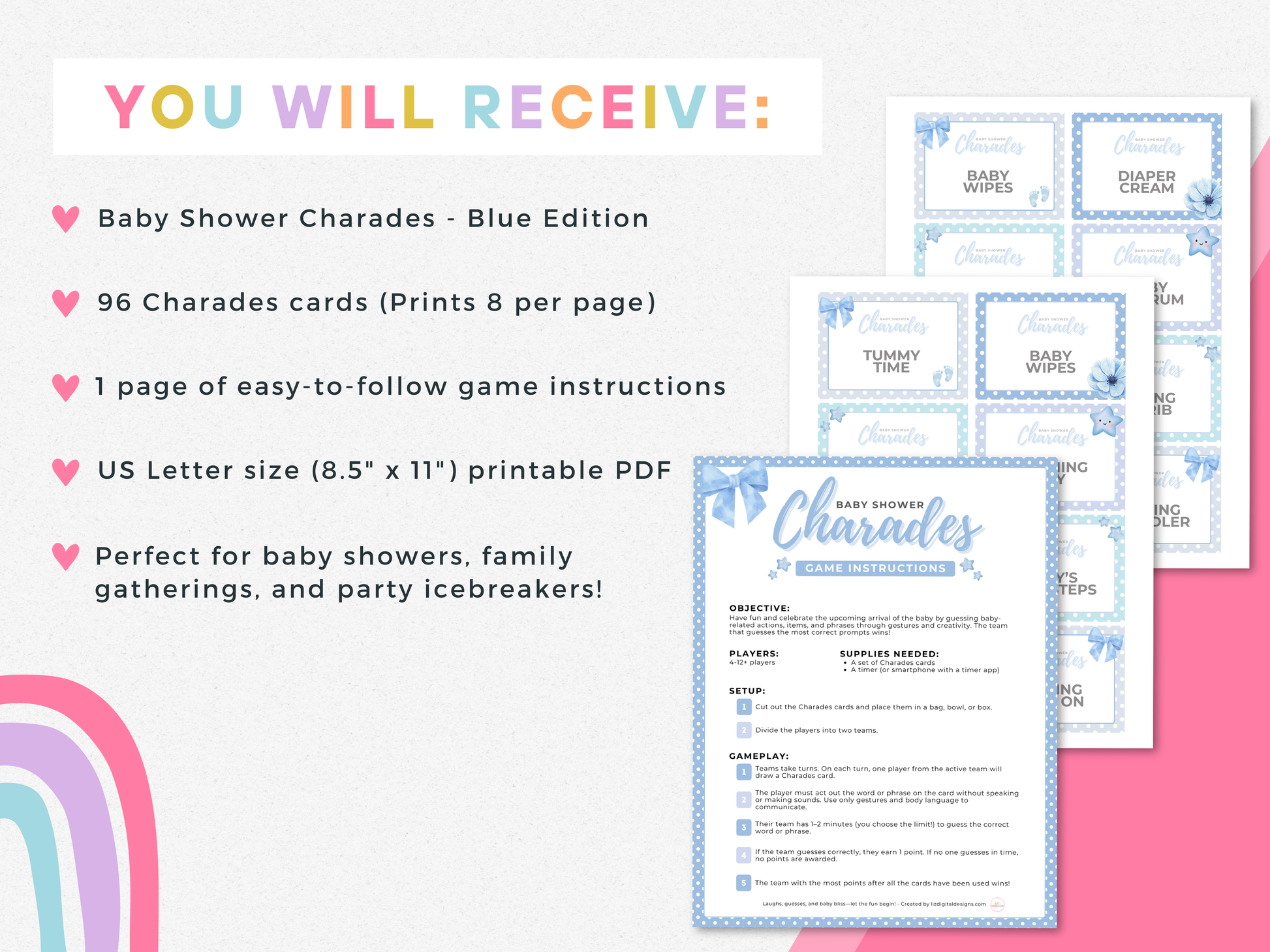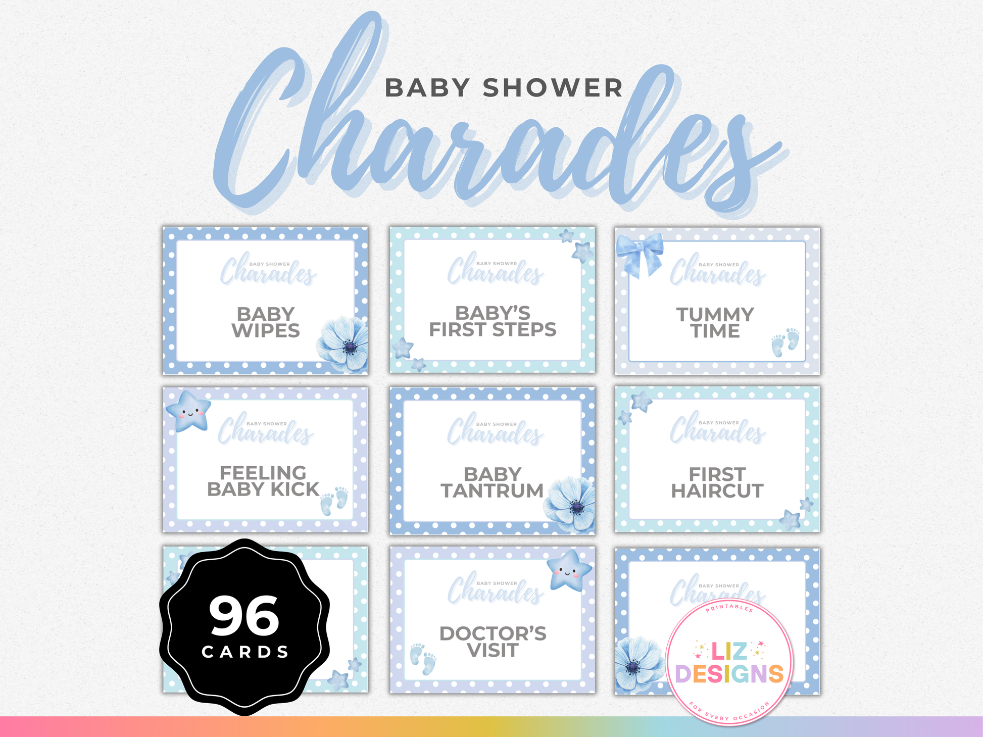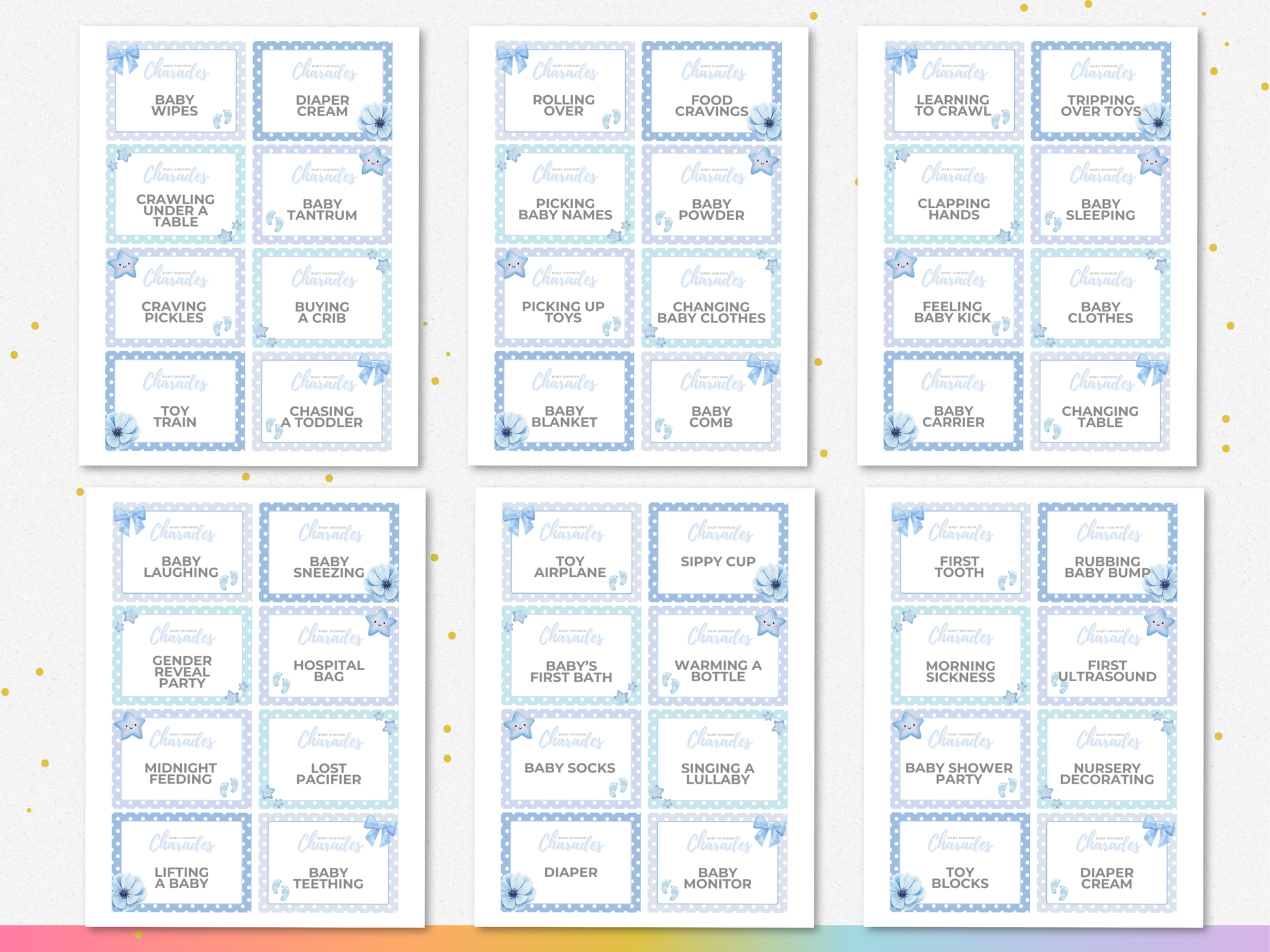 π 96 unique blue-themed baby charades cards (prints 8 per page)