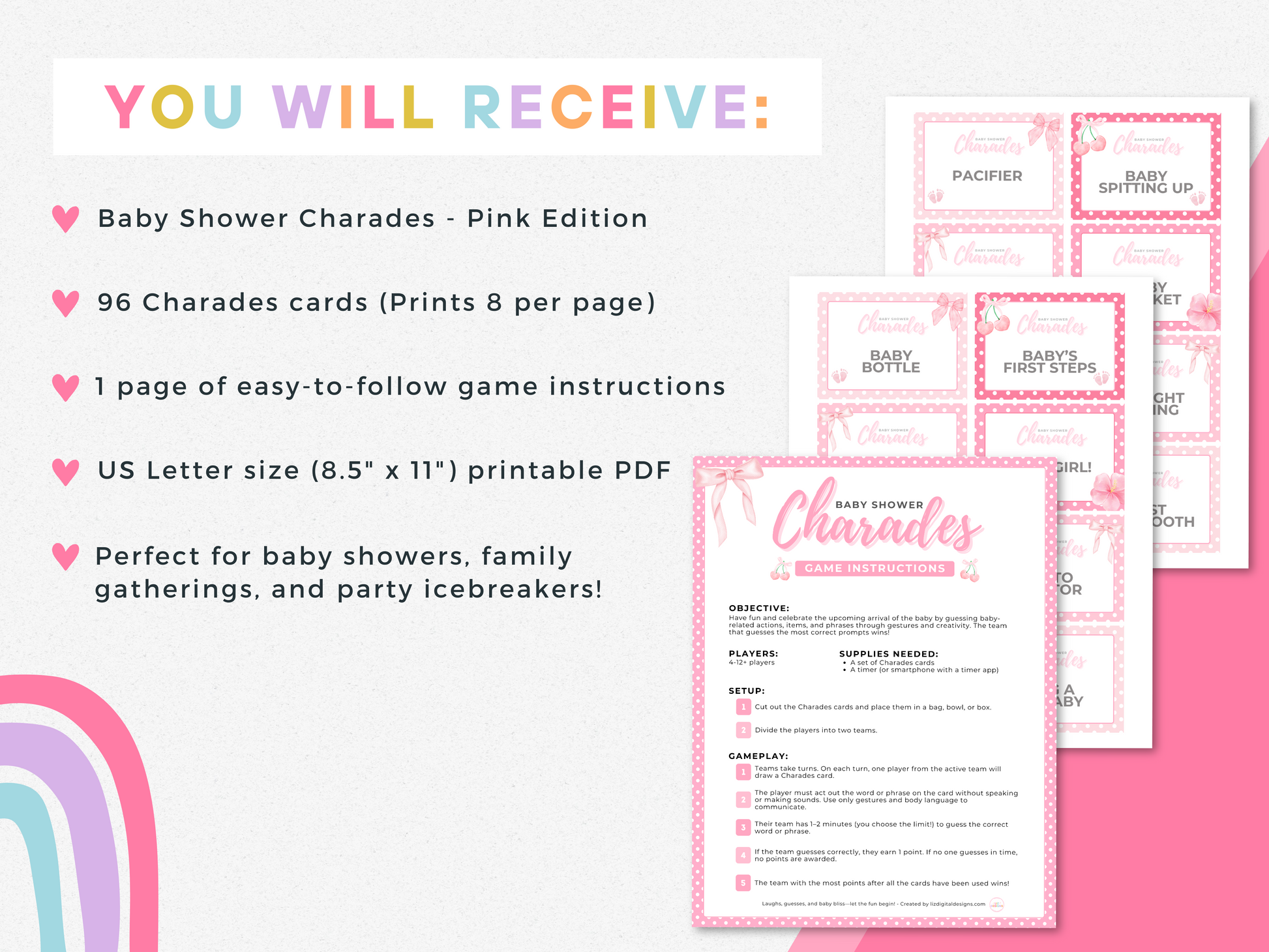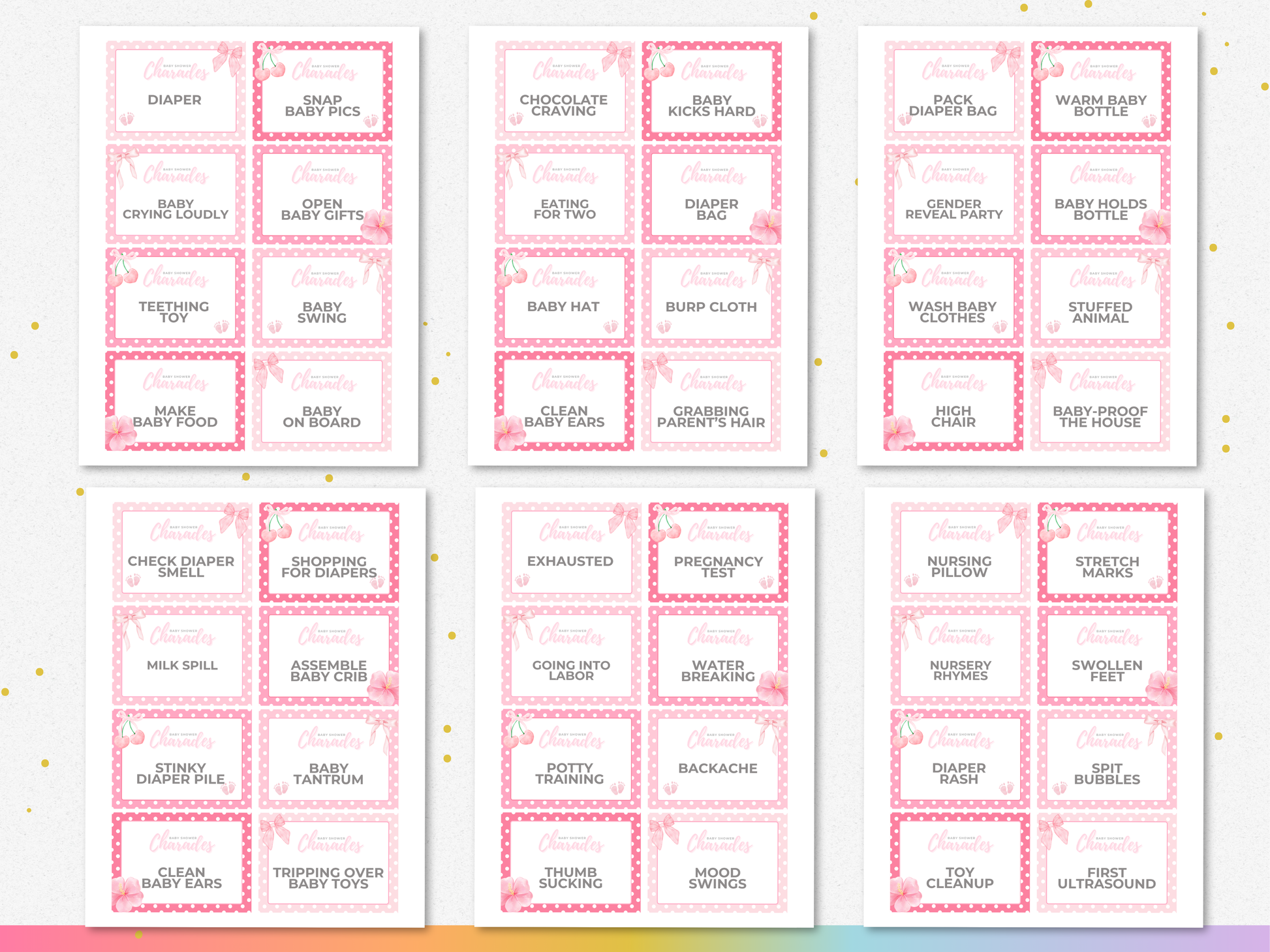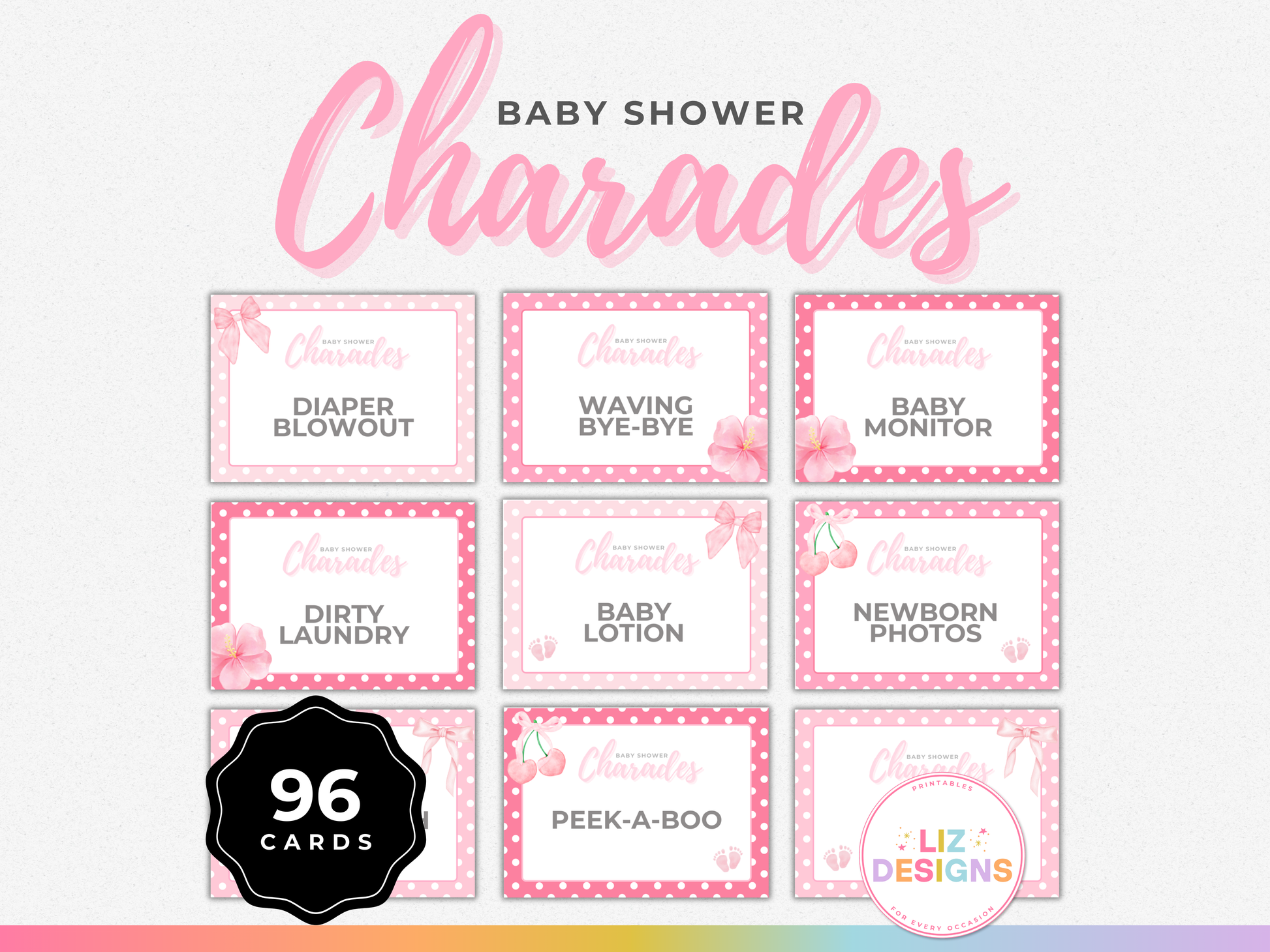 π 96 unique pink-themed baby charades cards (prints 8 per page)