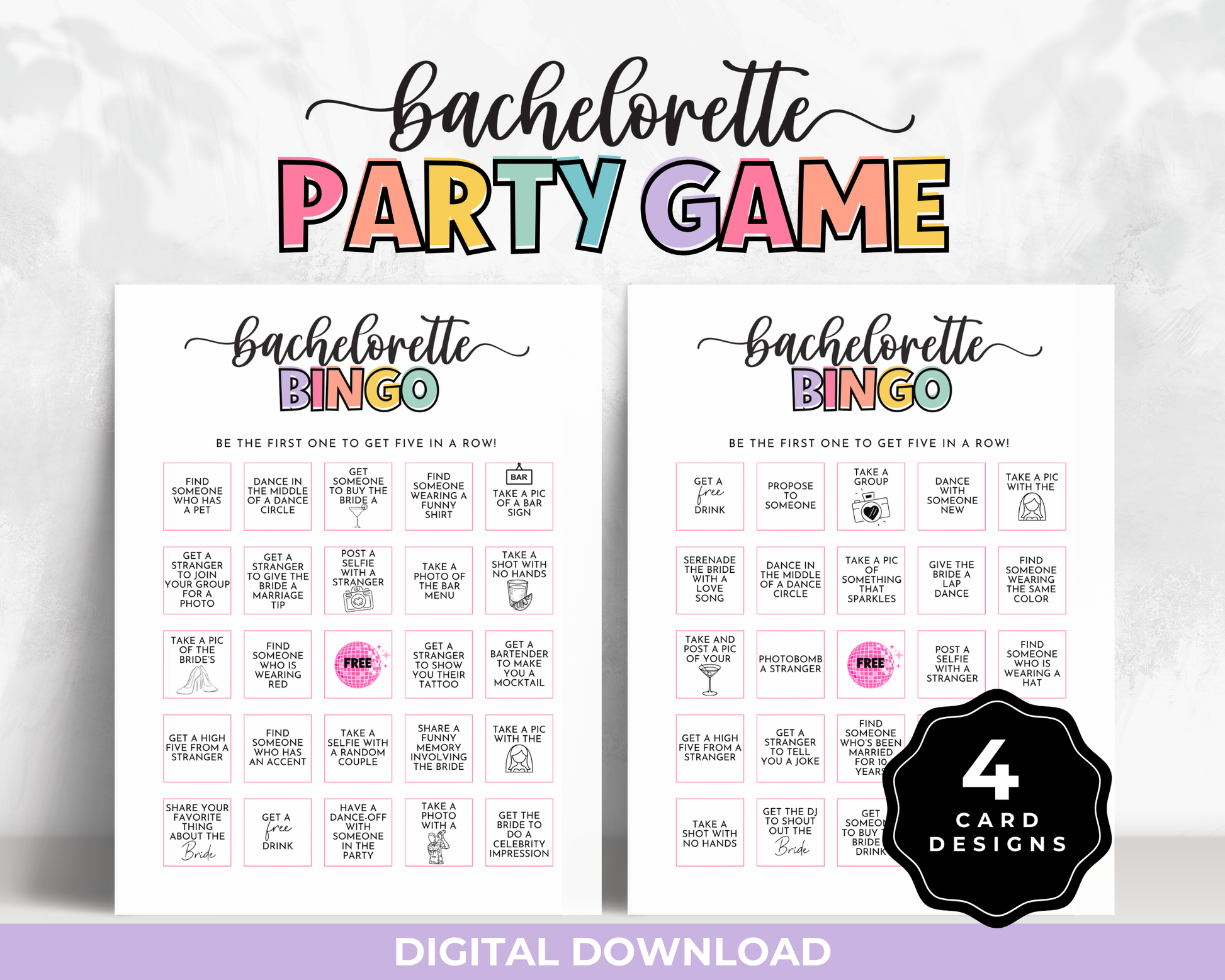 Add some extra fun to your bachelorette party with the ππππππππππππ πππππ ππππ! Perfect for a night out, this game includes 4 stylish designs of printable bingo cards that will have your guests laughing, bonding, and making unforgettable memories. Each card features prompts for a bachelorette night out - from taking selfies with strangers to dancing in the middle of a dance circle!