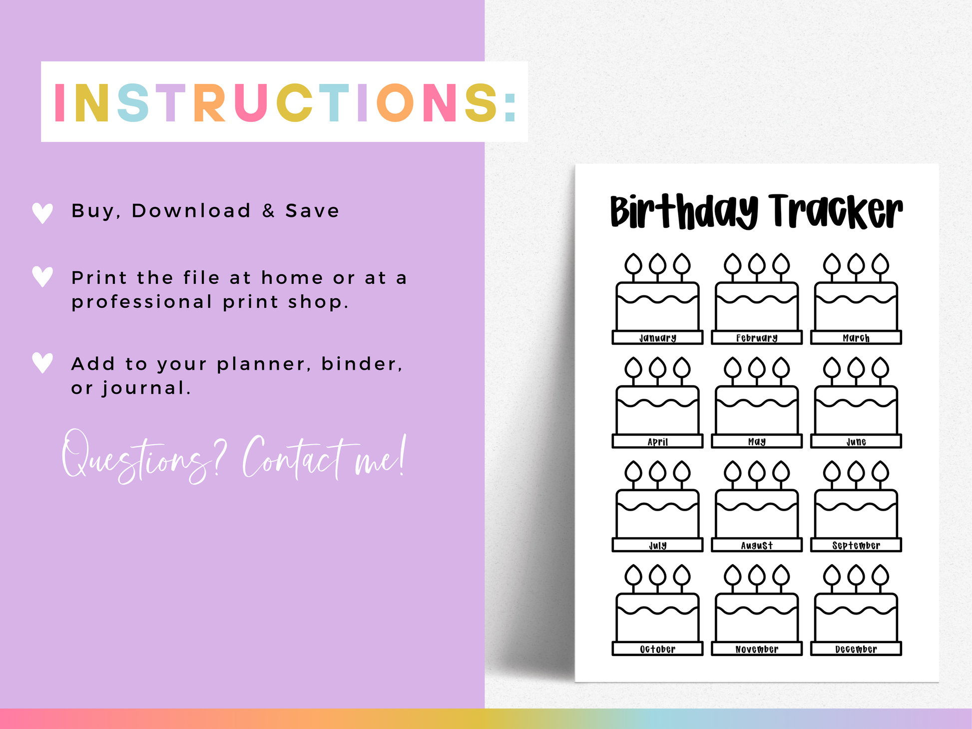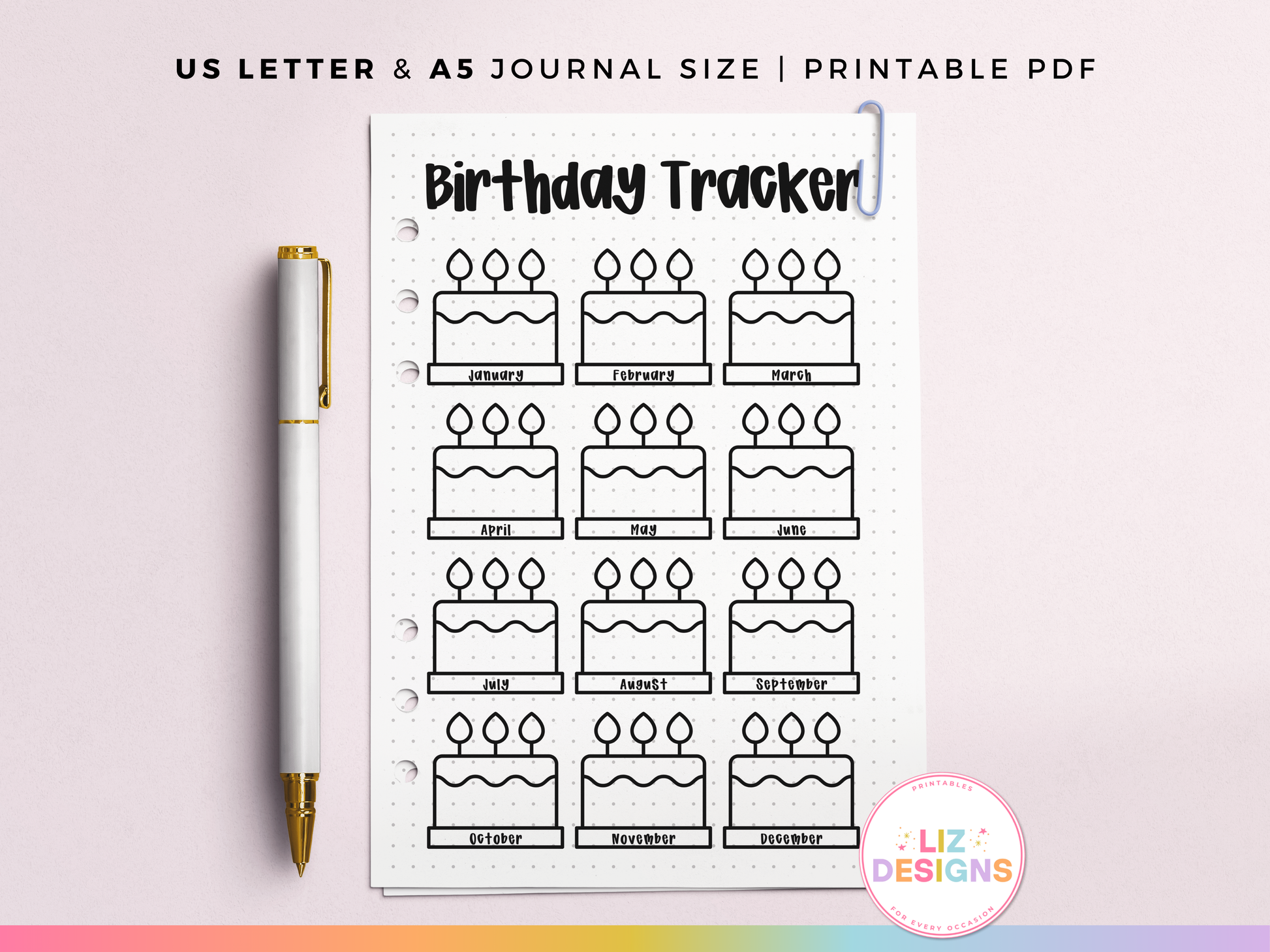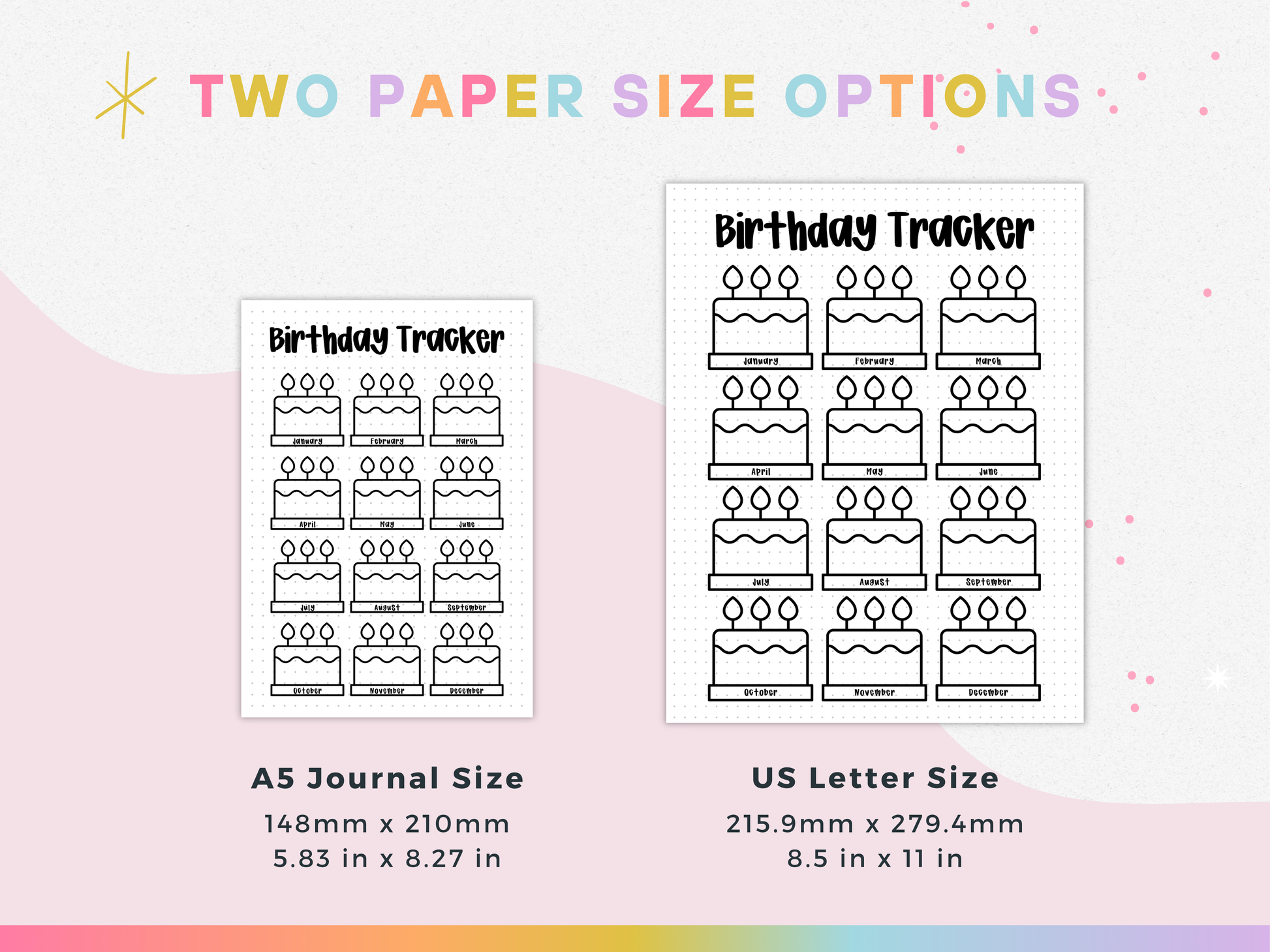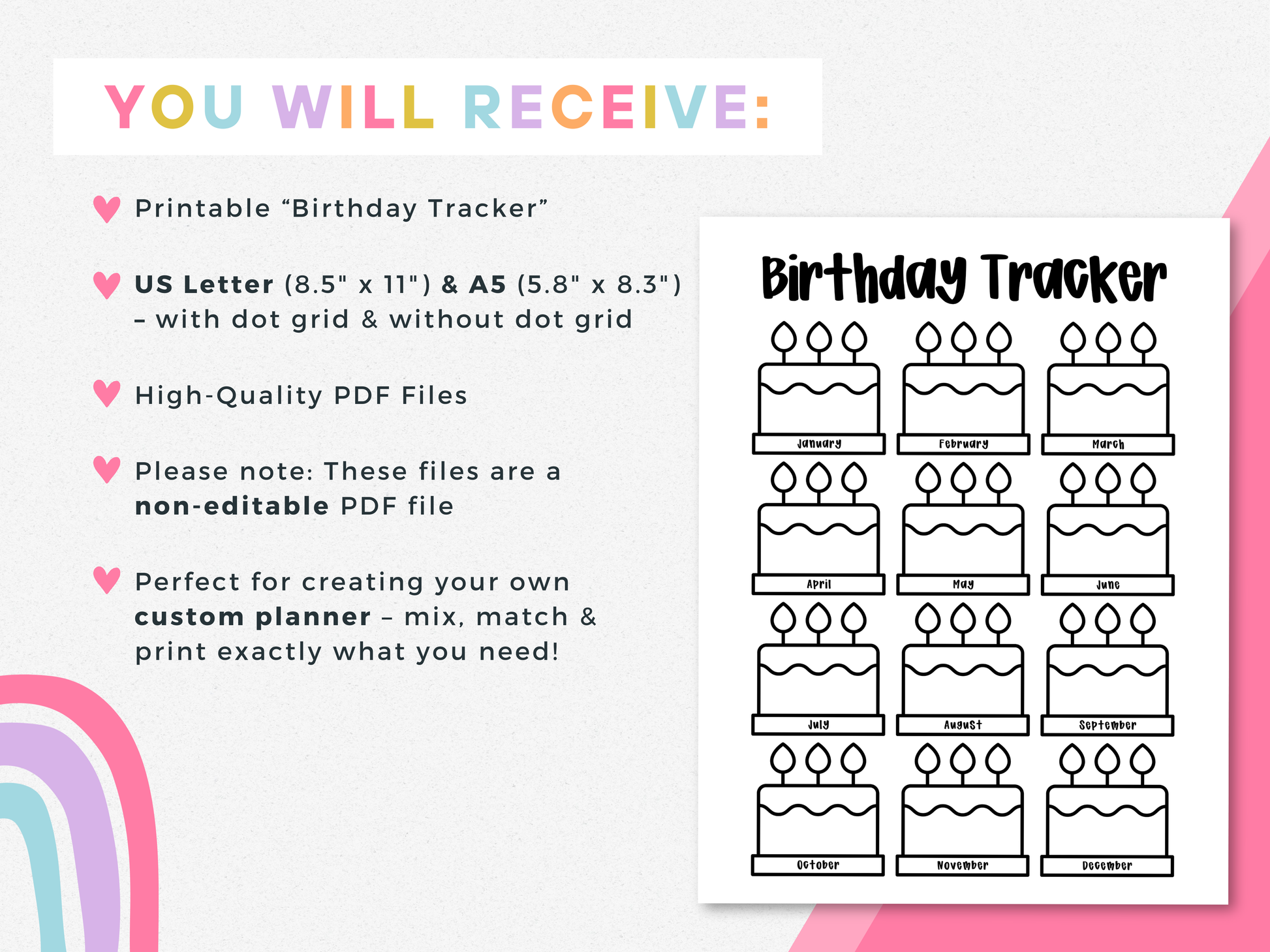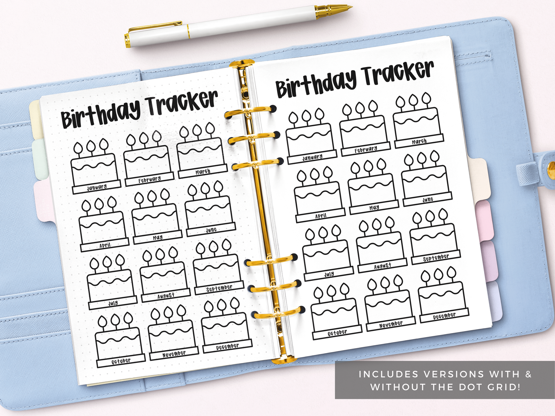Whether youβre tracking birthdays for family, friends, or your entire class, this birthday organizer makes it easy to see all important dates at a glance. Itβs reusable year after year and comes in both US Letter and A5 planner insert sizes with dot grid and without dot grid versions for ultimate flexibility.