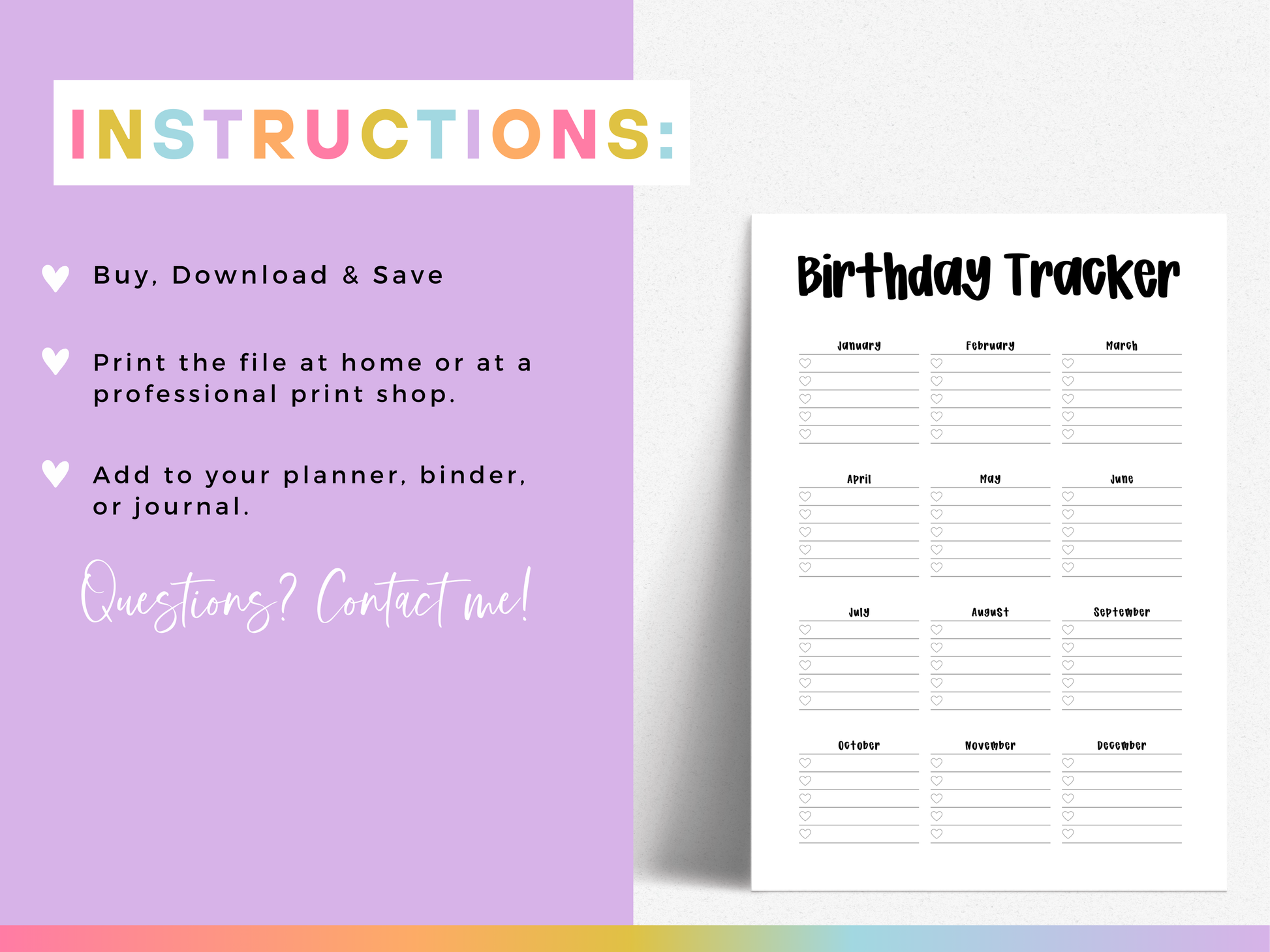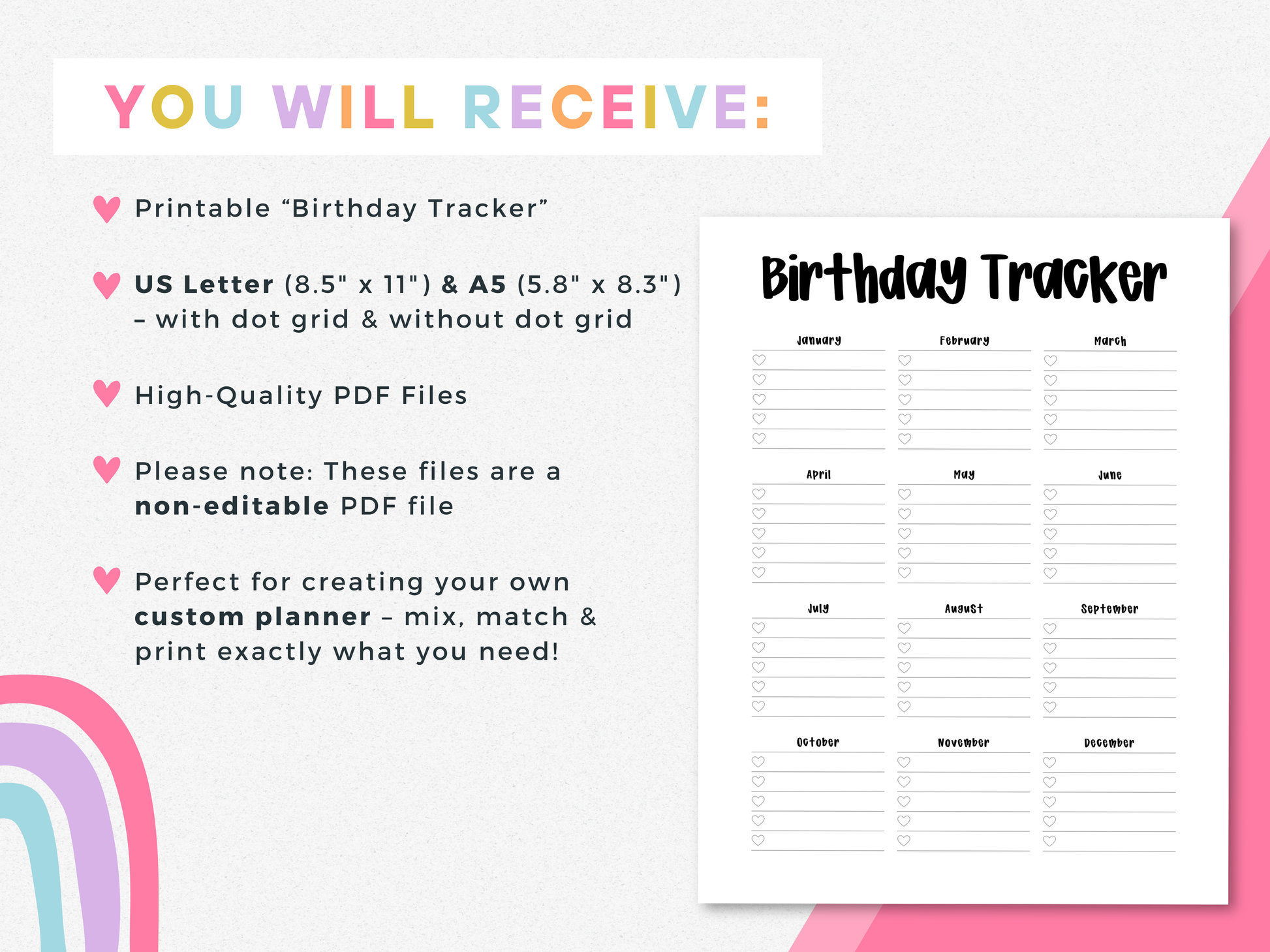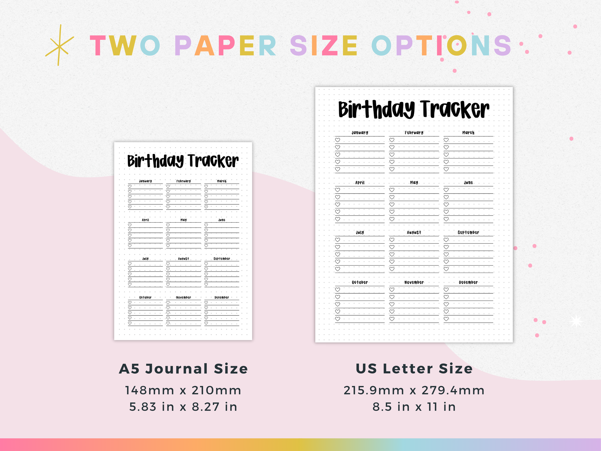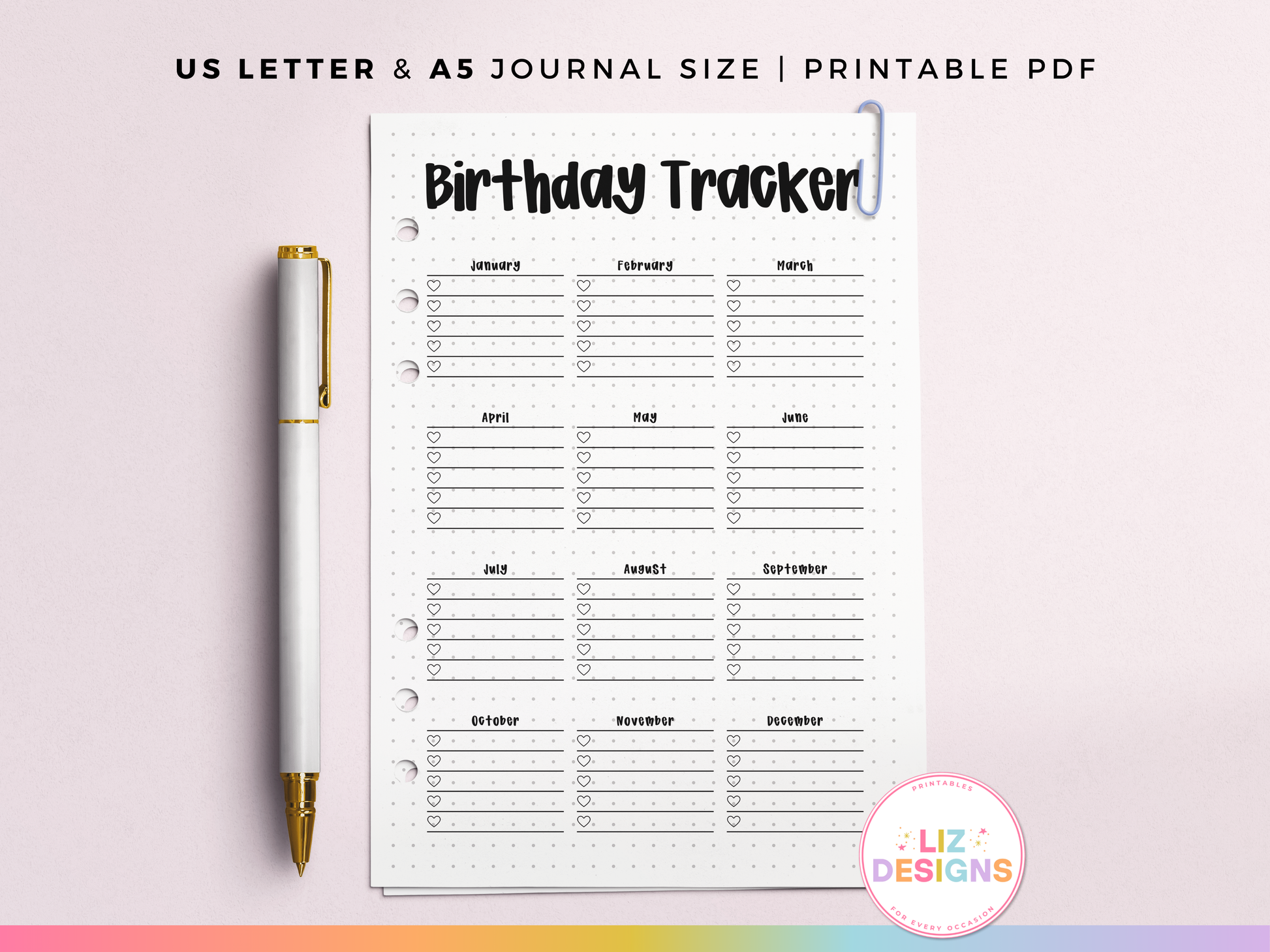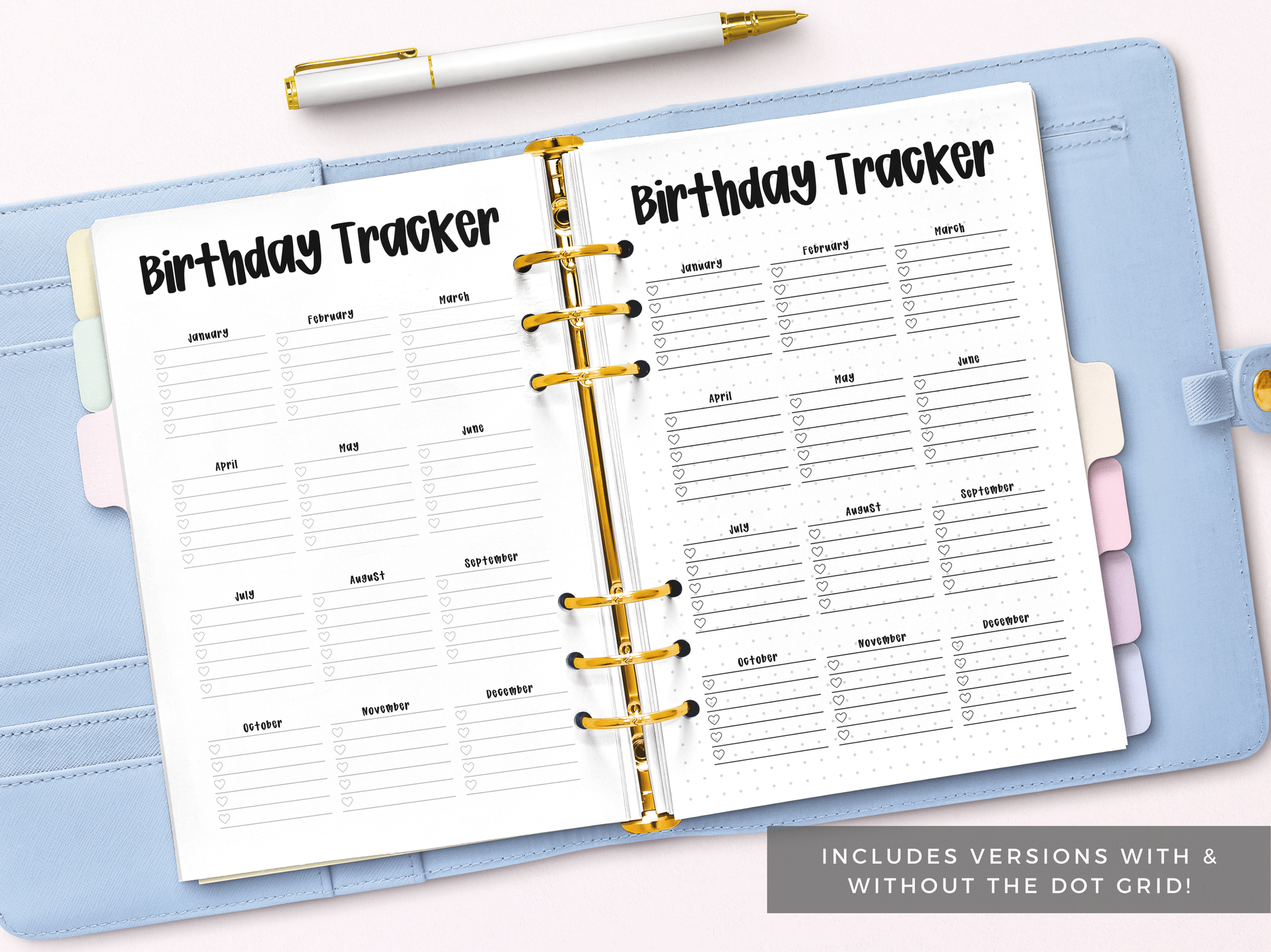 With both US Letter and A5 planner insert sizes included, plus versions with dot grid and without dot grid, you can easily customize your tracker to match your planning style. Use it as a birthday organizer at home, in the office, or as part of your classroom decor to celebrate student birthdays all year long.