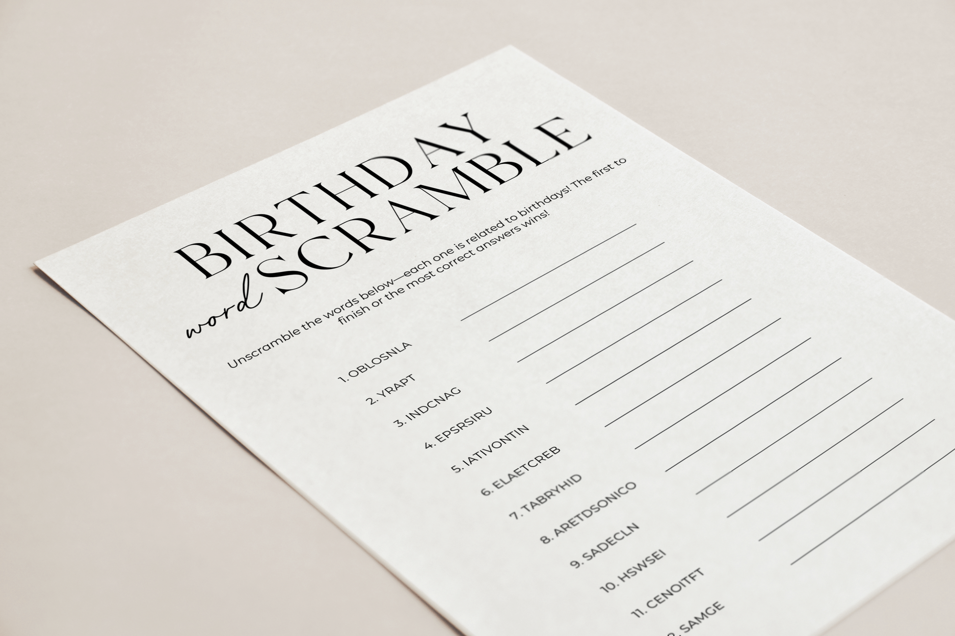 This ππππππππ ππππ ππππππππ is a fantastic game to challenge guests of all ages! Unscramble 12 birthday-related words as fast as possibleβthe first person to finish or the one with the most correct answers wins!
