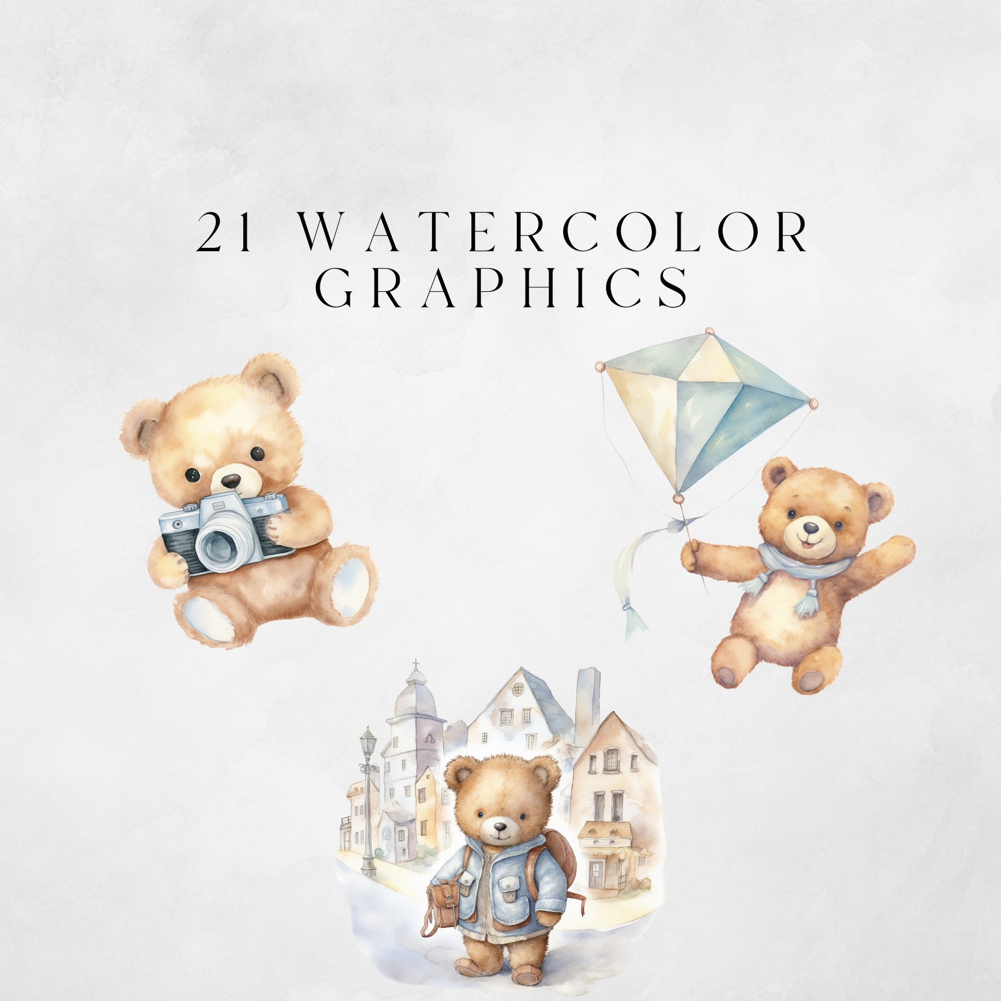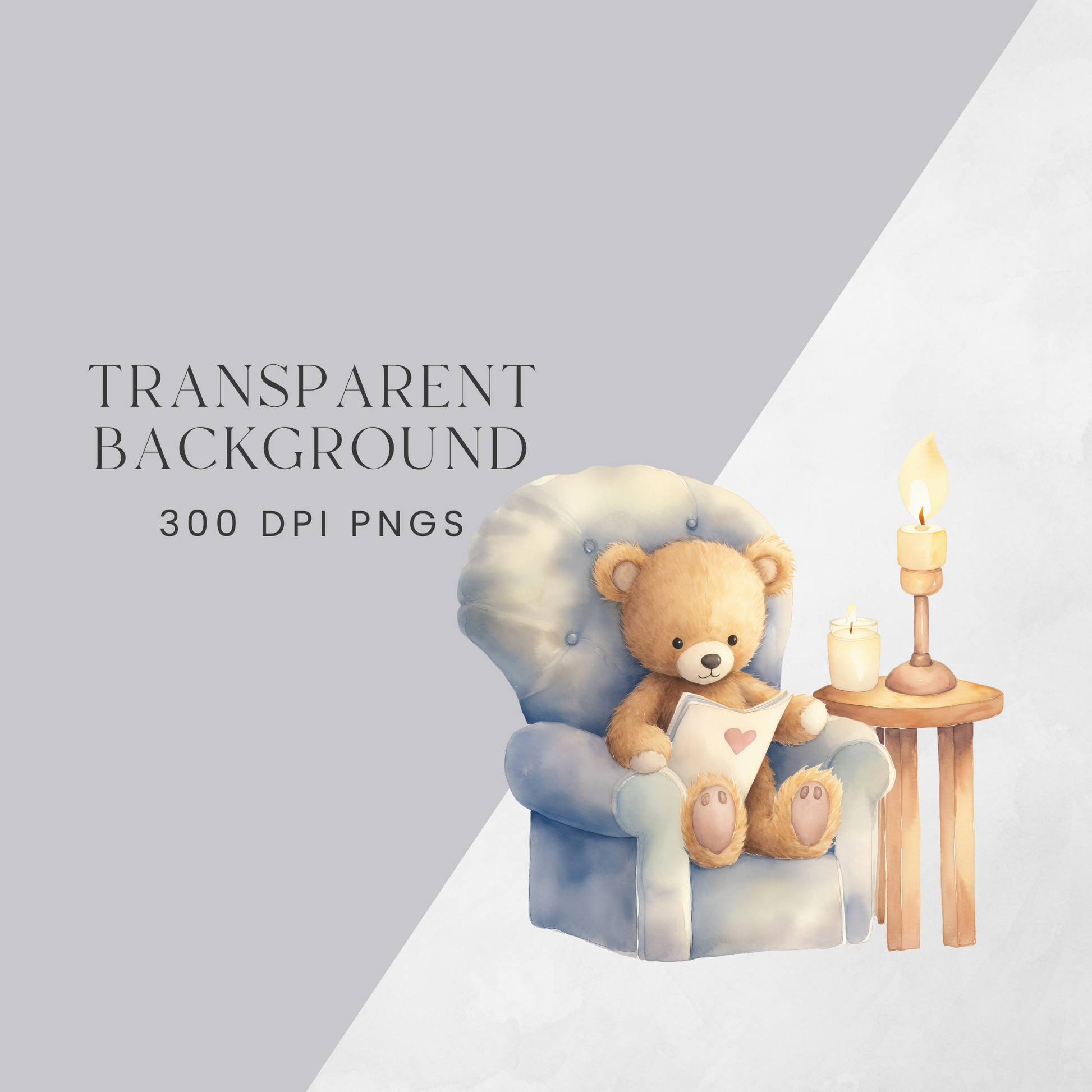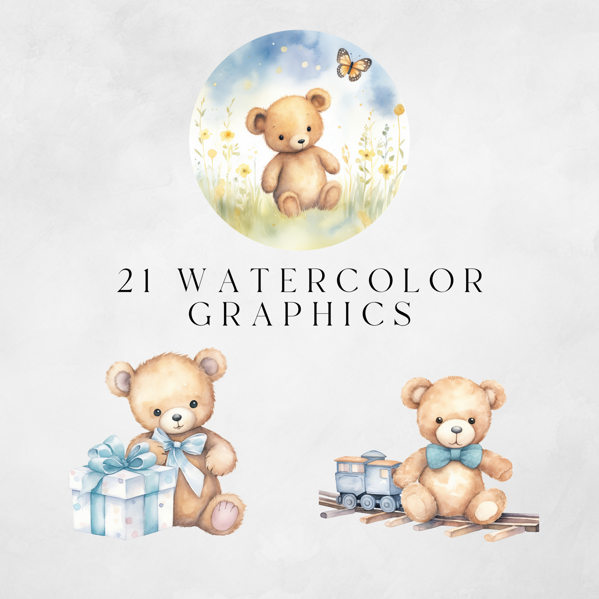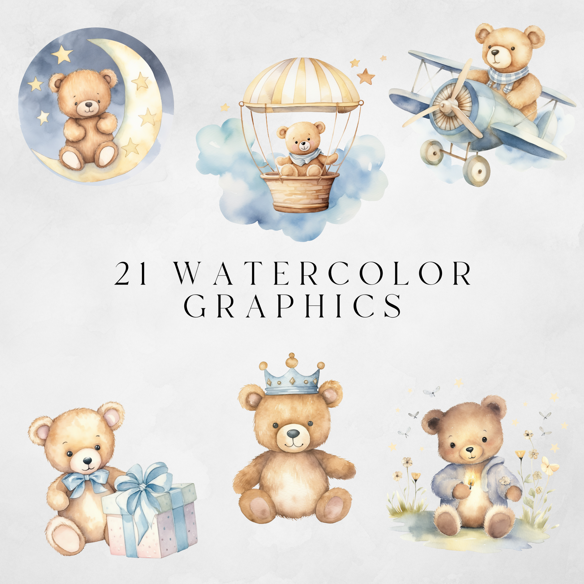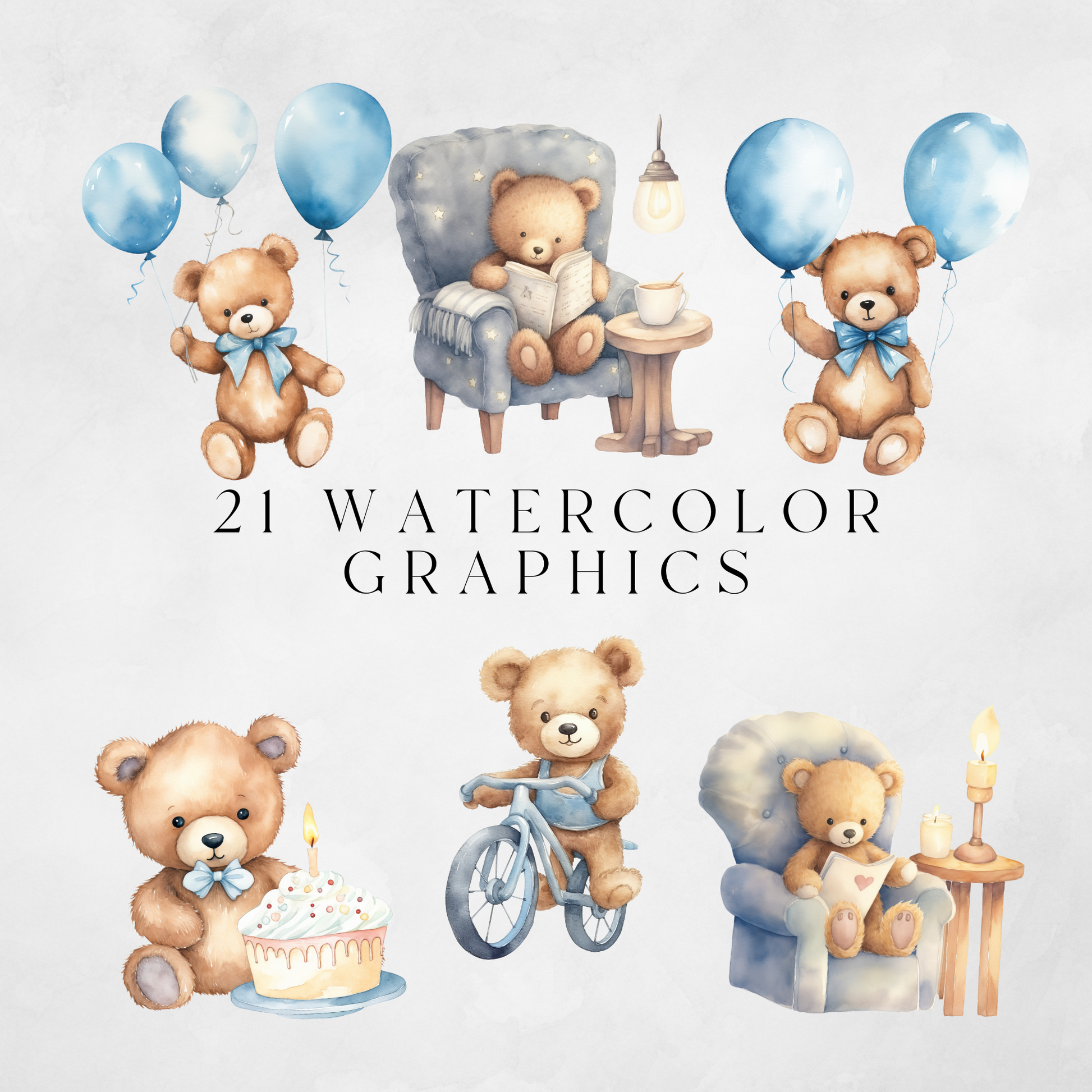 This adorable Blue Baby Bear clipart set is perfect for adding a touch of sweetness to your projects. Whether you're planning a baby shower, decorating a nursery, or creating whimsical designs, these watercolor illustrations of cute teddy bears in various poses and settings are sure to delight!