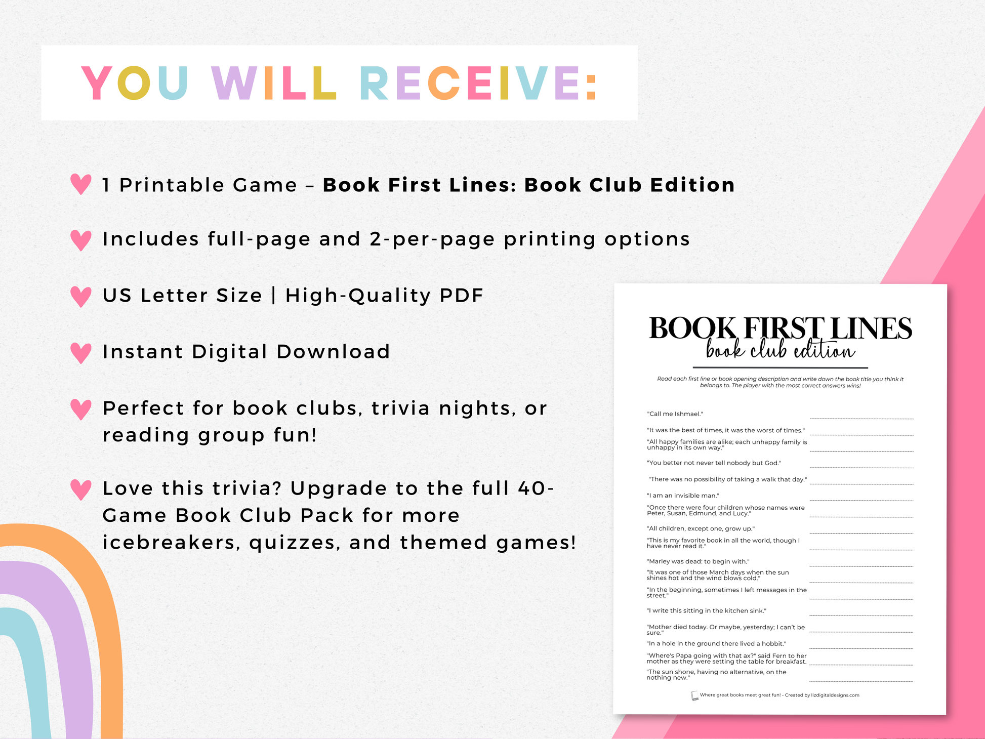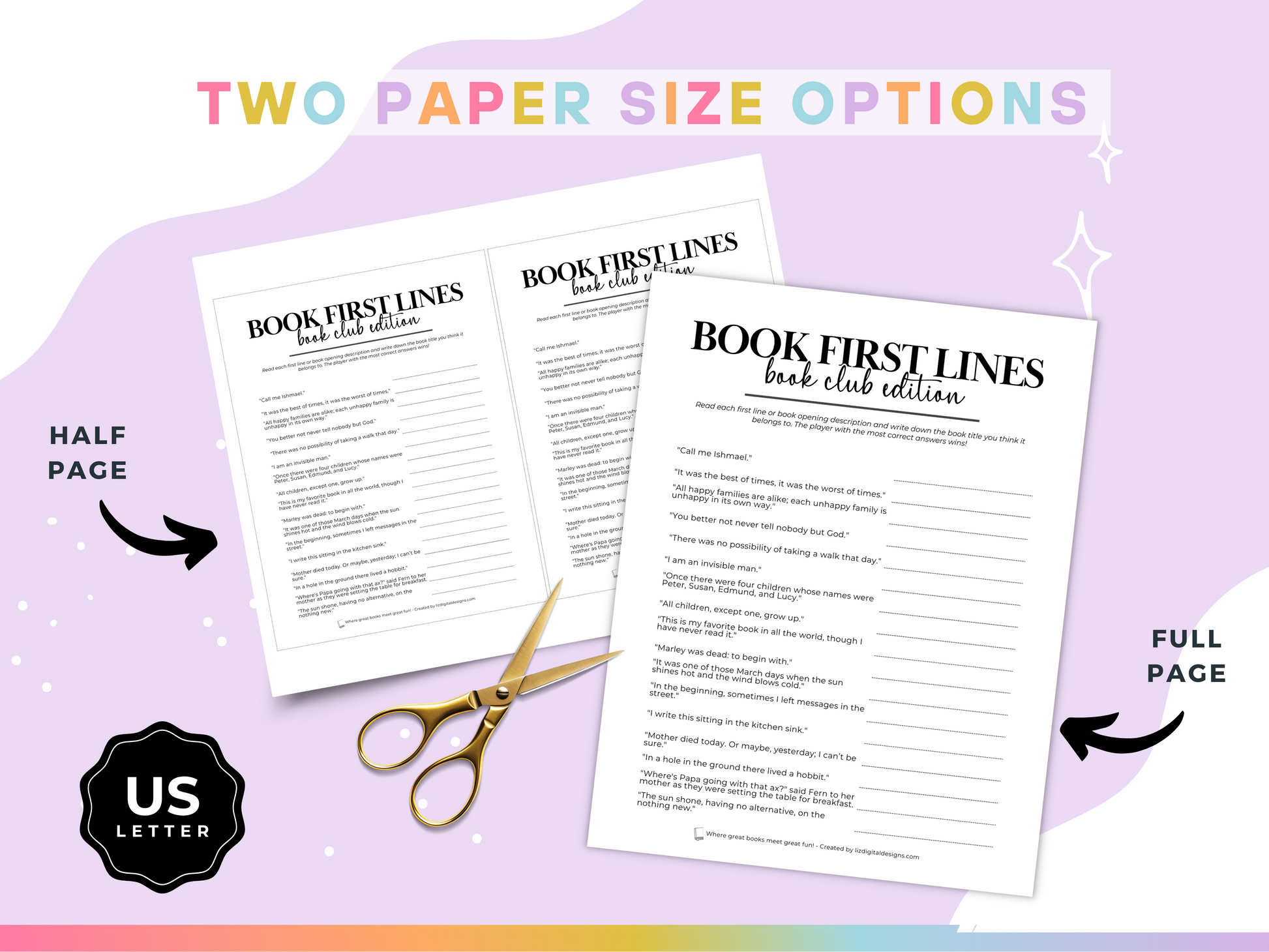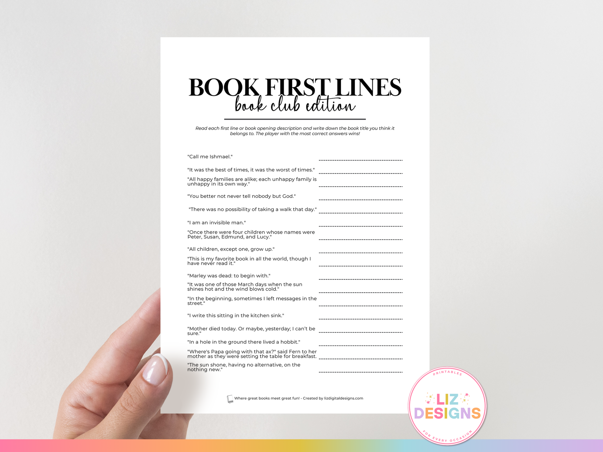 Break the ice and test your literary knowledge with this printable ππππ π ππππ πππππ ππππππ game! From iconic classics to memorable modern reads, players must match each famous opening line to its book title. Itβs the perfect activity for book club meetings, reading groups, trivia nights, or parties with fellow book lovers!