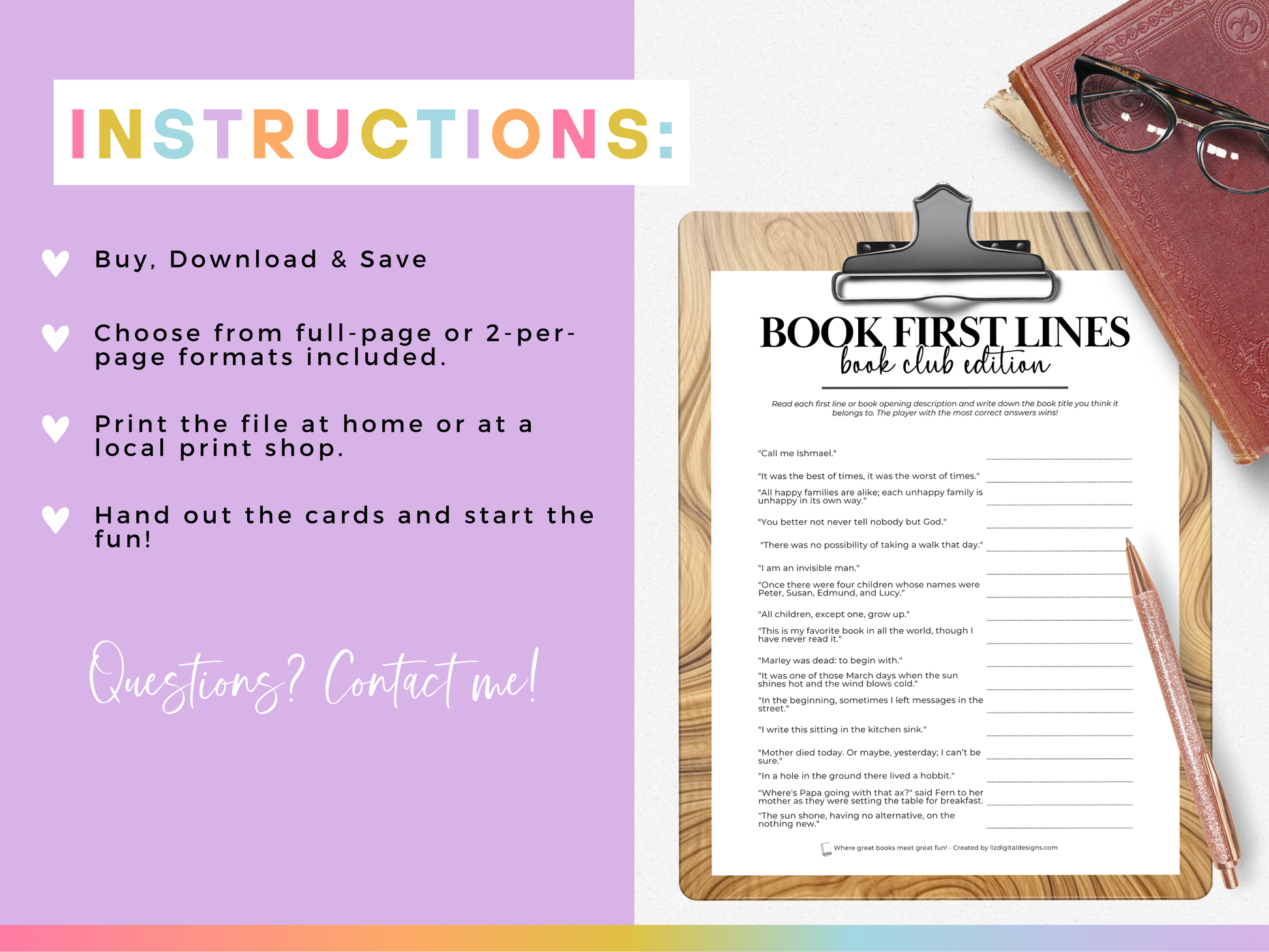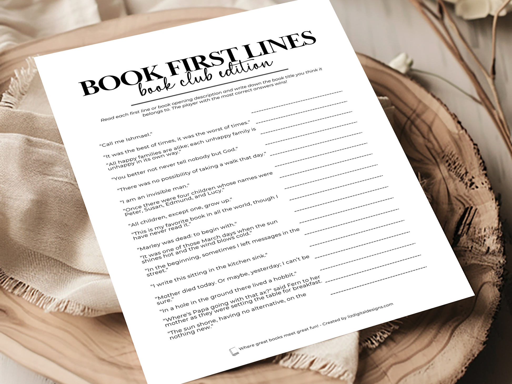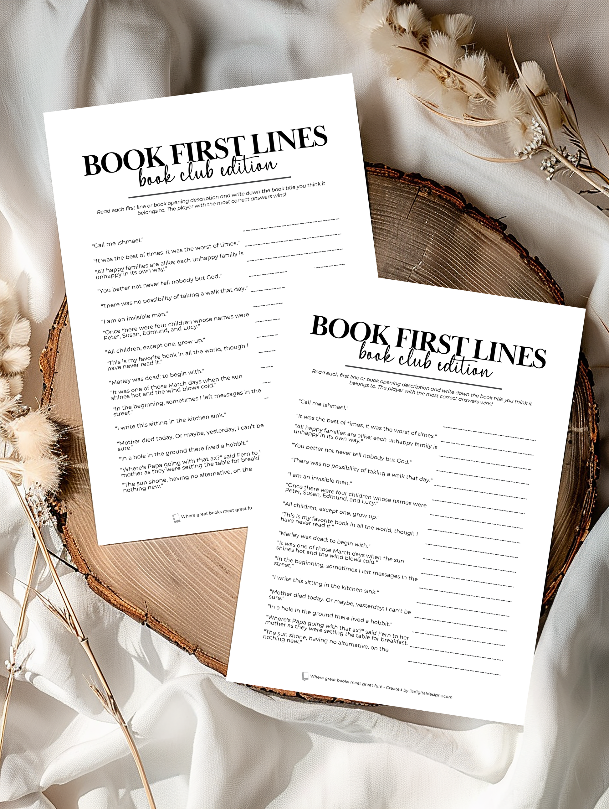 Break the ice and test your literary knowledge with this printable ππππ π ππππ πππππ ππππππ game! From iconic classics to memorable modern reads, players must match each famous opening line to its book title. Itβs the perfect activity for book club meetings, reading groups, trivia nights, or parties with fellow book lovers!