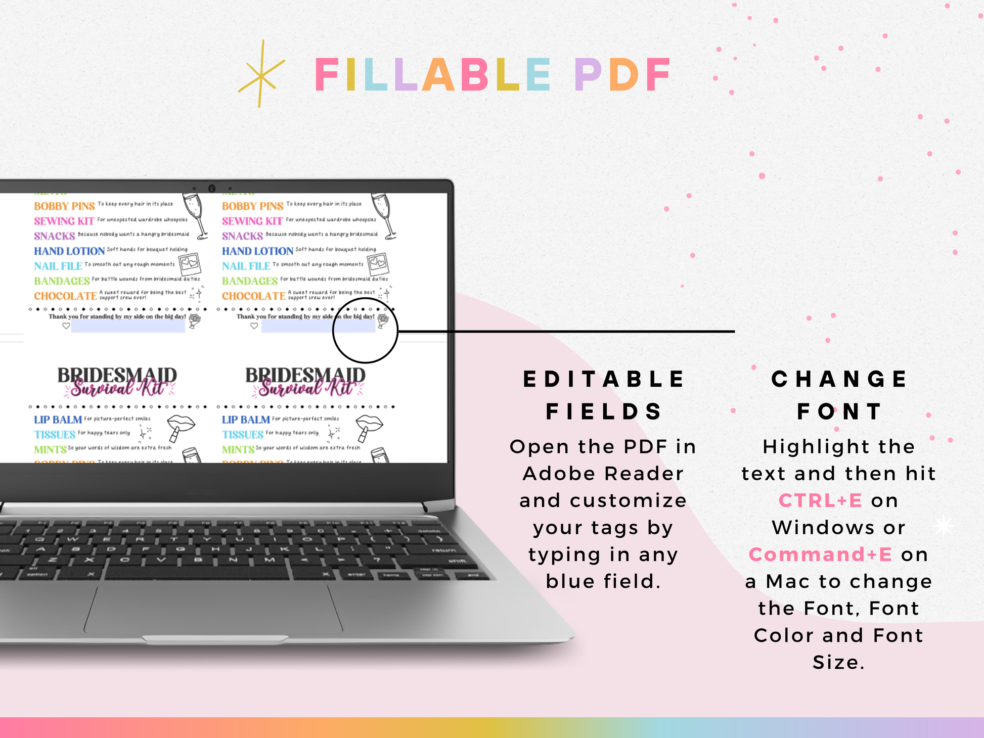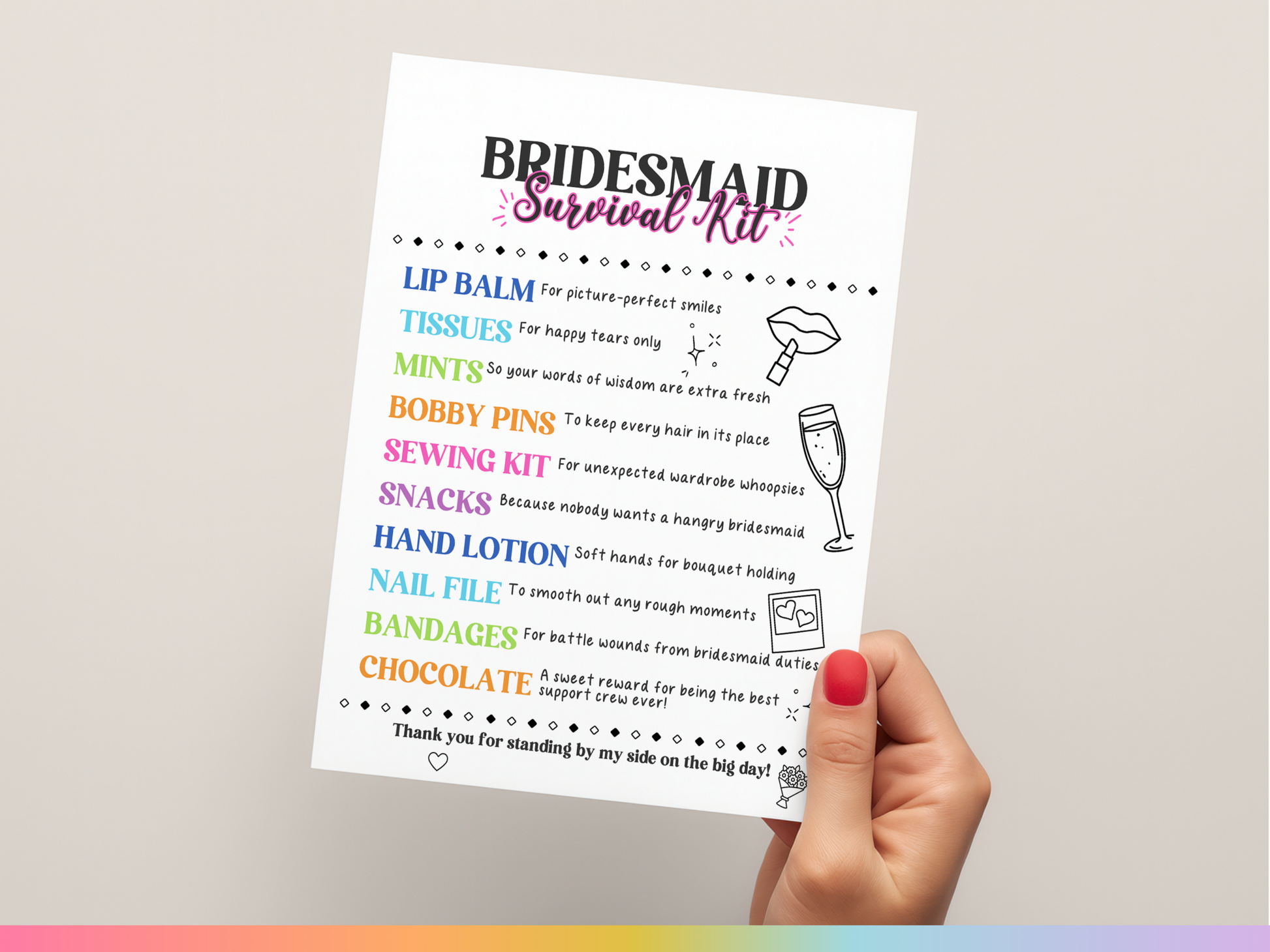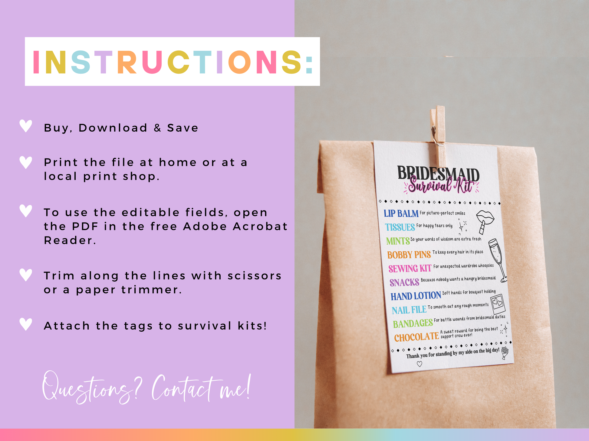 Surviving the big day takes teamwork and a little preparation! This printable ππππππππππ ππππππππ πππ πππ is a must-have for your big day! Attach it to a bag of essentials or goodies to create the ultimate emergency kit for your bridesmaids and maid of honor. Perfect for wedding mornings, bridal showers, or bachelorette weekends!