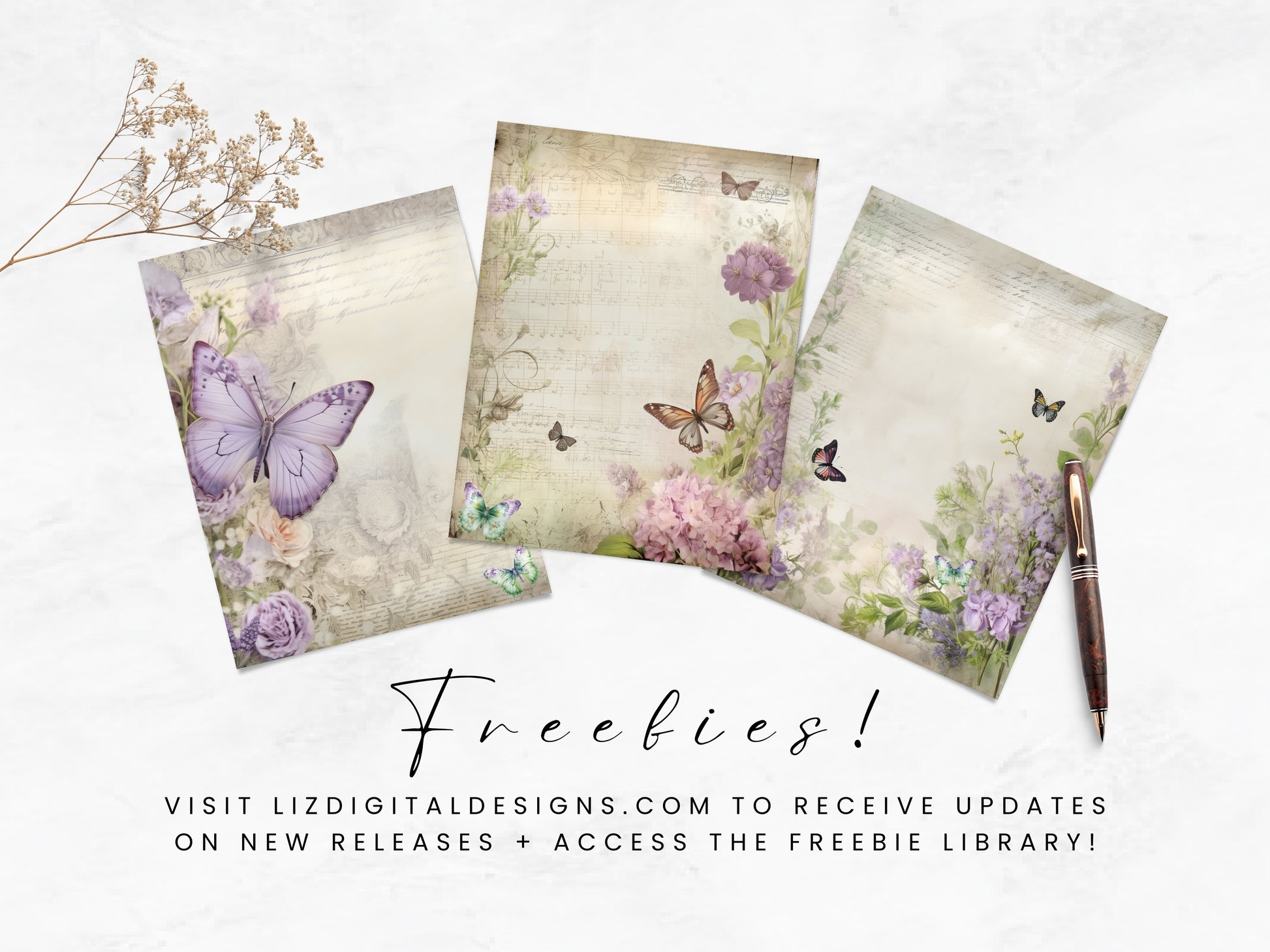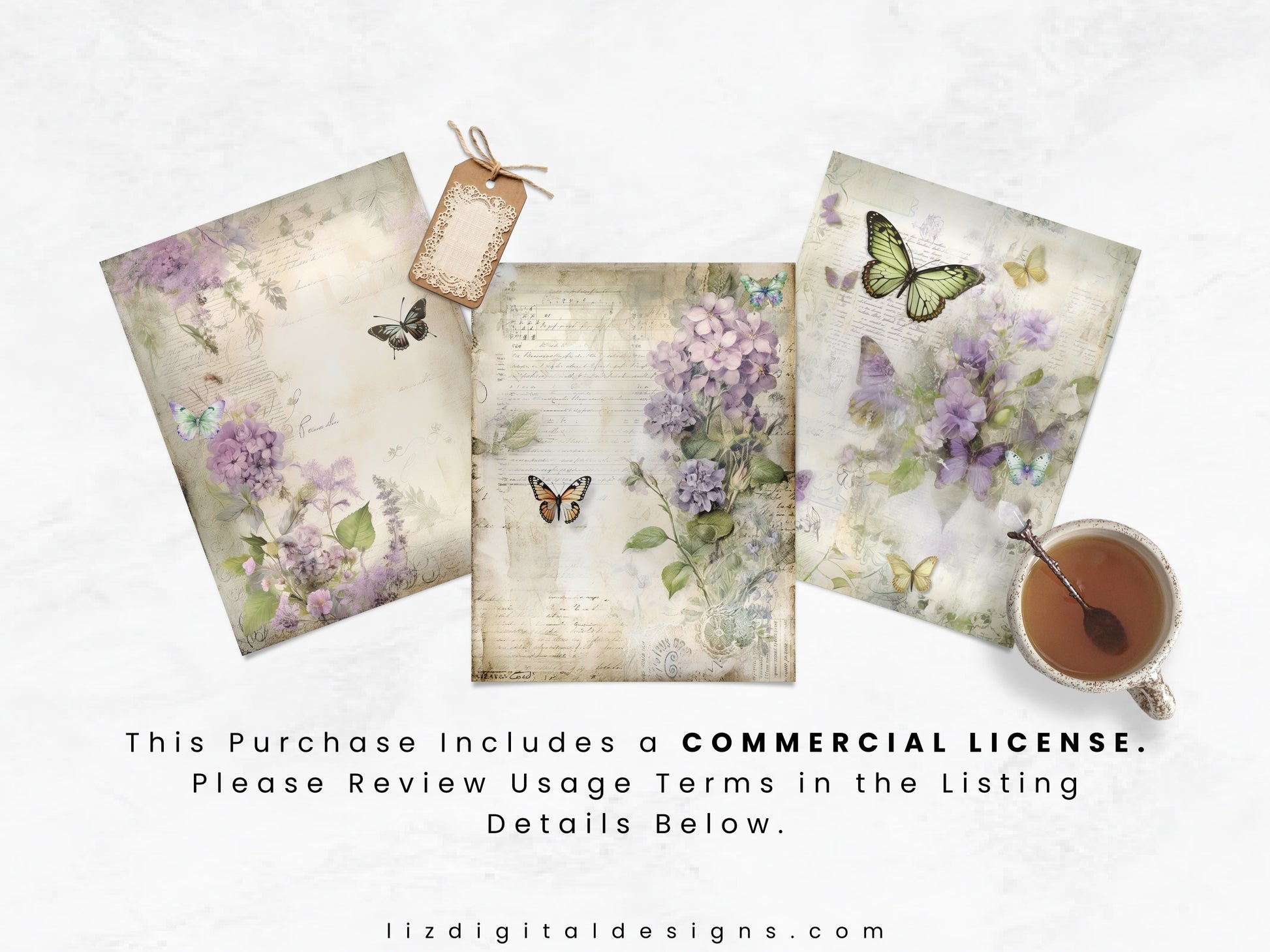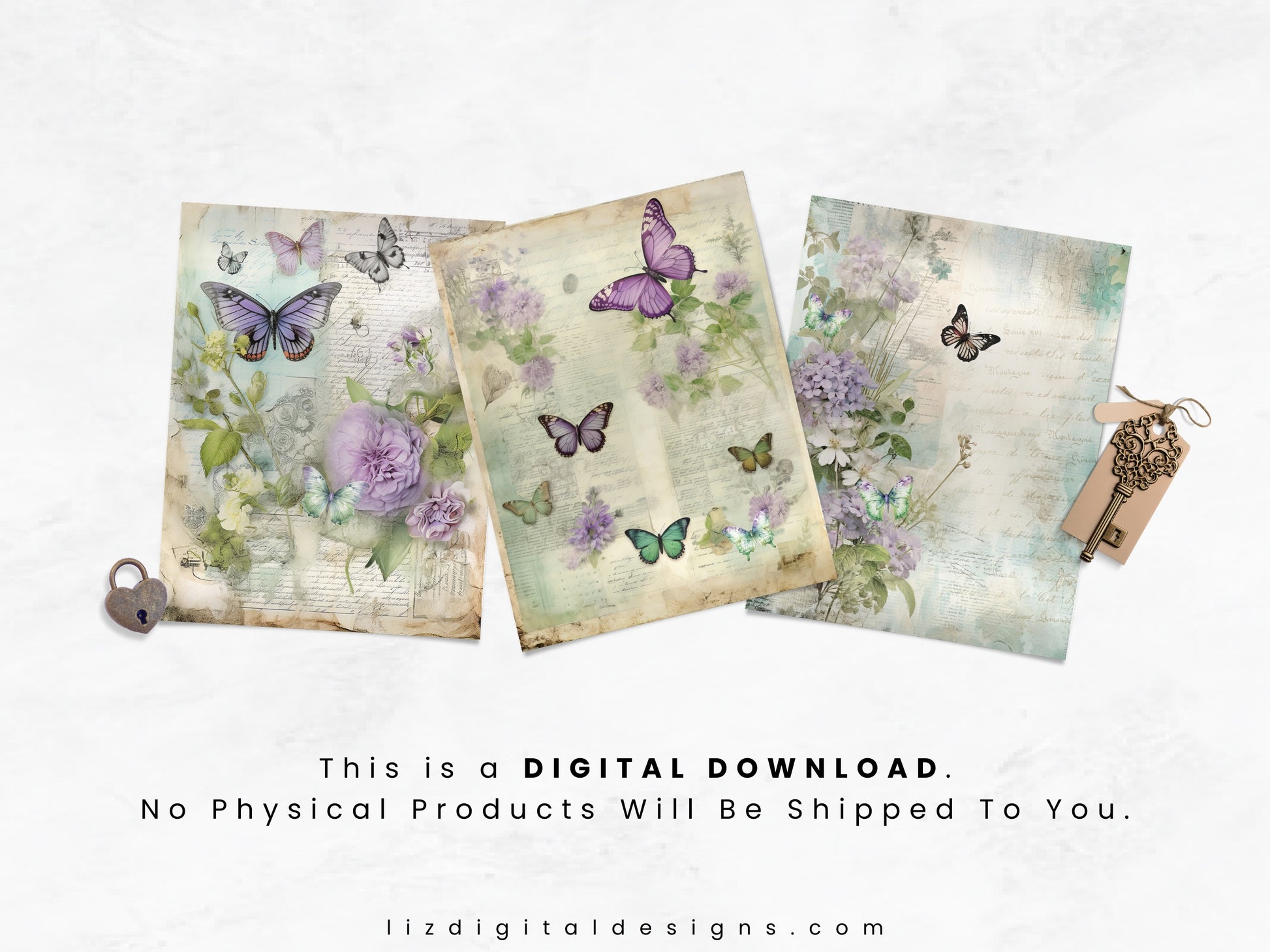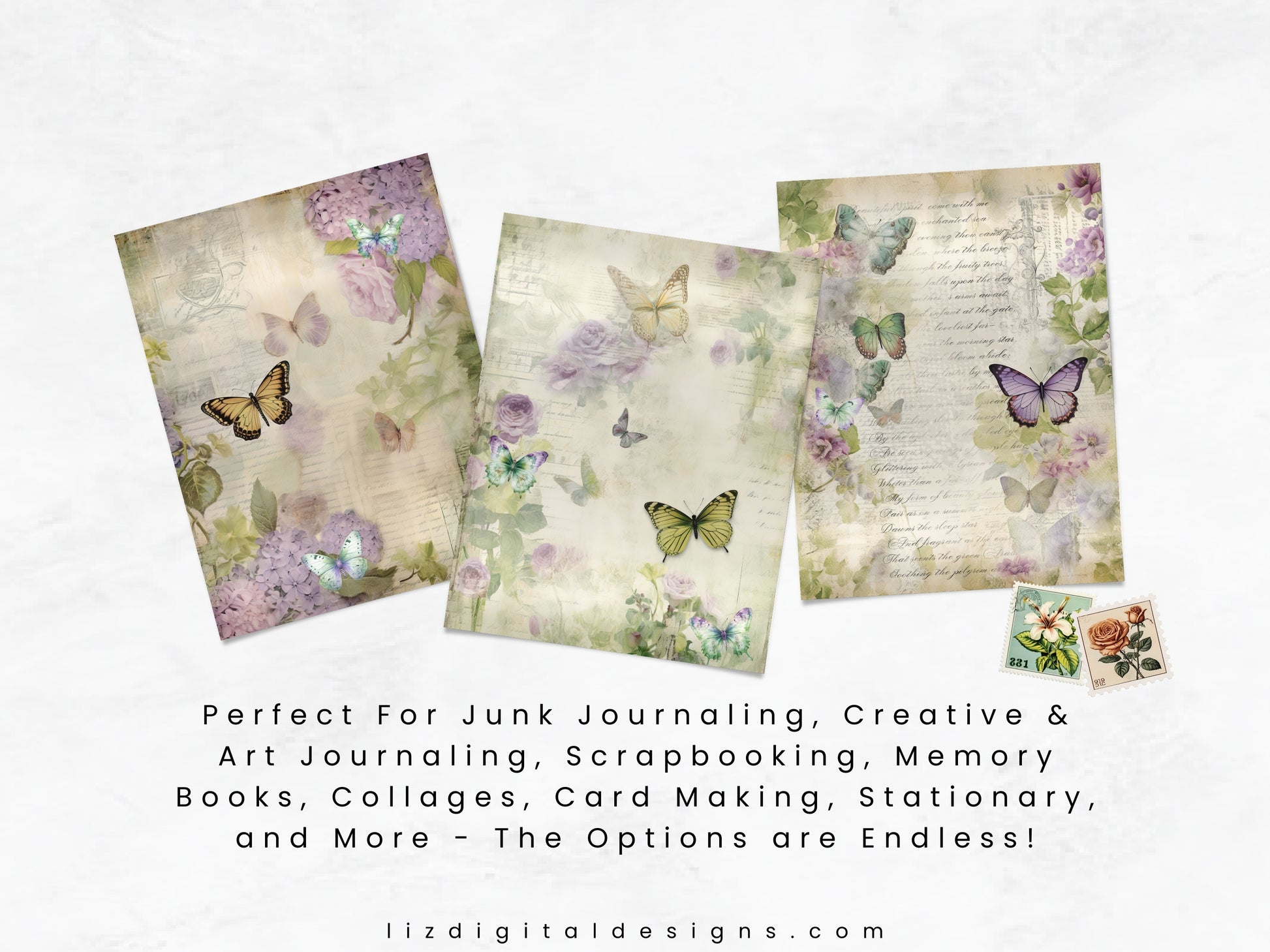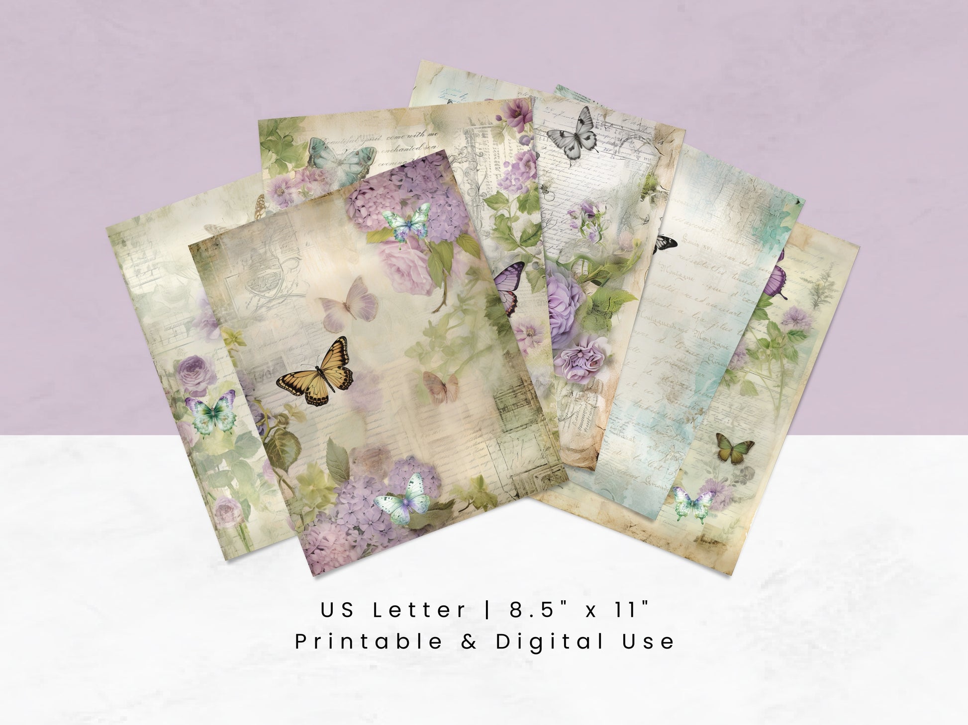 The Floral Butterfly digital papers set features a whimsical collection of butterfly ephemera and floral designs, perfect for adding a touch of vintage charm to your journal pages. Whether you're a junk journal enthusiast, avid scrapbooker, or a passionate creative and art journaler, these versatile papers are designed to inspire. Use them in your collages, stationery, cards, invitations, scrapbooks, memory books, journals and planners today!