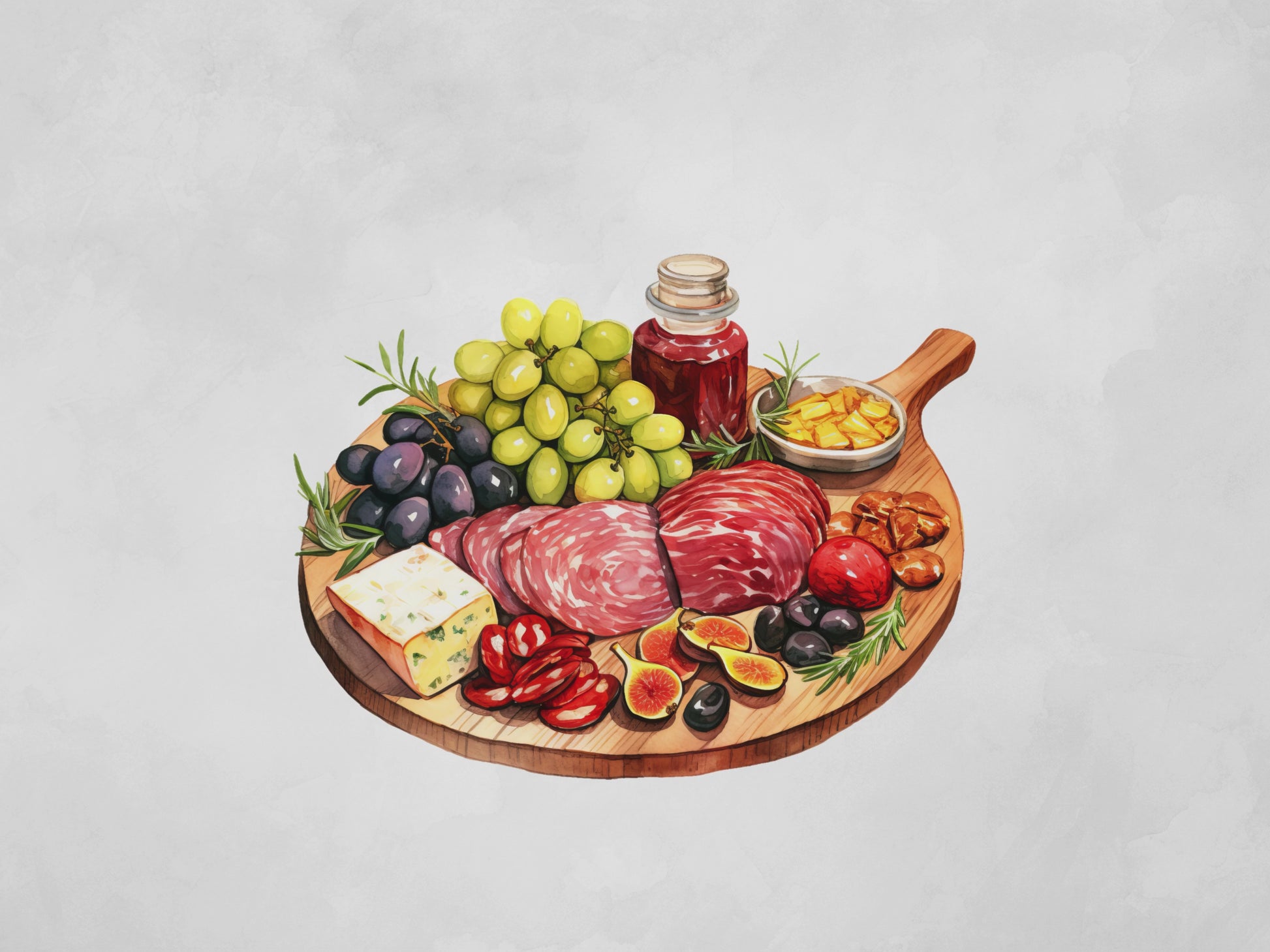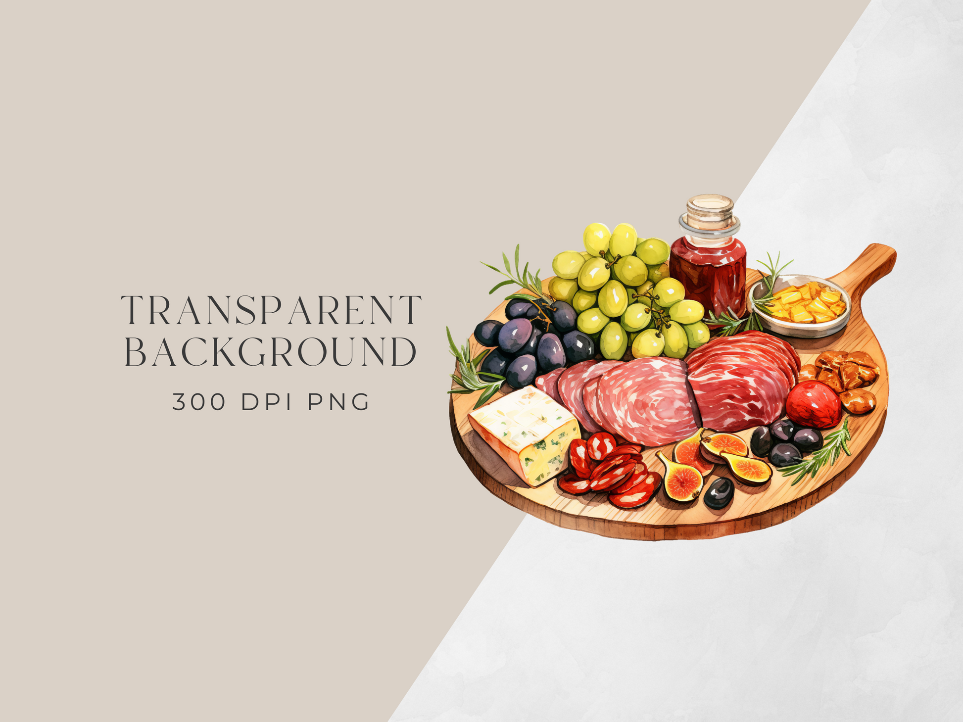This SINGLE Charcuterie Board Clipart is perfect for creating stunning designs, whether you're hosting a special event or looking for commercial use clipart. Create greeting cards, invitations, stationery, decor, stickers, recipe books, food blogs, digital designs and more!