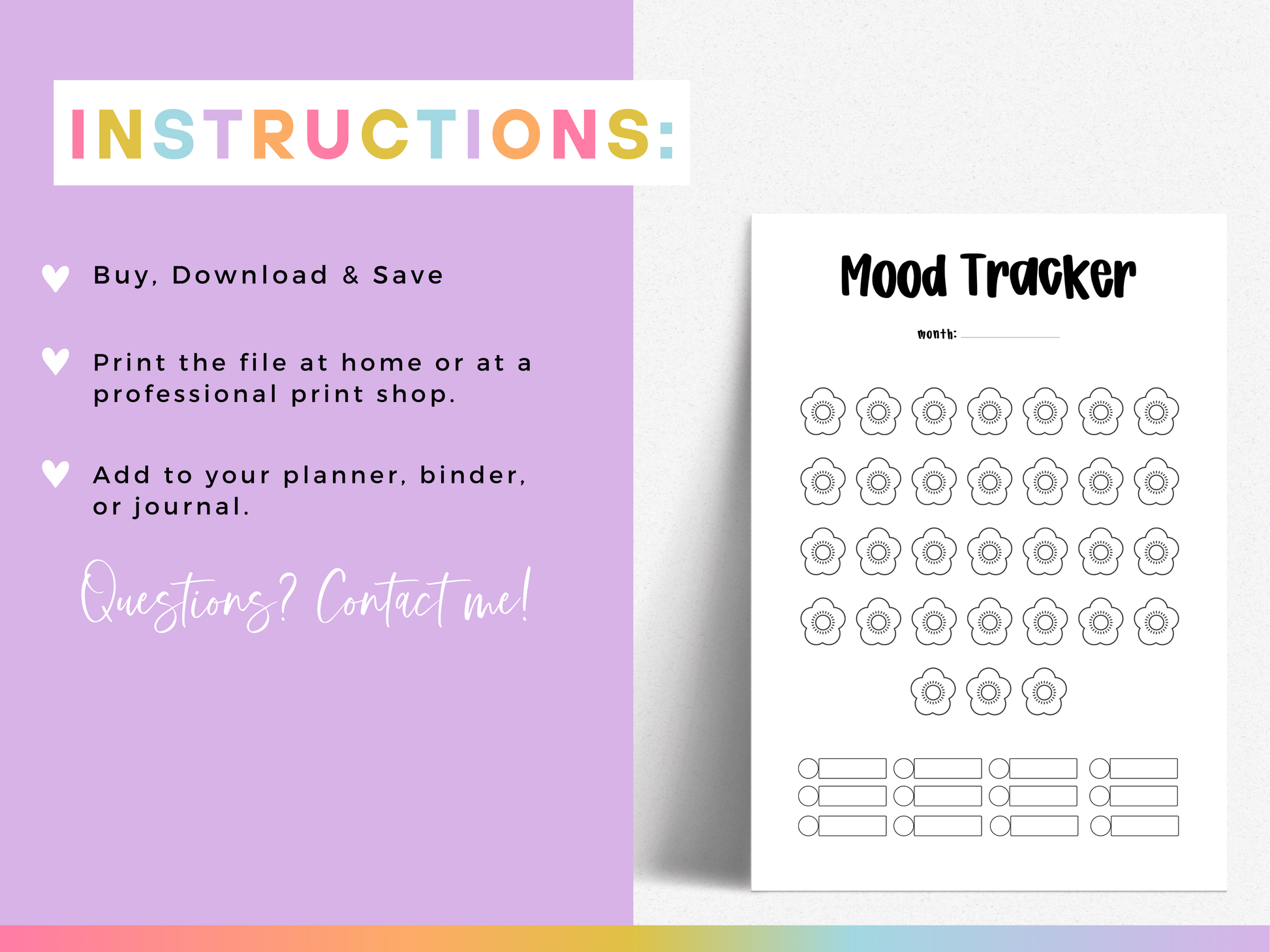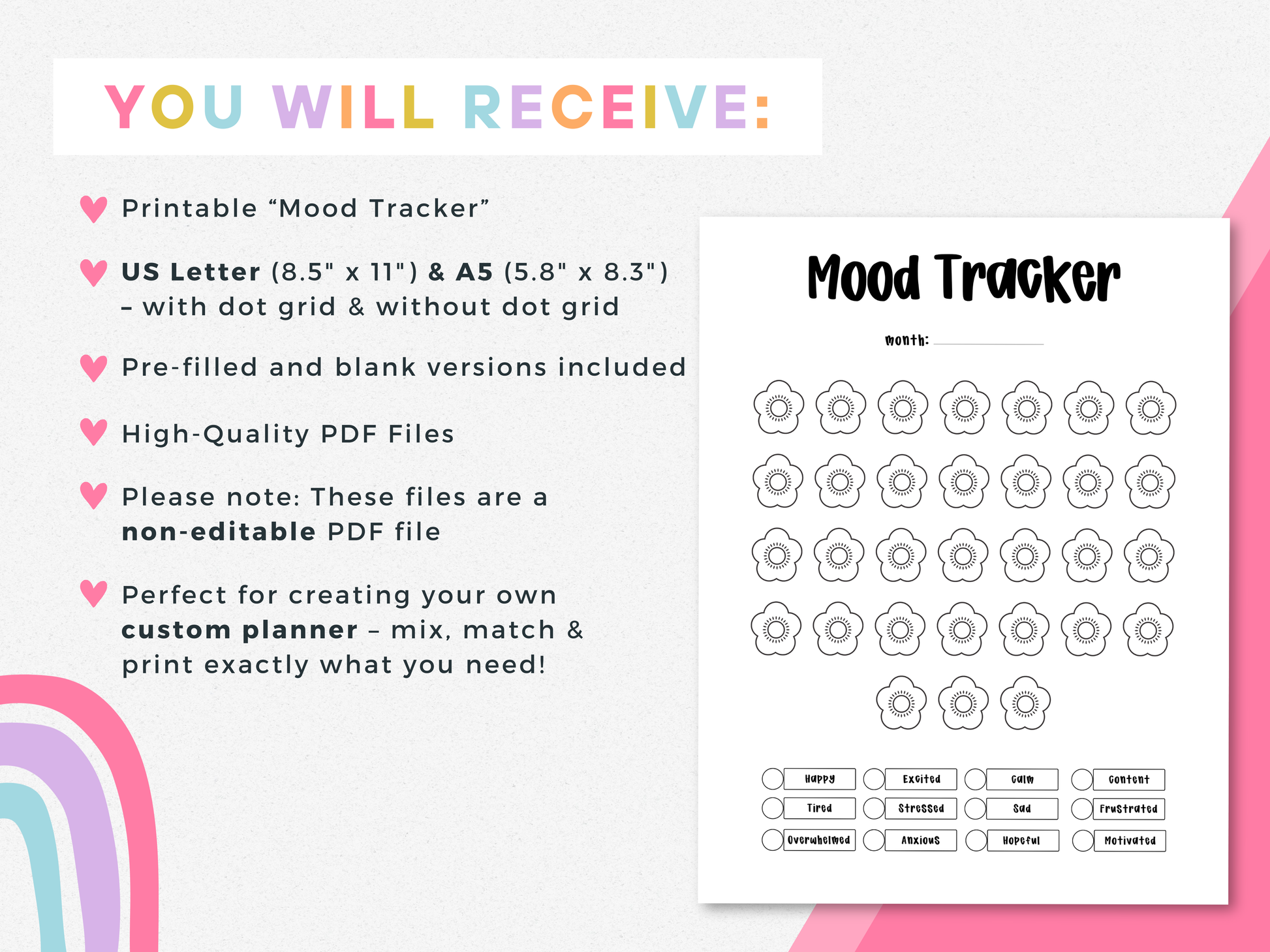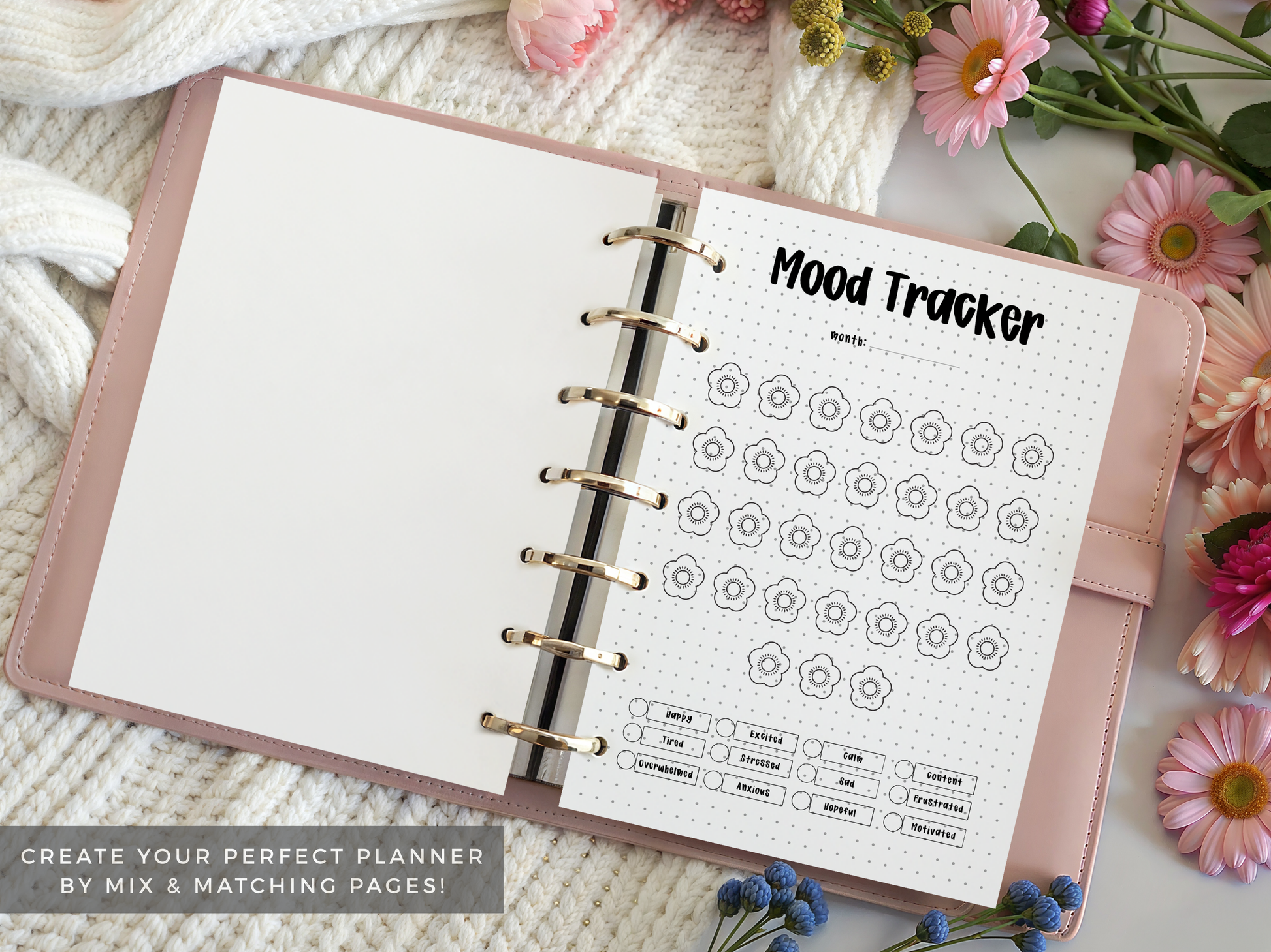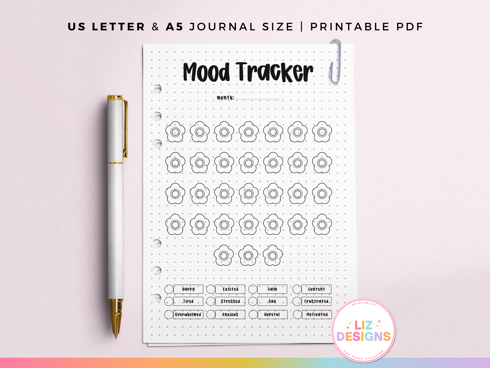 Simply assign colors to each mood and fill in the blossoms daily to watch your month bloom into a visual record of your emotions. Perfect as a monthly mood tracker, yearly progress chart, emotion tracker, or self-care journal insert.
