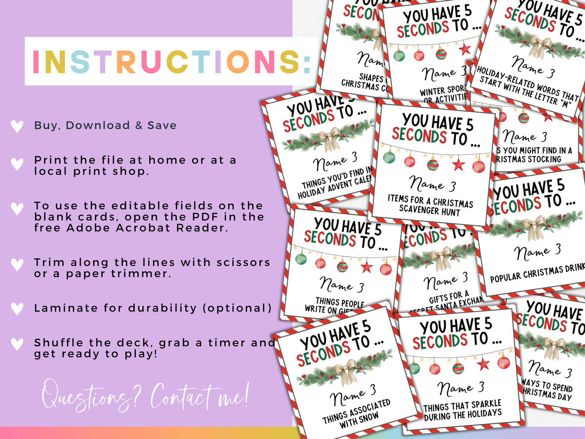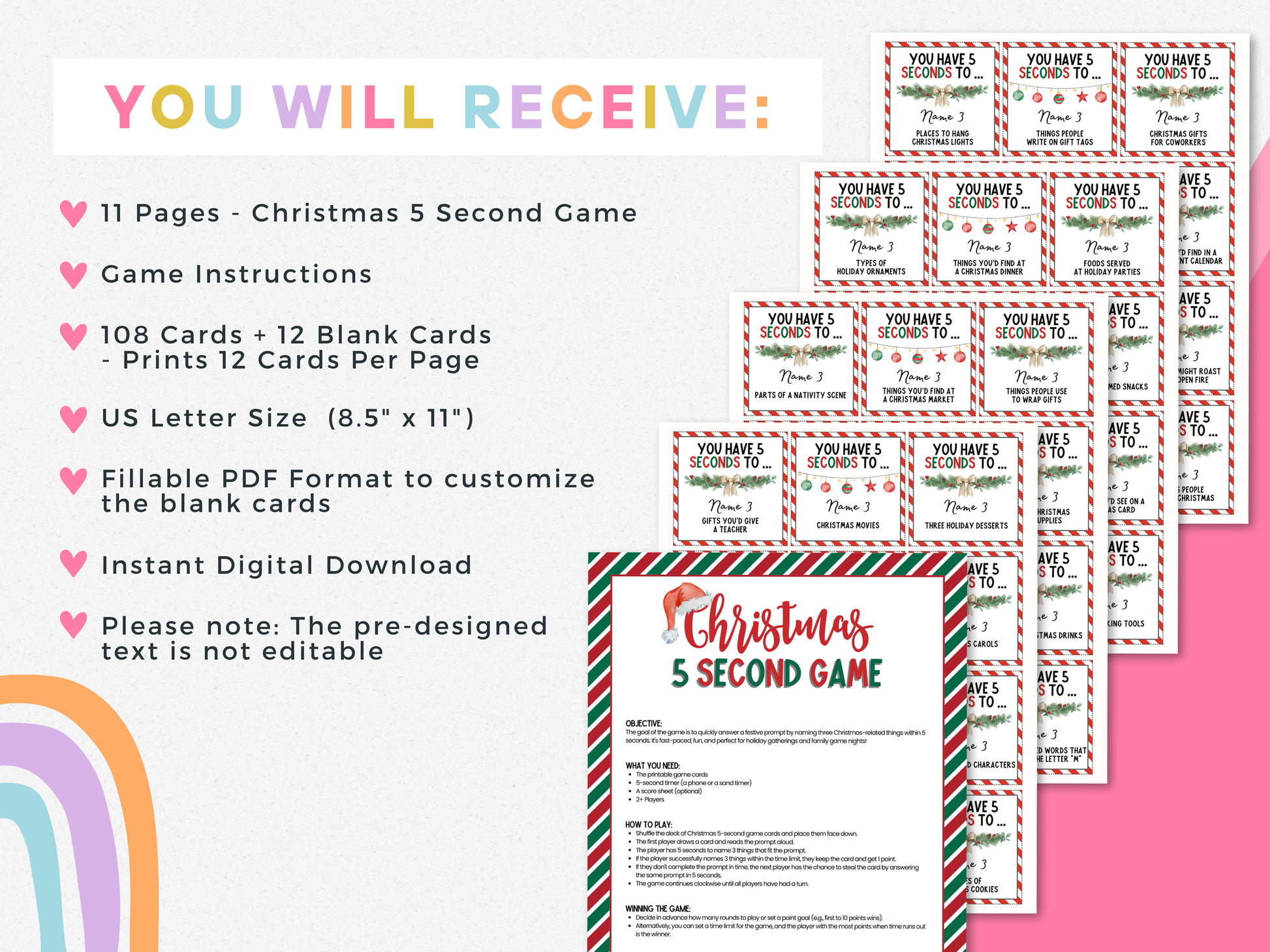 Spice up your holiday celebrations with the πππππππππ π ππππππ ππππ, perfect for family game night, office party games, or a festive Christmas classroom activity! This printable game will challenge players to think on their feet as they answer Christmas-related promptsβall in just 5 seconds! Easy to print and play, itβs a must-have for Christmas family gatherings, fun Christmas games at holiday parties, or even virtual get-togethers.