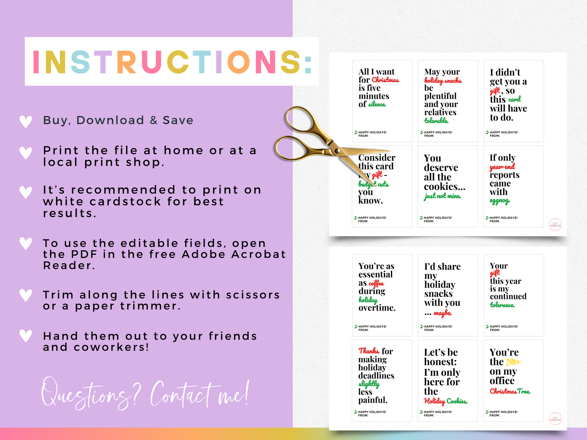 Spread laughter and holiday cheer with this bundle of 12 π ππππ πππππππππ πππππ, perfect for coworkers, friends, or anyone who could use a good chuckle this season! Featuring witty messages like "Youβre the star on my office Christmas tree" and "Thanks for making holiday deadlines slightly less painful," these printable cards for coworkers are ideal for Secret Santa, office holiday parties, or simply saying "Merry Christmas" with humor. Whether youβre looking for a funny work Christmas card or a holiday office card, these designs are guaranteed to bring smiles!