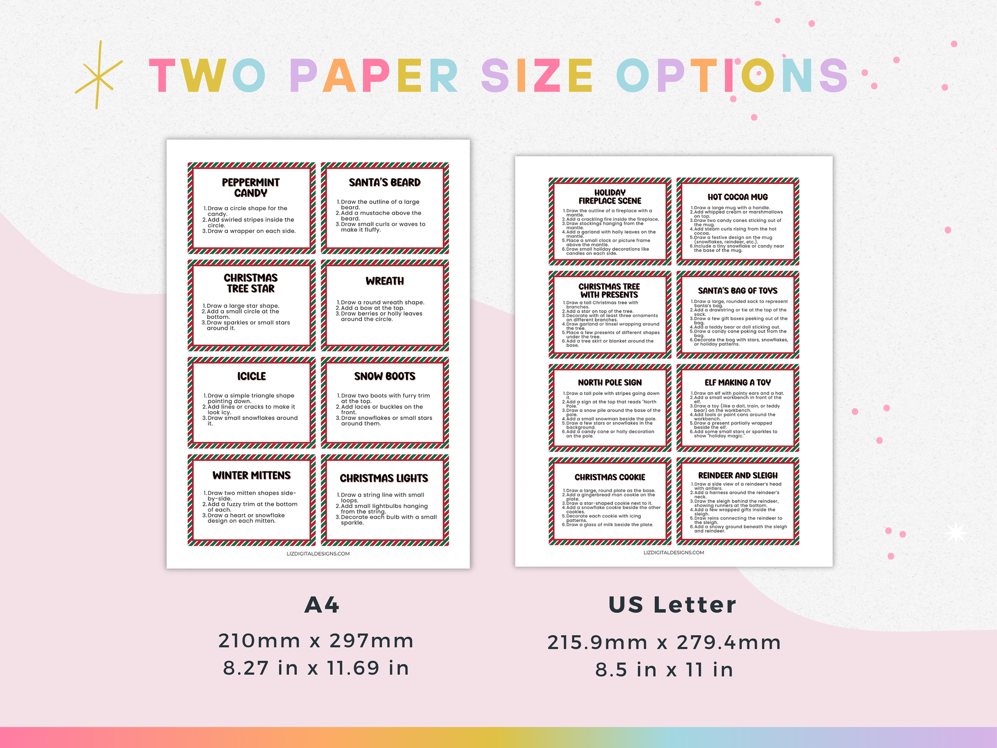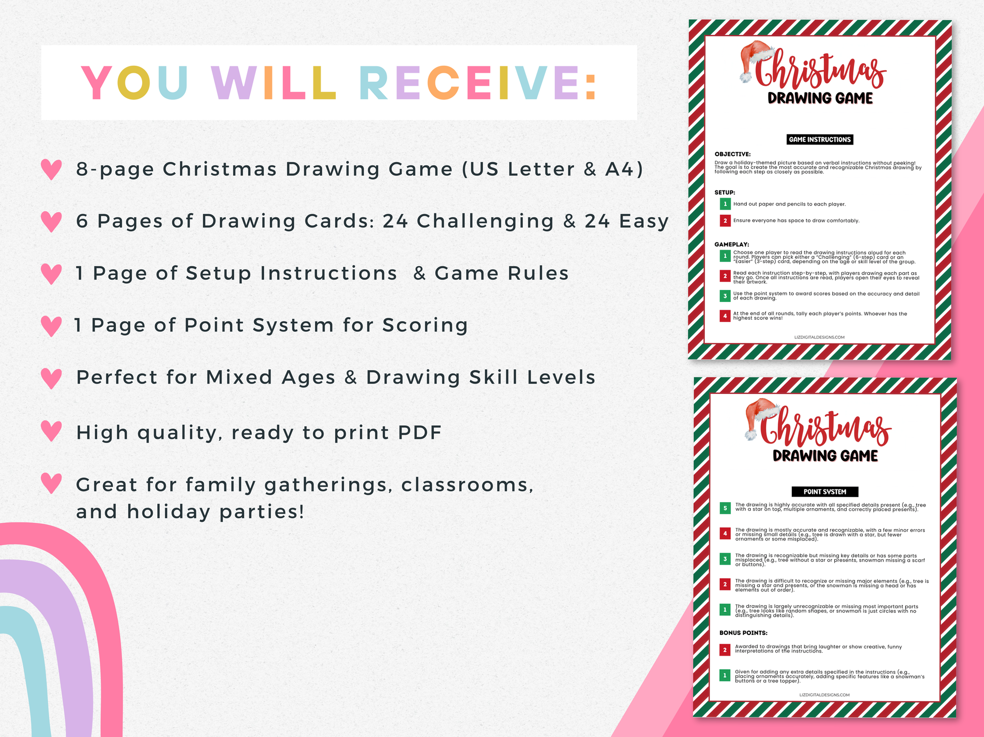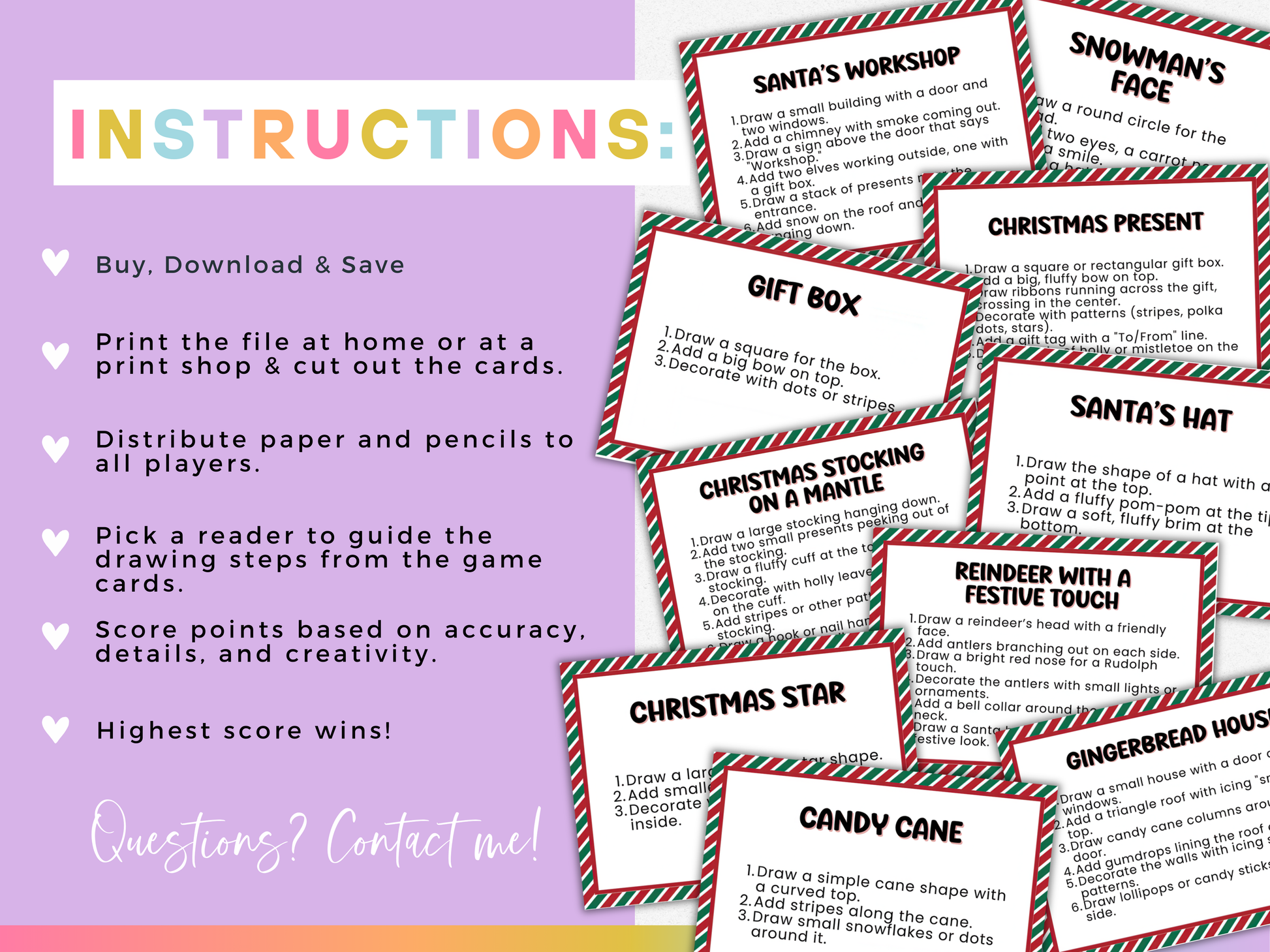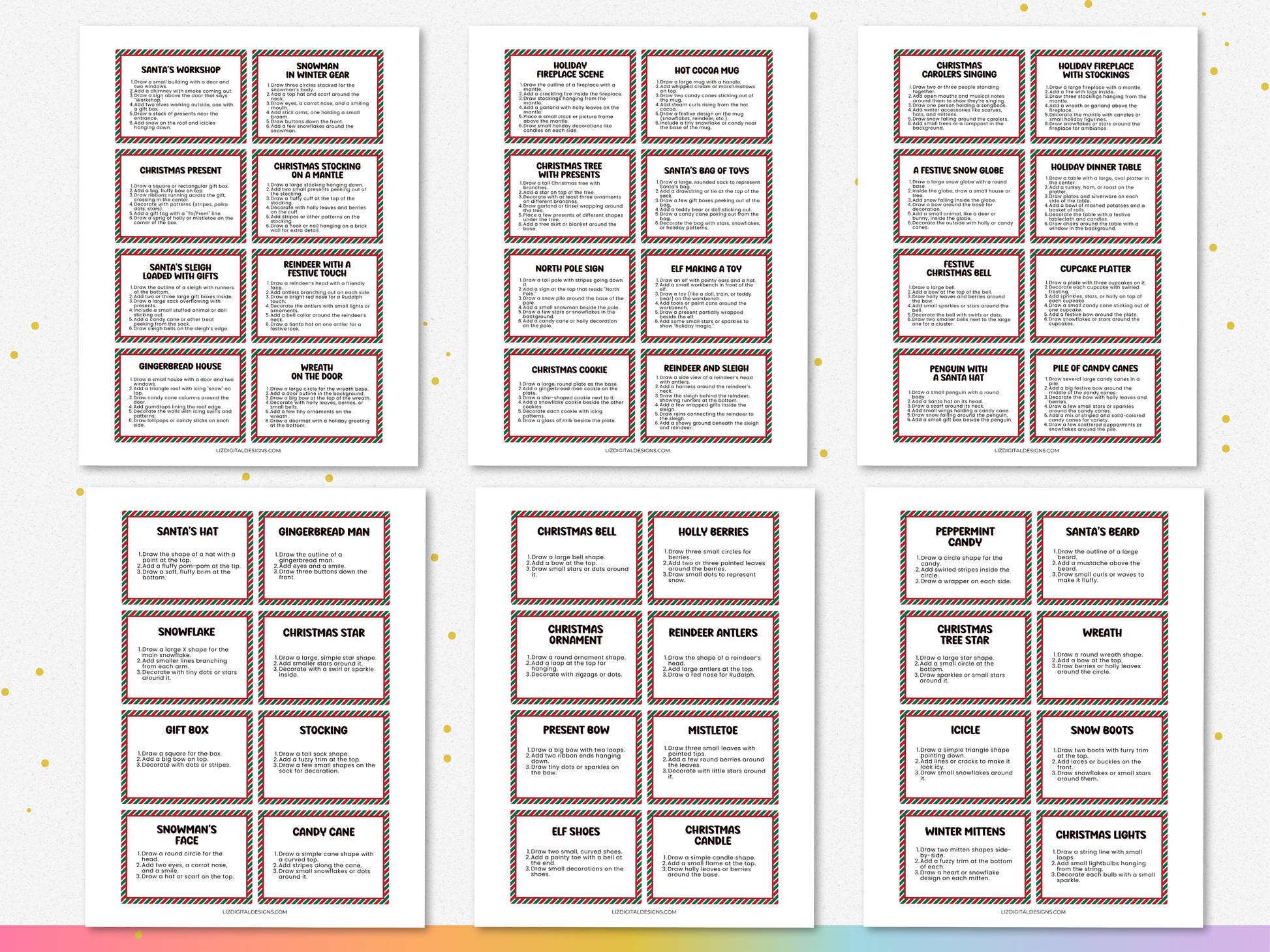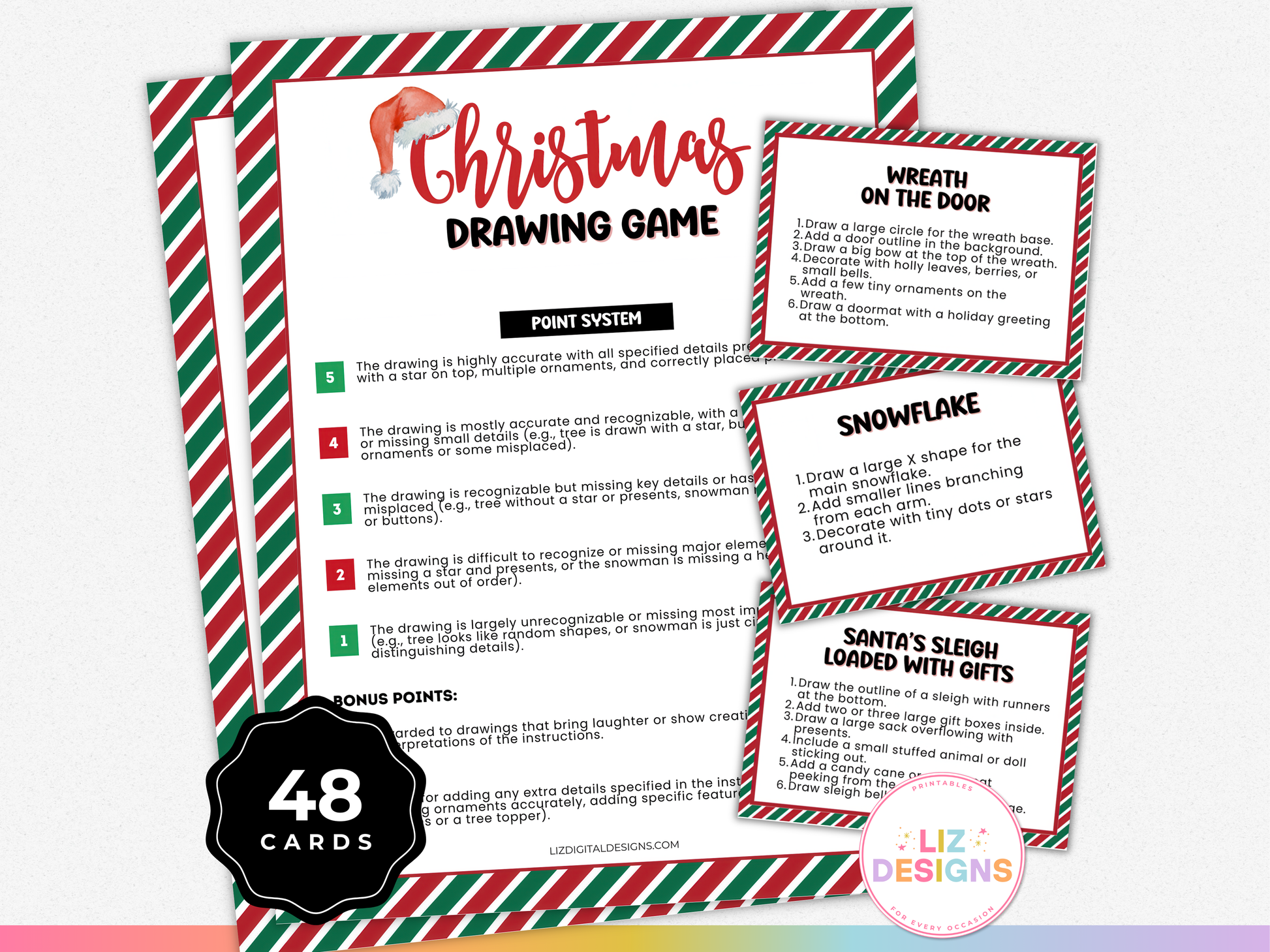 Get ready for holiday laughs and creativity with the πππππππππ πππππππ ππππ! Perfect for kids, adults, and family gatherings, this printable game brings out the artist in everyone while making memories. The game includes 48 drawing prompts split into two levels: 24 Challenging Cards with 6 steps each and 24 Easy Cards with 3 steps each, so players of all ages can enjoy!
