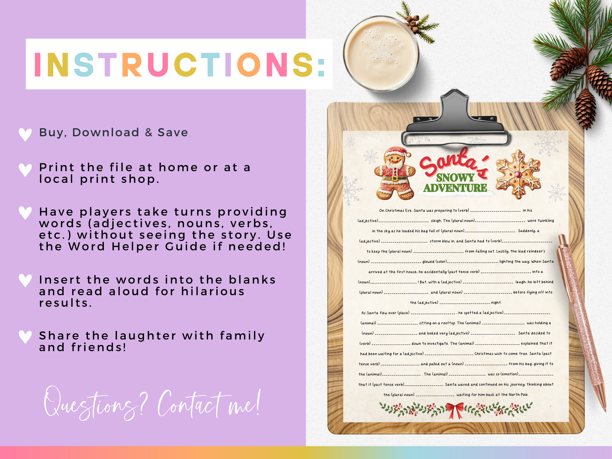 Add a festive twist to your holiday gatherings with this πππππππππ πππ ππππ ππππππ! Perfect for all ages, these printable Christmas party games are a must-have for spreading laughter and holiday cheer. Whether you're hosting a family get-together, a classroom activity, or a cozy night in, these fun Christmas games are sure to entertain kids and adults alike. To make things even easier, the set comes with a Word Helper Guide, making it perfect for younger players.