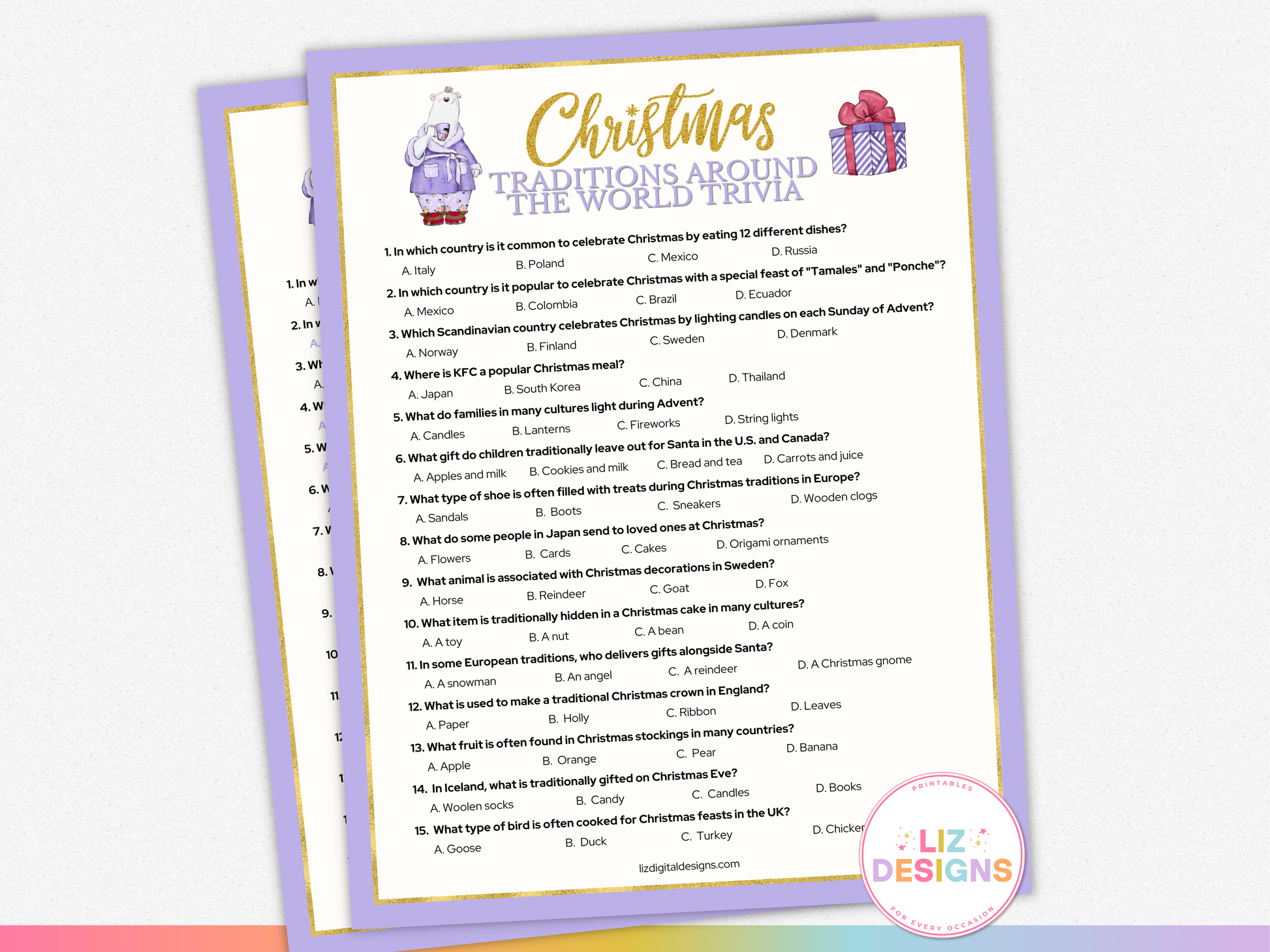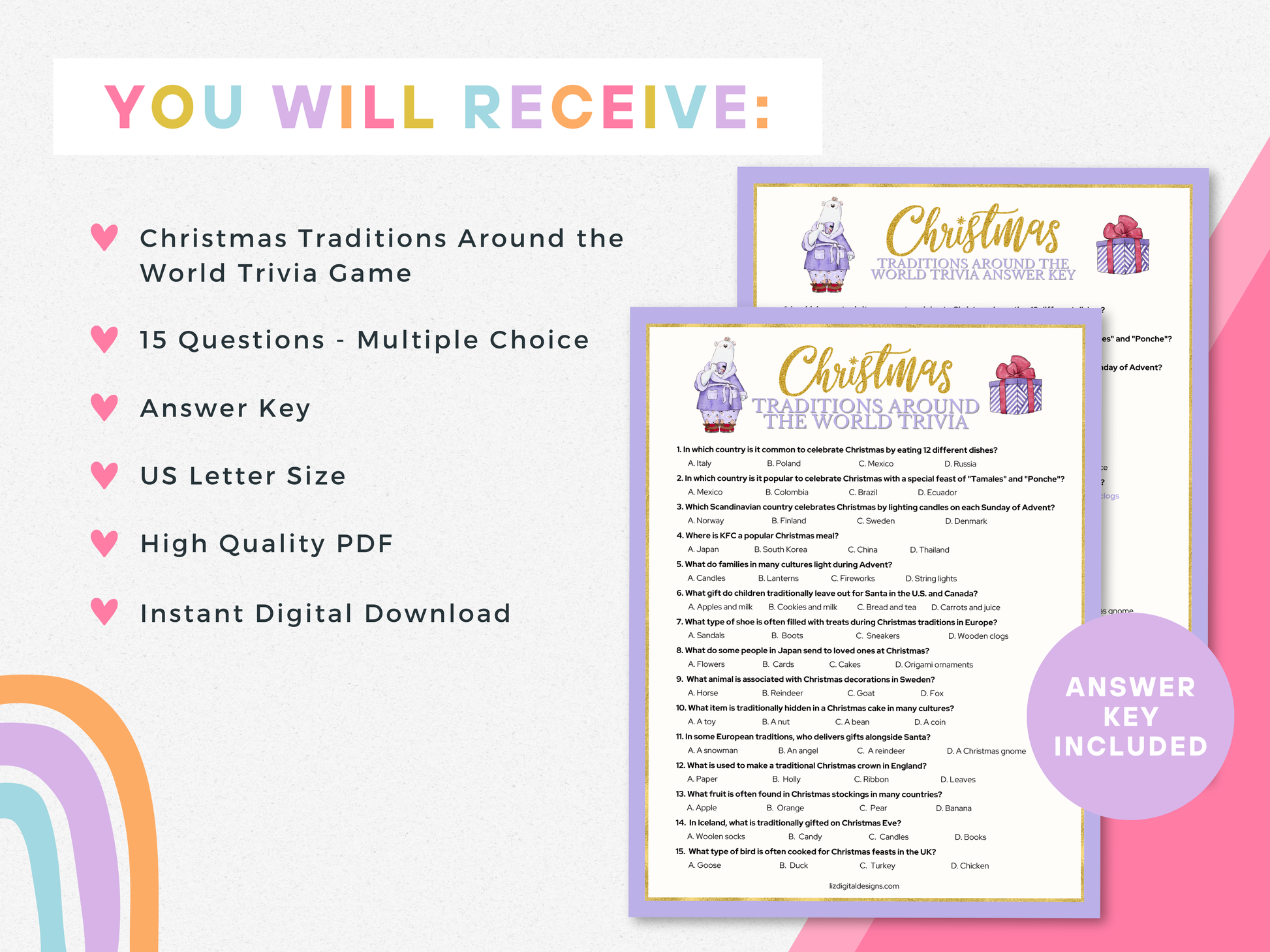 π Group Play: Distribute the trivia sheets to each player or team. Take turns answering the questions and see who knows the most about Christmas traditions around the world! The player/team with the most correct answers wins.