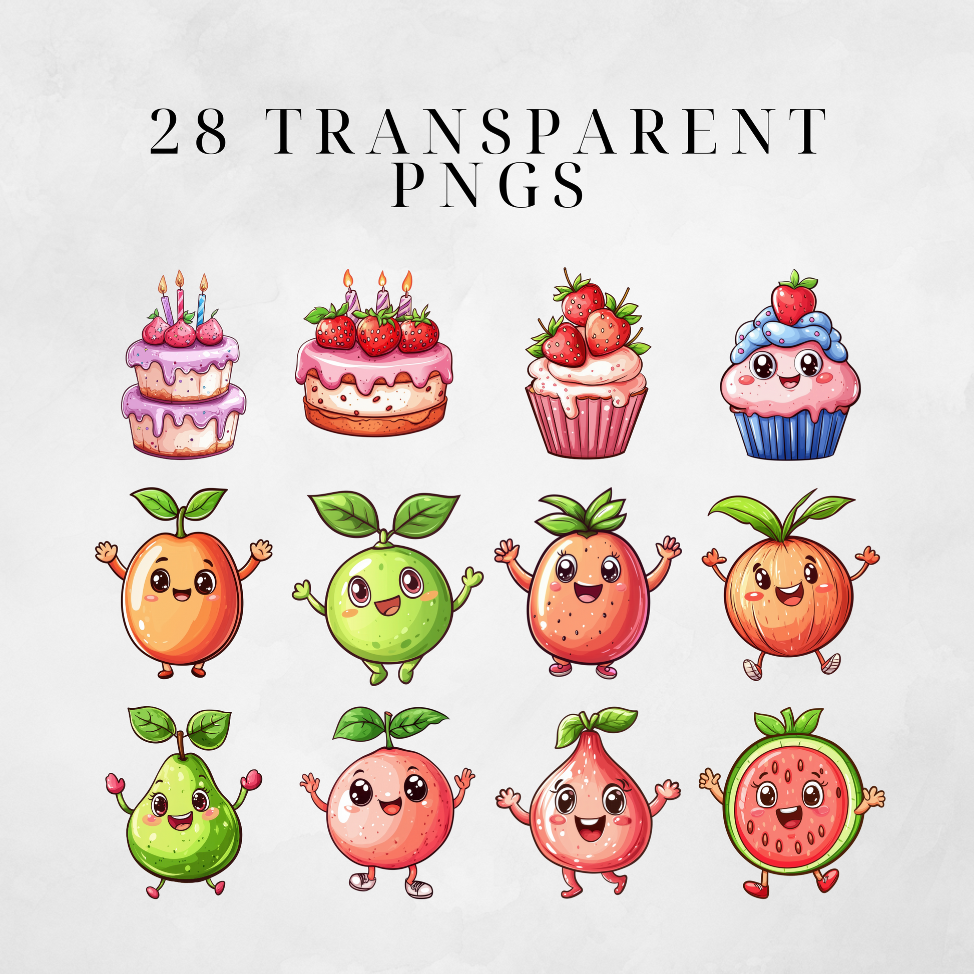 Bring your creations to life with this adorable πππππππ π ππππ πππππππ ππππ! This collection features 28 high-quality PNG files with transparent backgrounds, showcasing cute dancing fruits, balloons, cakes and cupcakes! Tis set is perfect for a variety of creative projects, including kidsβ birthday invitations, summer-themed party decorations, classroom decor, stickers, kids' crafts and activities, scrapbook elements, and more!Β