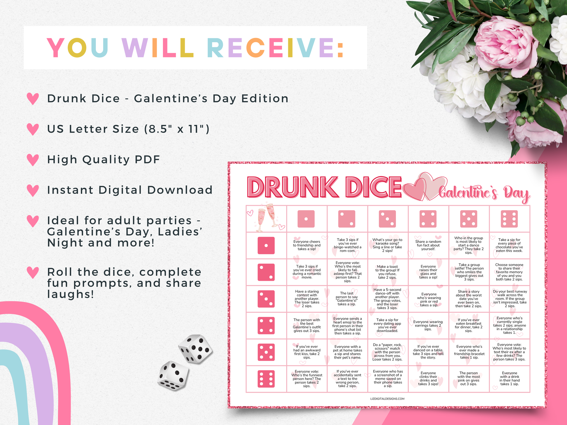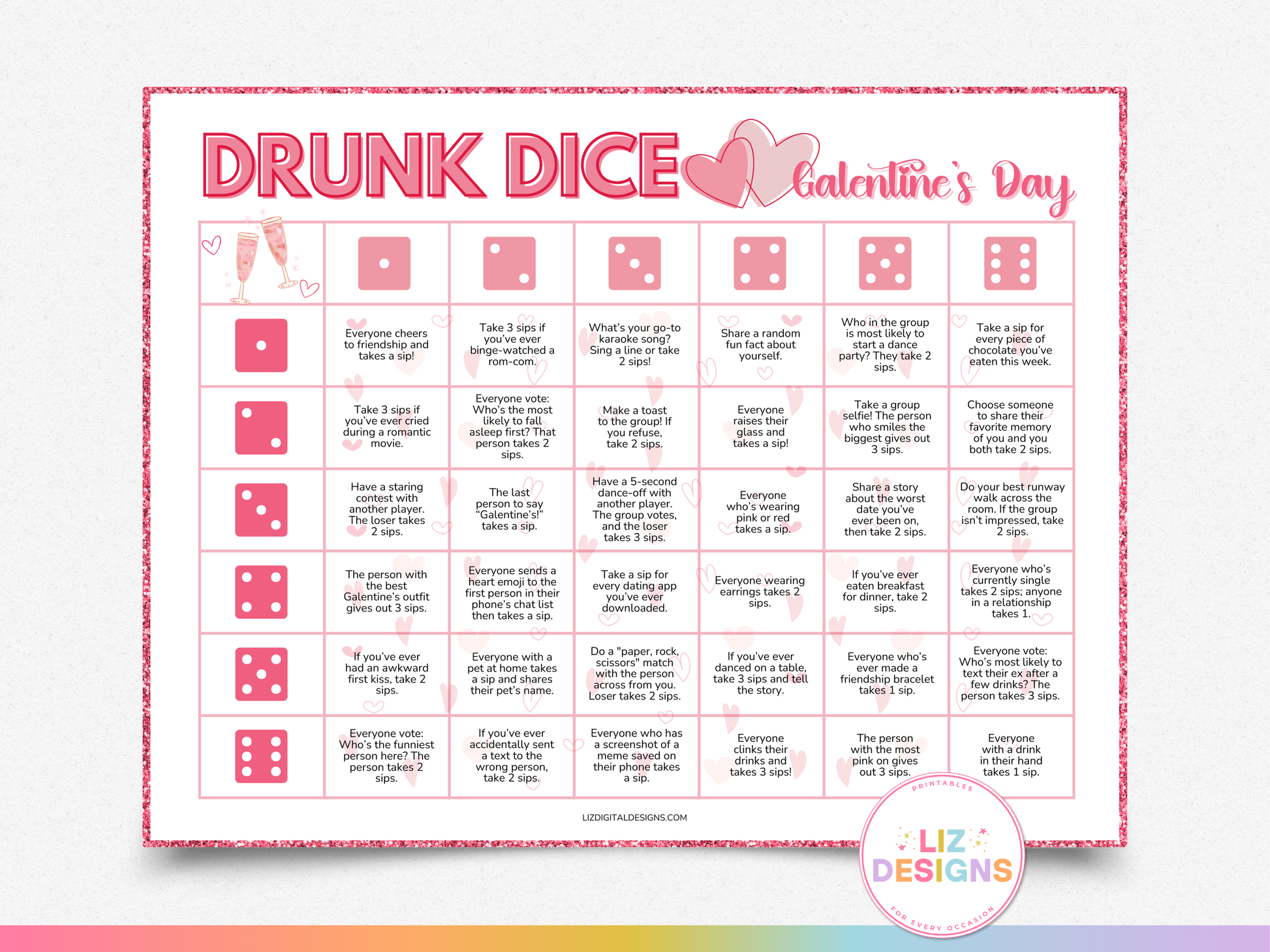 Make your Galentine’s Day unforgettable with the 𝐃𝐑𝐔𝐍𝐊 𝐃𝐈𝐂𝐄 - 𝐆𝐀𝐋𝐄𝐍𝐓𝐈𝐍𝐄'𝐒 𝐃𝐀𝐘 𝐄𝐃𝐈𝐓𝐈𝐎𝐍—the ultimate Galentine Party Game that’s perfect for bonding, laughter, and a little friendly competition. This printable drinking dice game is ideal for a Ladies Night, Valentine’s Day Party, or any occasion where fun and friendship take center stage.