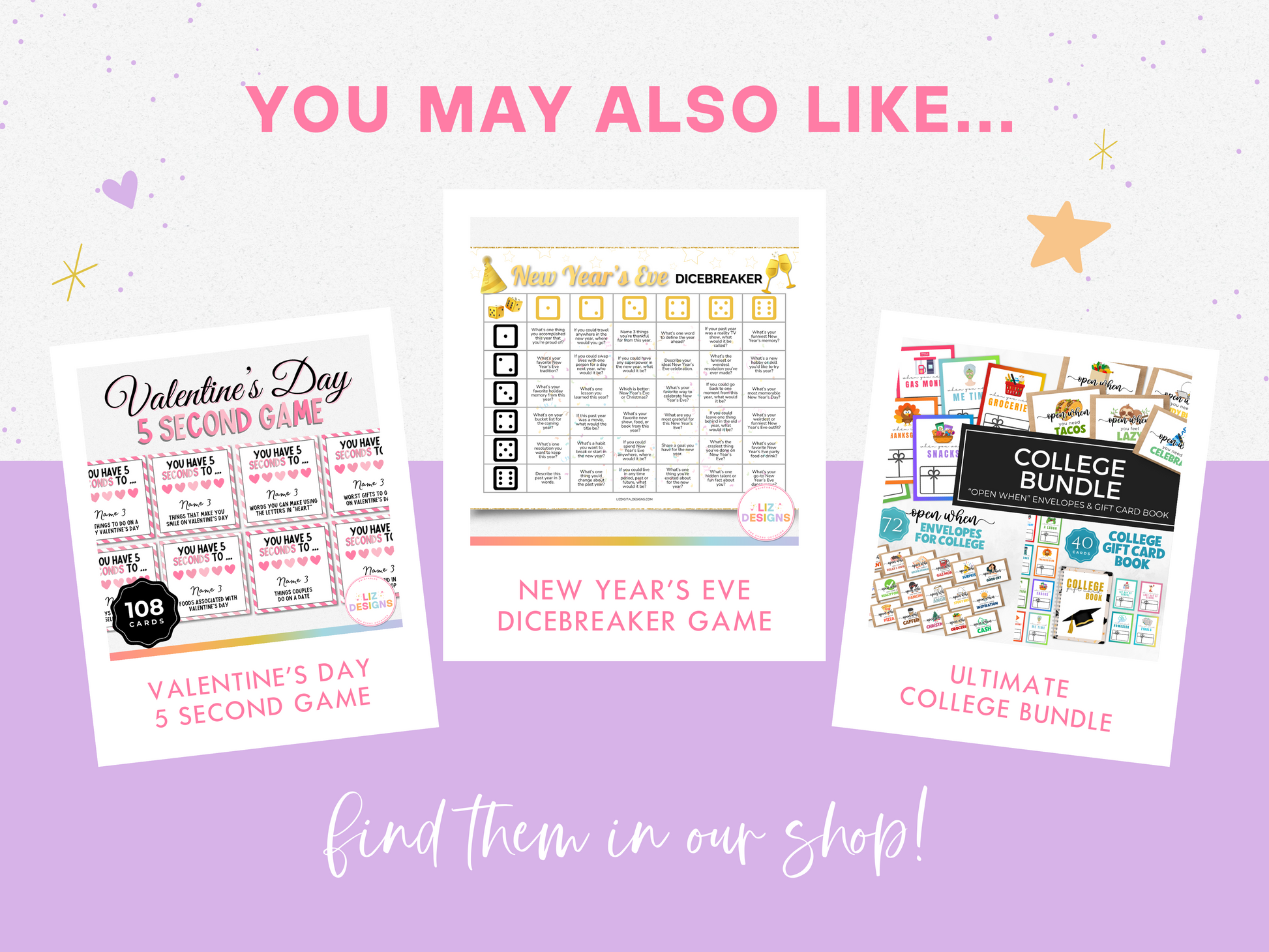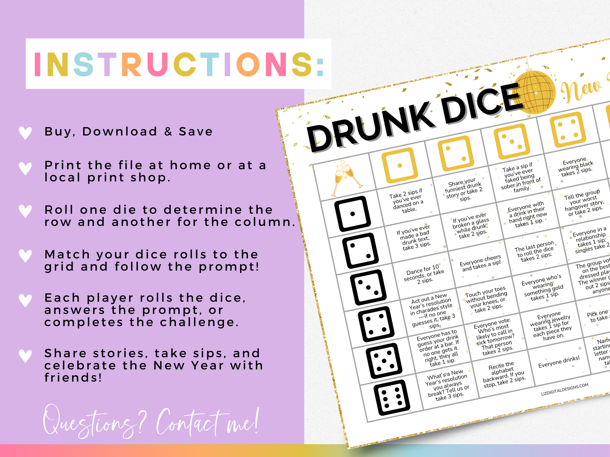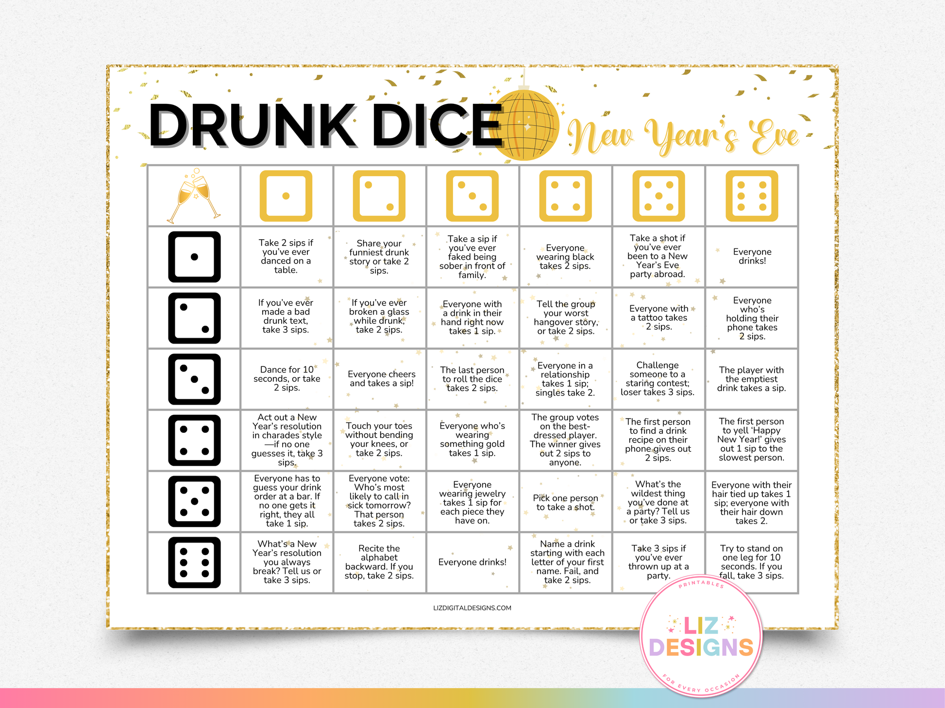 Turn up the fun at your next gathering with πππππ ππππ - πππ ππππ'π πππ πππππππ, the hilarious and interactive New Yearβs Eve Party Game for adults! Perfect for spicing up your holiday party games, this adult drinking game combines rolling dice, answering prompts, and sharing laughs over drinks. Whether itβs a New Yearβs Eve celebration, a Christmas party, or any festive occasion, this printable party game is guaranteed to bring the fun! Enjoy as a fun drinking game or adapt it for non-drinkers for a lighthearted twist!