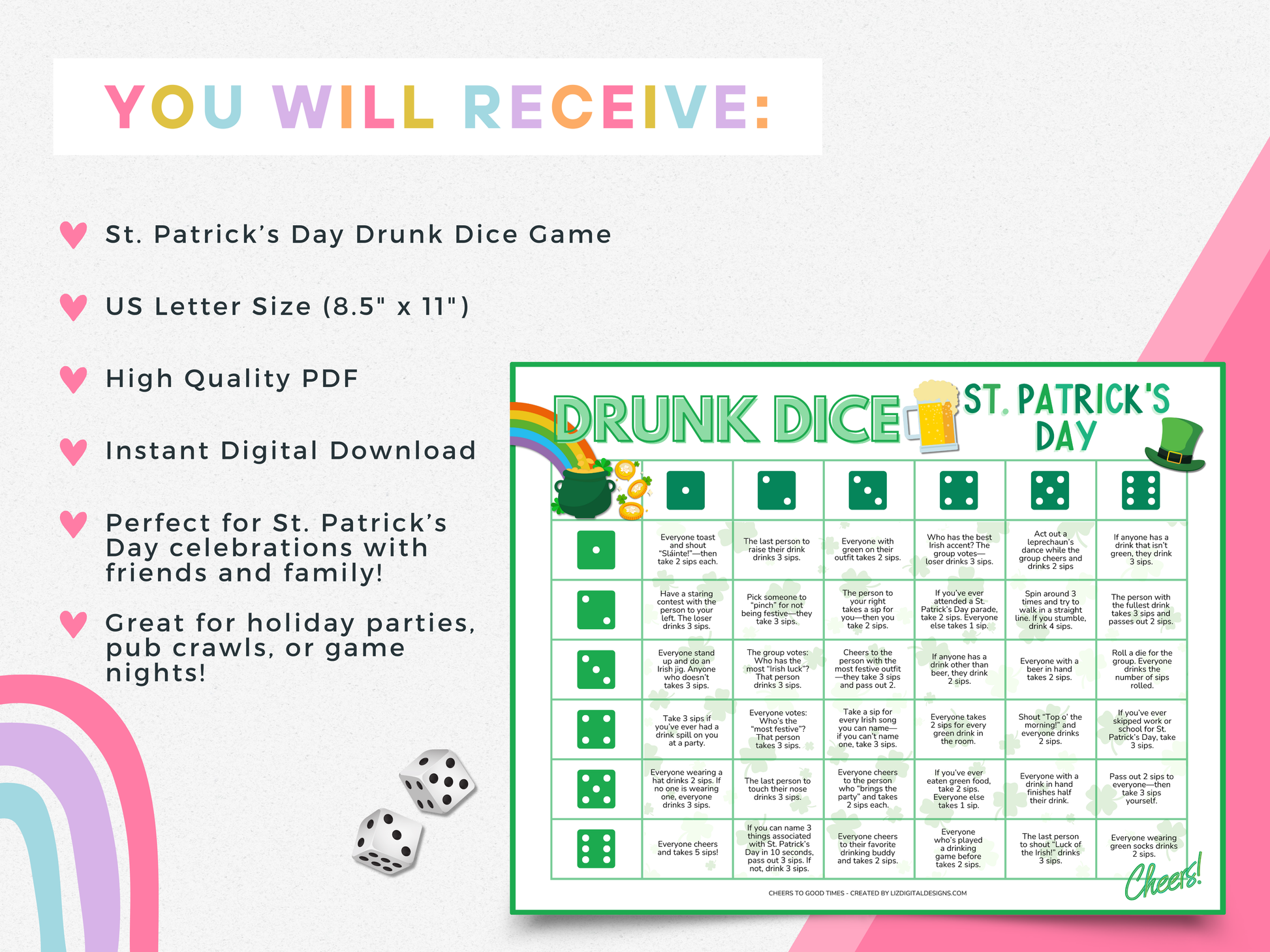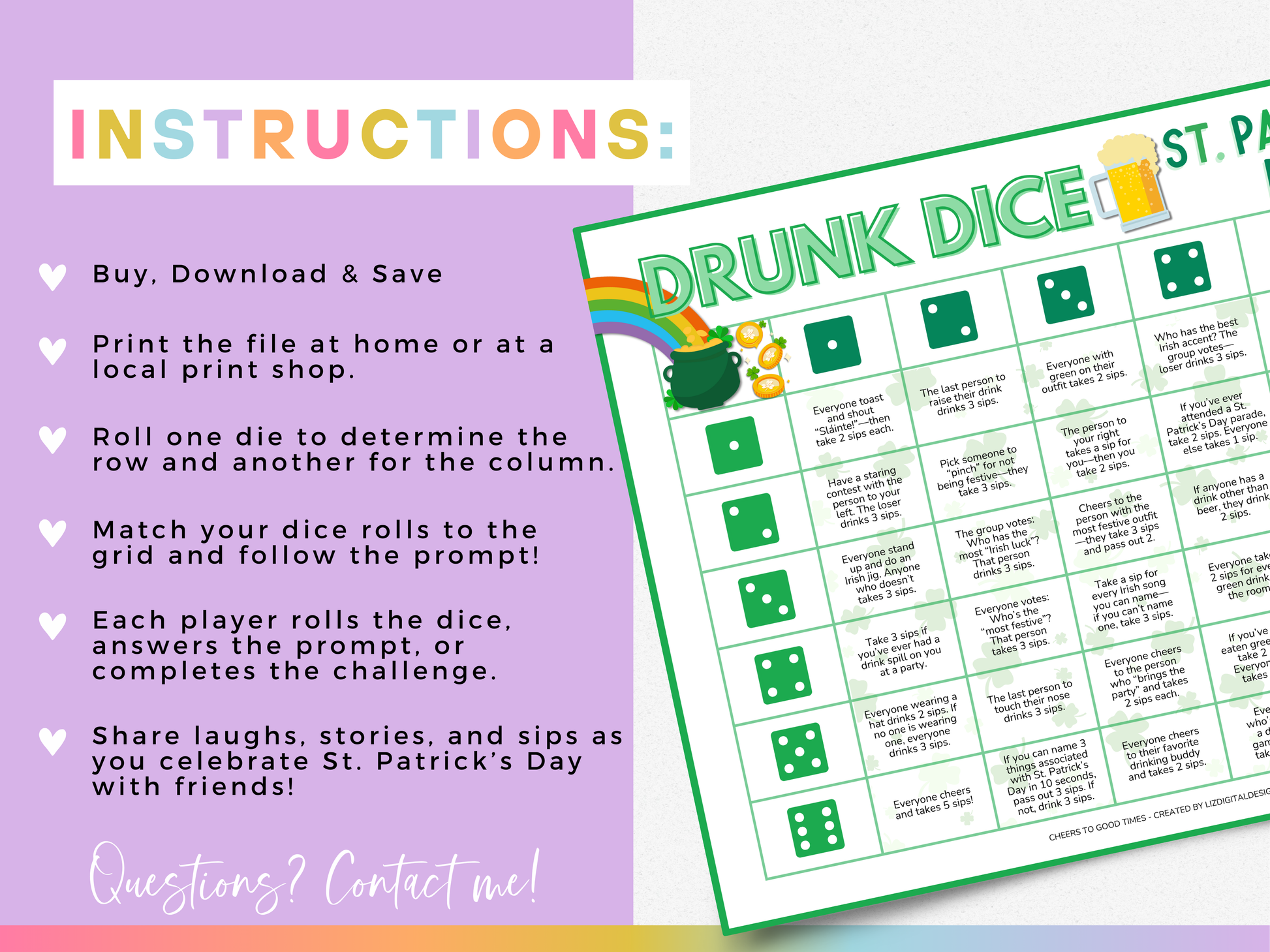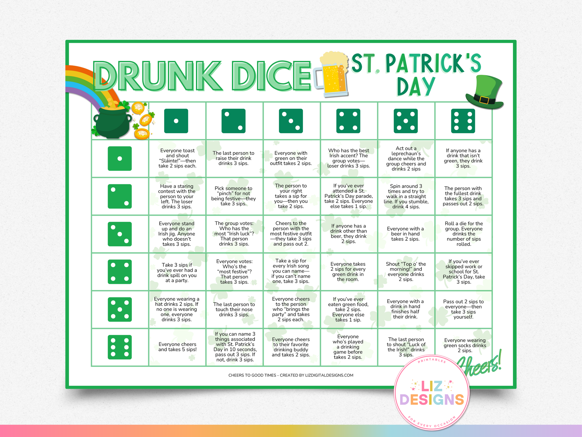 Celebrate St. Patrick’s Day with 𝐃𝐑𝐔𝐍𝐊 𝐃𝐈𝐂𝐄 - 𝐒𝐓. 𝐏𝐀𝐓𝐑𝐈𝐂𝐊'𝐒 𝐃𝐀𝐘 𝐄𝐃𝐈𝐓𝐈𝐎𝐍, the ultimate party drinking game for adults! Perfect for any St. Paddy’s celebration, pub crawl, or house party, this fun drinking dice game will have you laughing, sipping, and competing with friends. With a festive Irish-themed design and prompts that guarantee everyone joins in the fun, this game is a must-have for your next St. Patrick’s Day party.