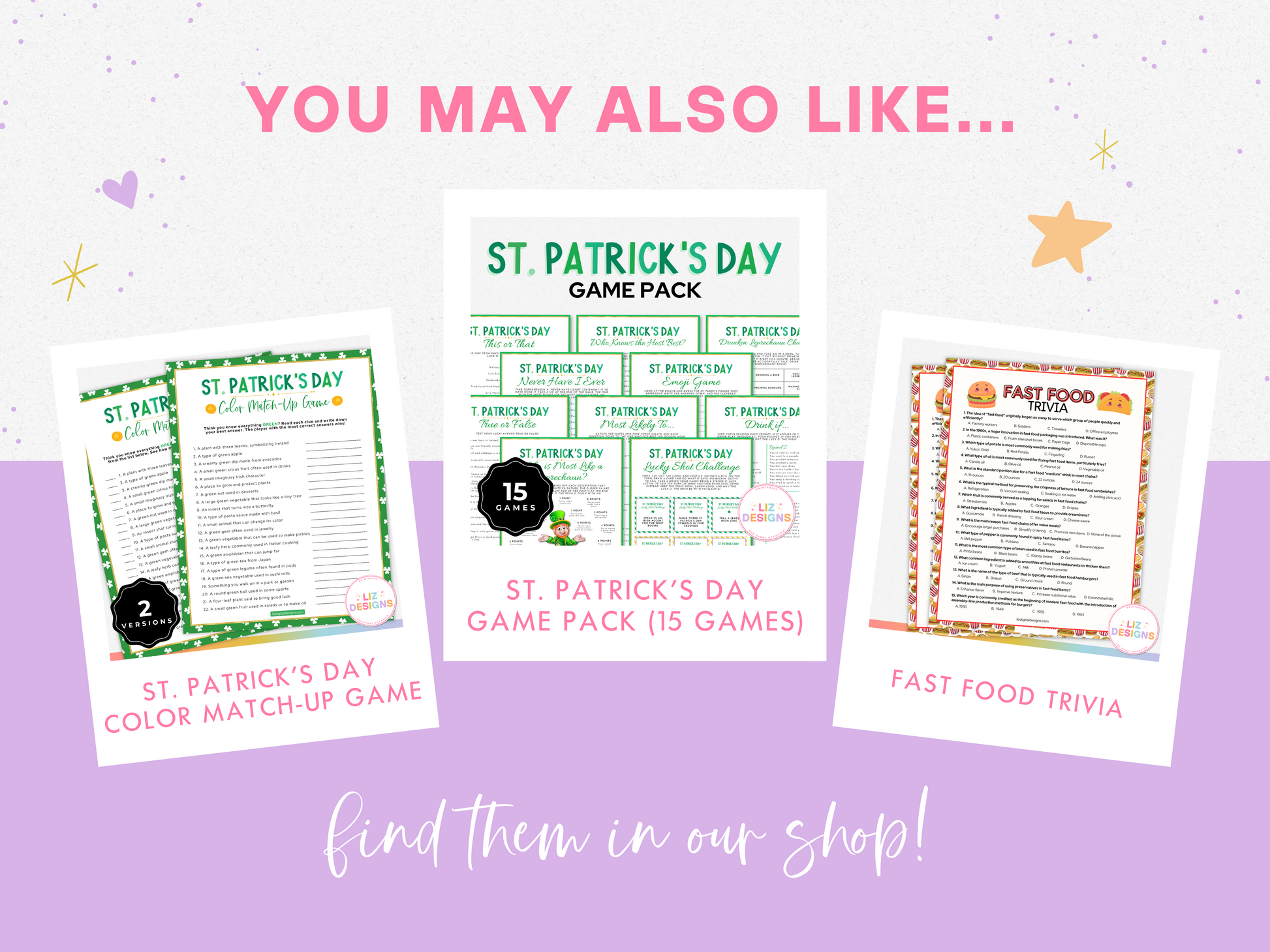 Looking for more festive fun? Check out the 𝐒𝐓. 𝐏𝐀𝐓𝐑𝐈𝐂𝐊'𝐒 𝐃𝐀𝐘 𝐏𝐀𝐑𝐓𝐘 𝐆𝐀𝐌𝐄 𝐏𝐀𝐂𝐊 featuring 15 unique games, including trivia, challenges, and drinking games, perfect for any celebration!