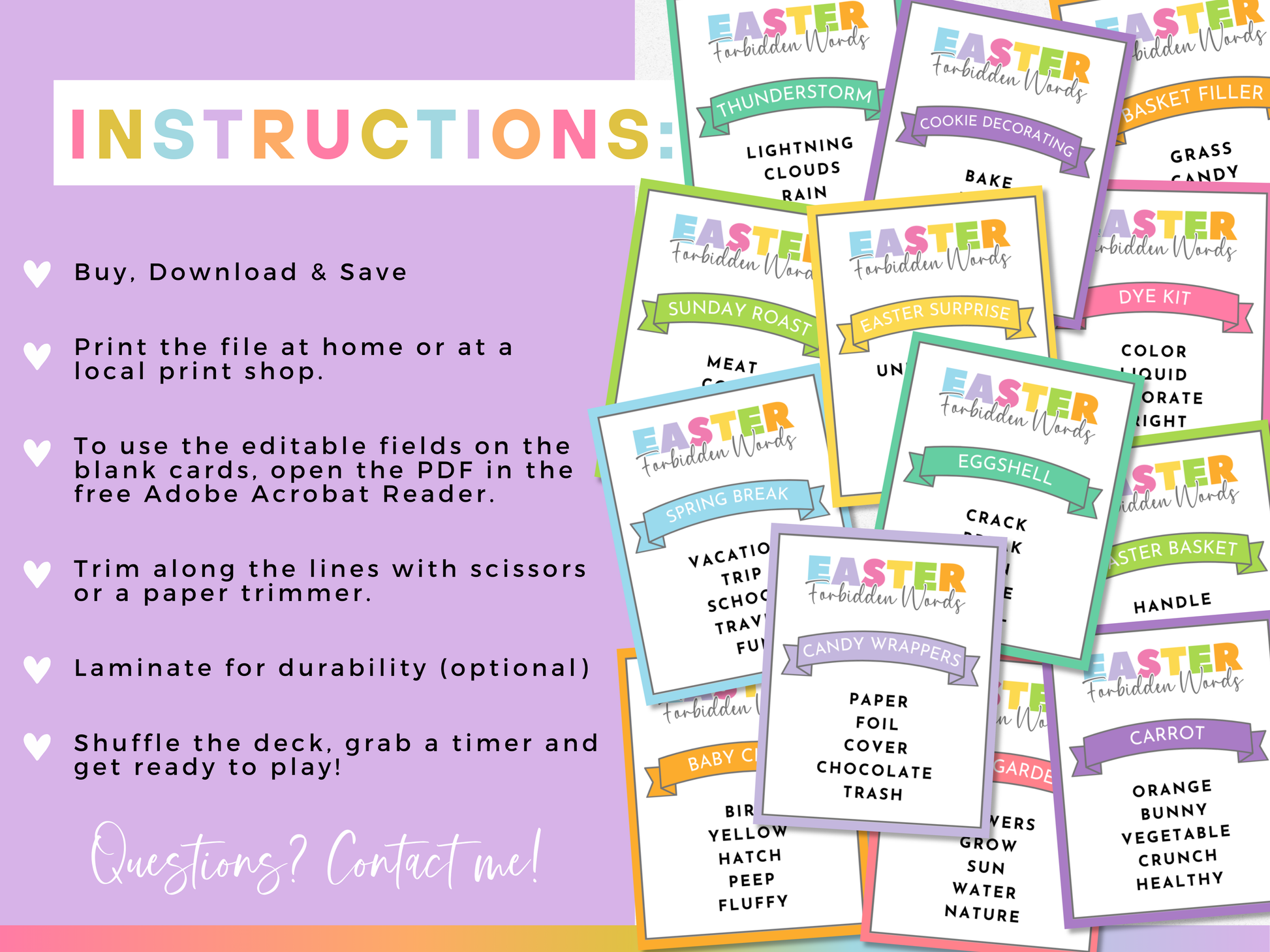 π Players take turns describing the Easter-themed word on their card without saying any of the five forbidden words! Their team must guess the correct word before time runs out. The first team to reach 20 points wins!