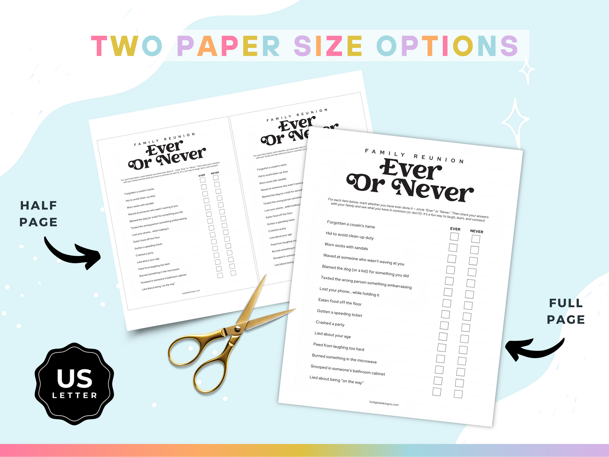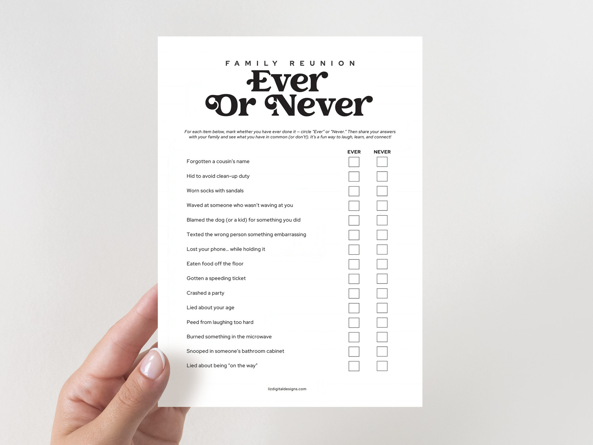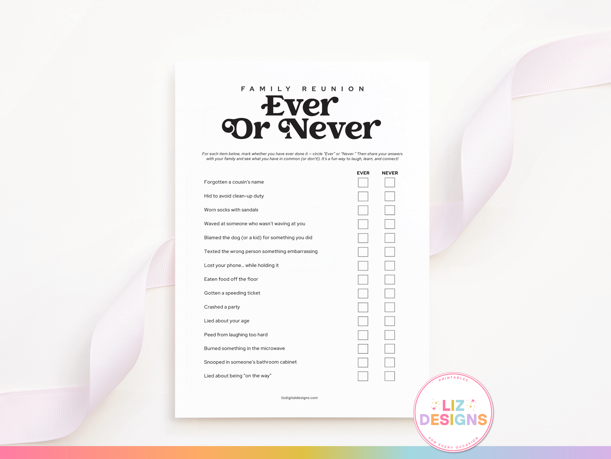 Get the laughter rolling with this hilarious π πππππ πππππππ β ππππ ππ πππππ game! It's perfect for your next family reunion, summer BBQ, or casual get-together! Guests mark βEverβ or βNeverβ for silly and surprising scenarios, then share their answers to see whoβs done what. Itβs the ultimate icebreaker game that reveals funny stories and sparks connections across all generations!