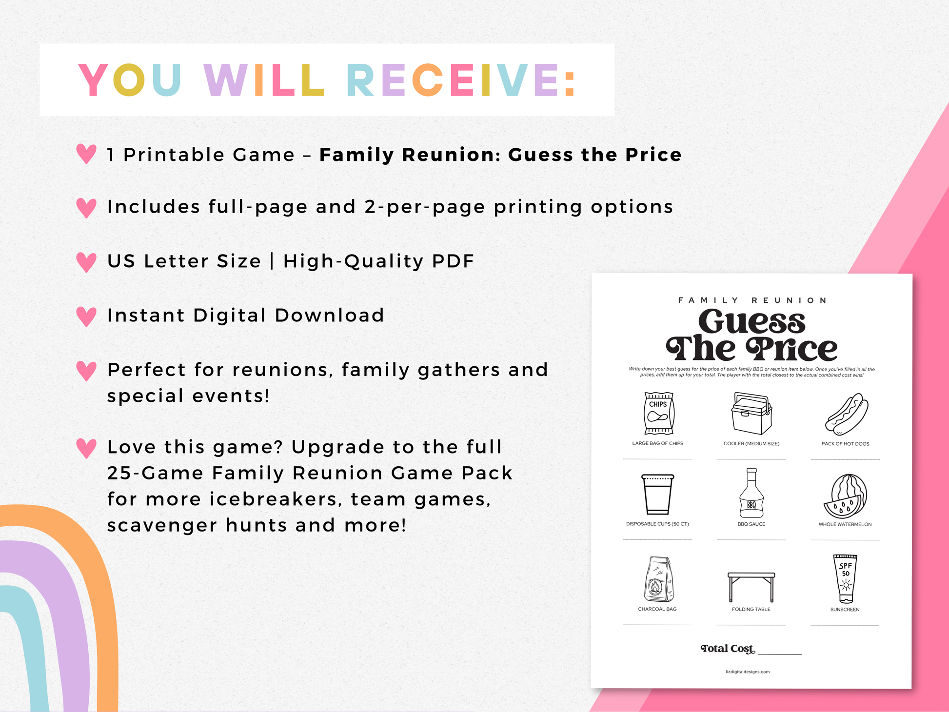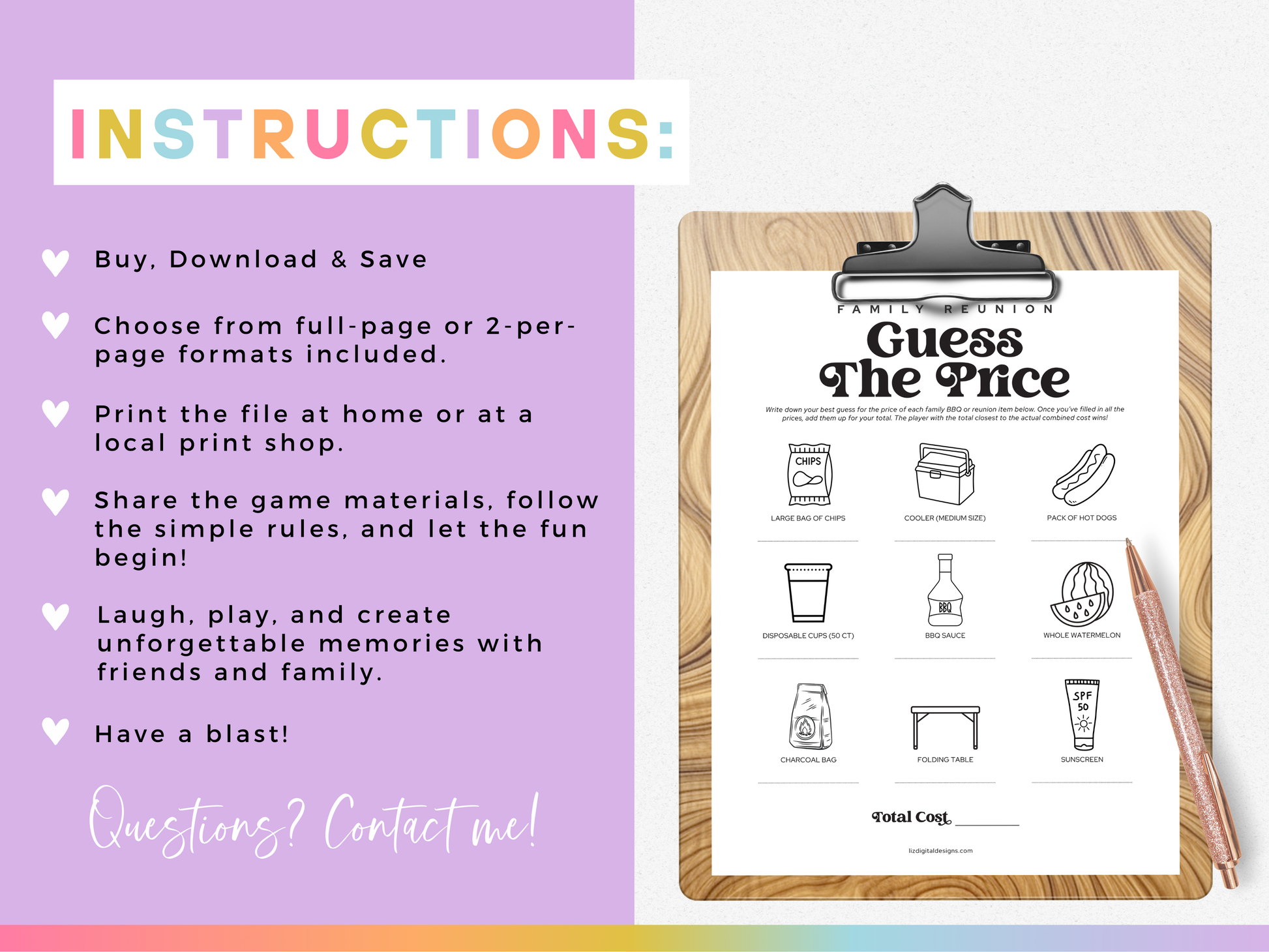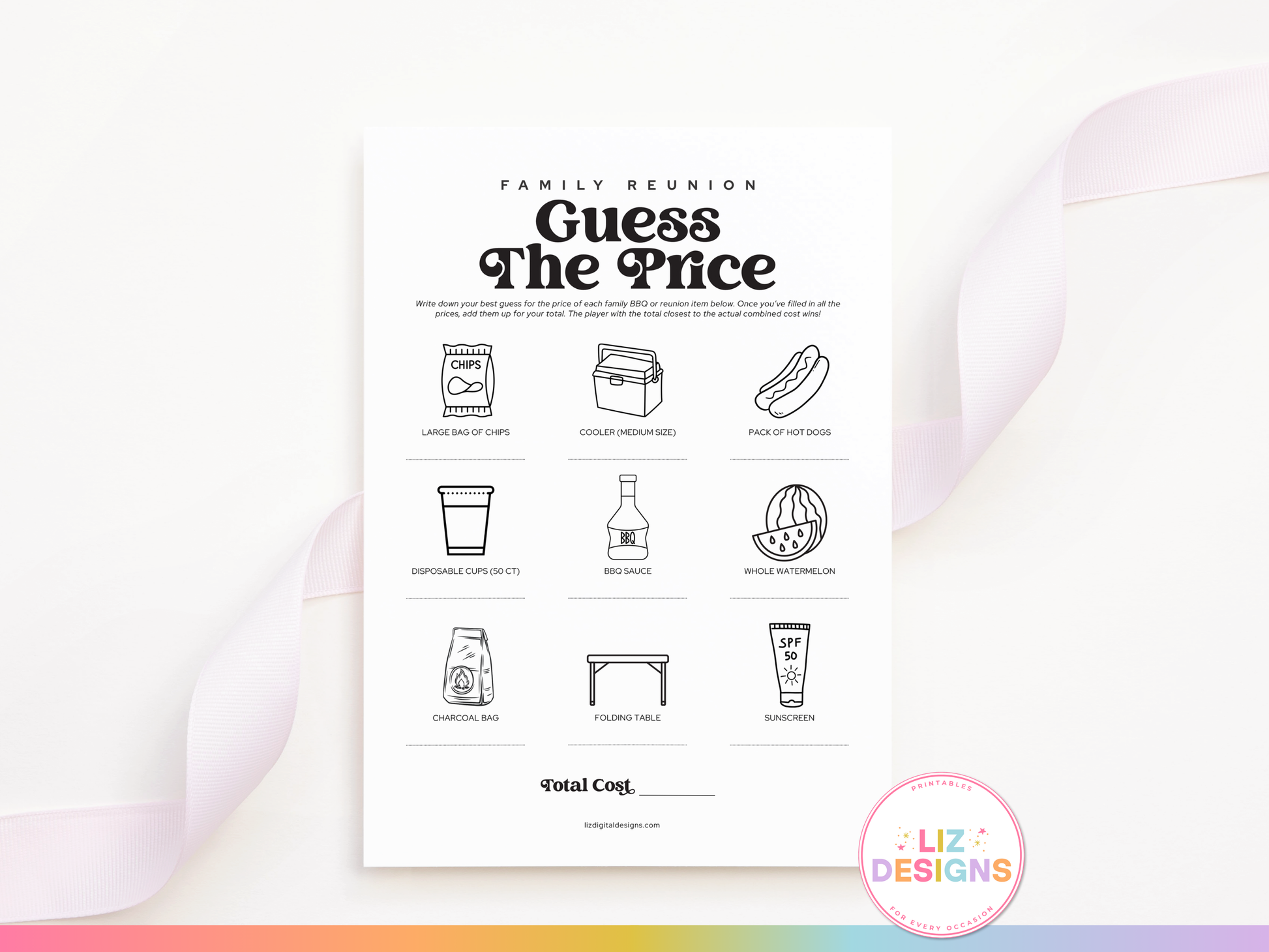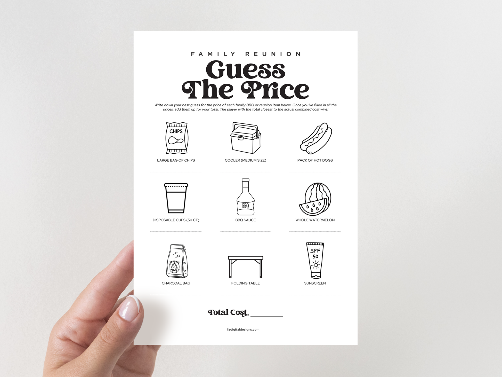 Ready to test your shopping smarts? This π πππππ πππππππ - πππππ πππ πππππ game is a fun and interactive addition to your next family reunion, picnic, or summer BBQ! Guests will guess the cost of classic reunion items. The player with the closest total wins!