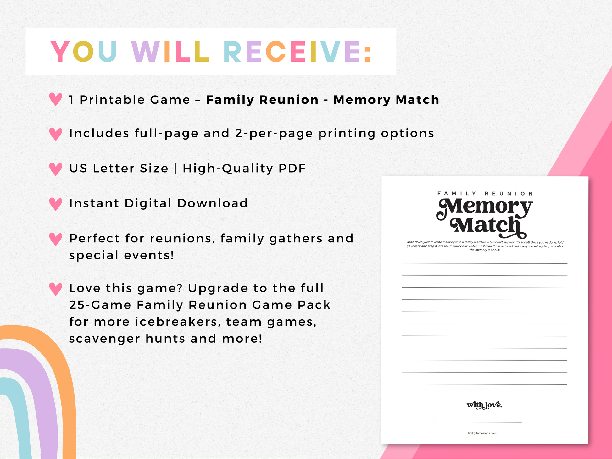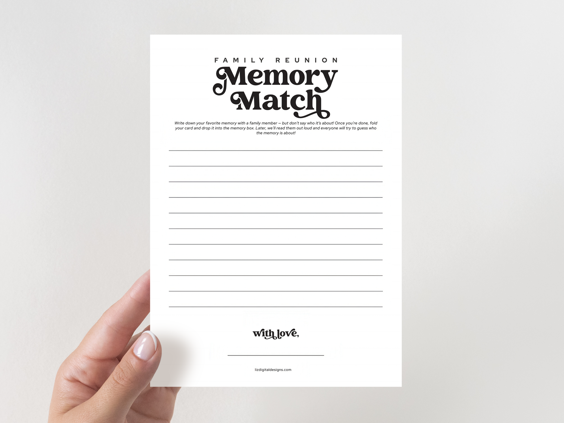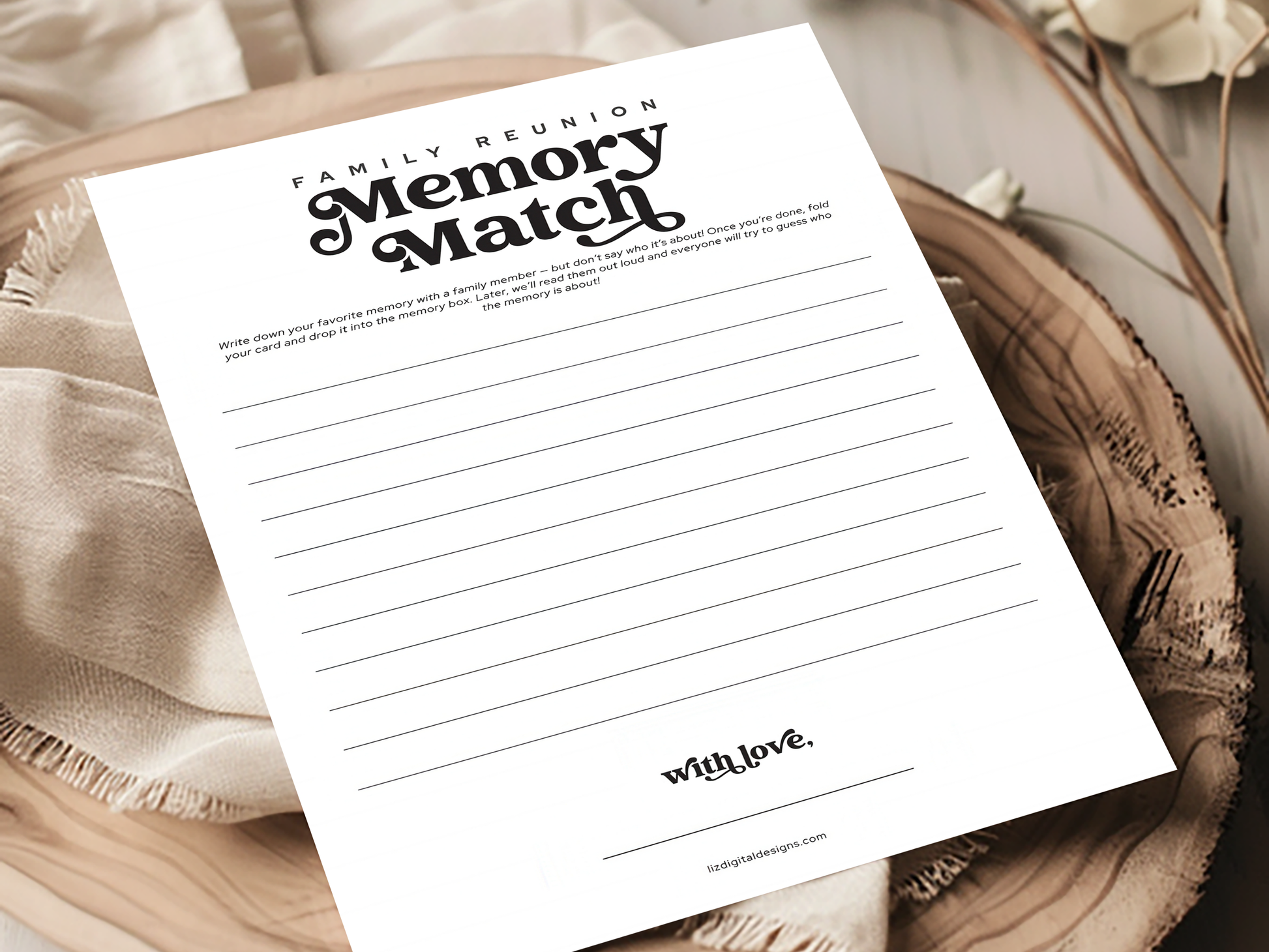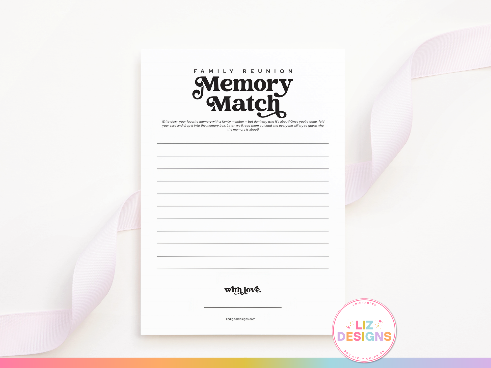 Capture the heart of your gathering with this sweet and simple π πππππ πππππππ - ππππππ πππππ game! Each guest writes down a favorite memory with a family member without revealing who itβs about. Later, take turns reading the memories aloud and guessing who itβs from! Itβs a meaningful icebreaker that sparks laughter, storytelling, and unforgettable moments.