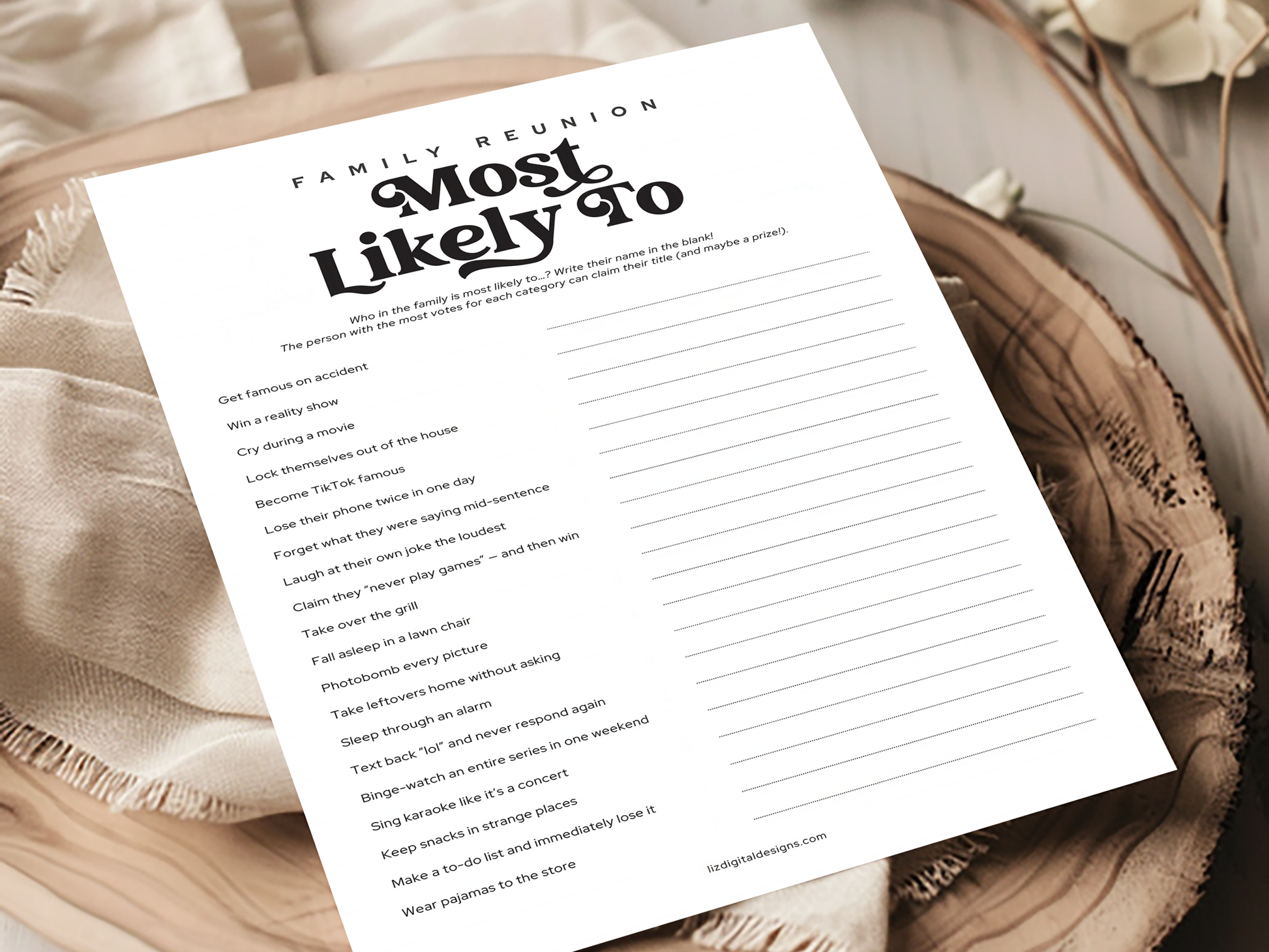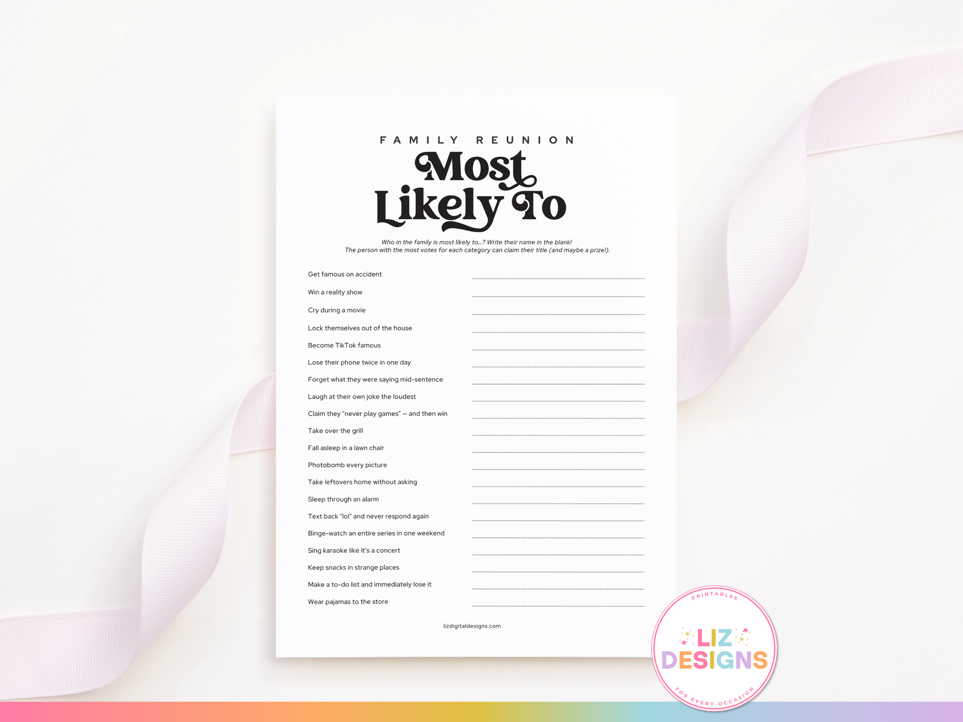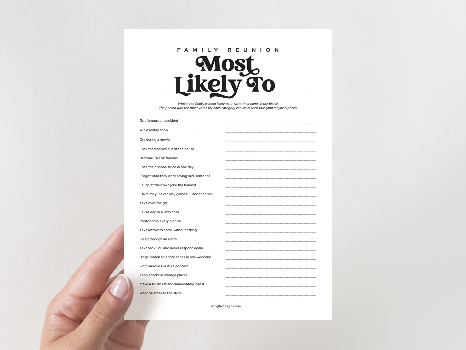 Who in the family is most likely to lock themselves outβ¦ or steal leftovers? This hilarious π πππππ πππππππ β ππππ ππππππ ππ game is the perfect icebreaker for all ages! Write in the names of your family members and let the laughs roll as the group decides who fits each title best.