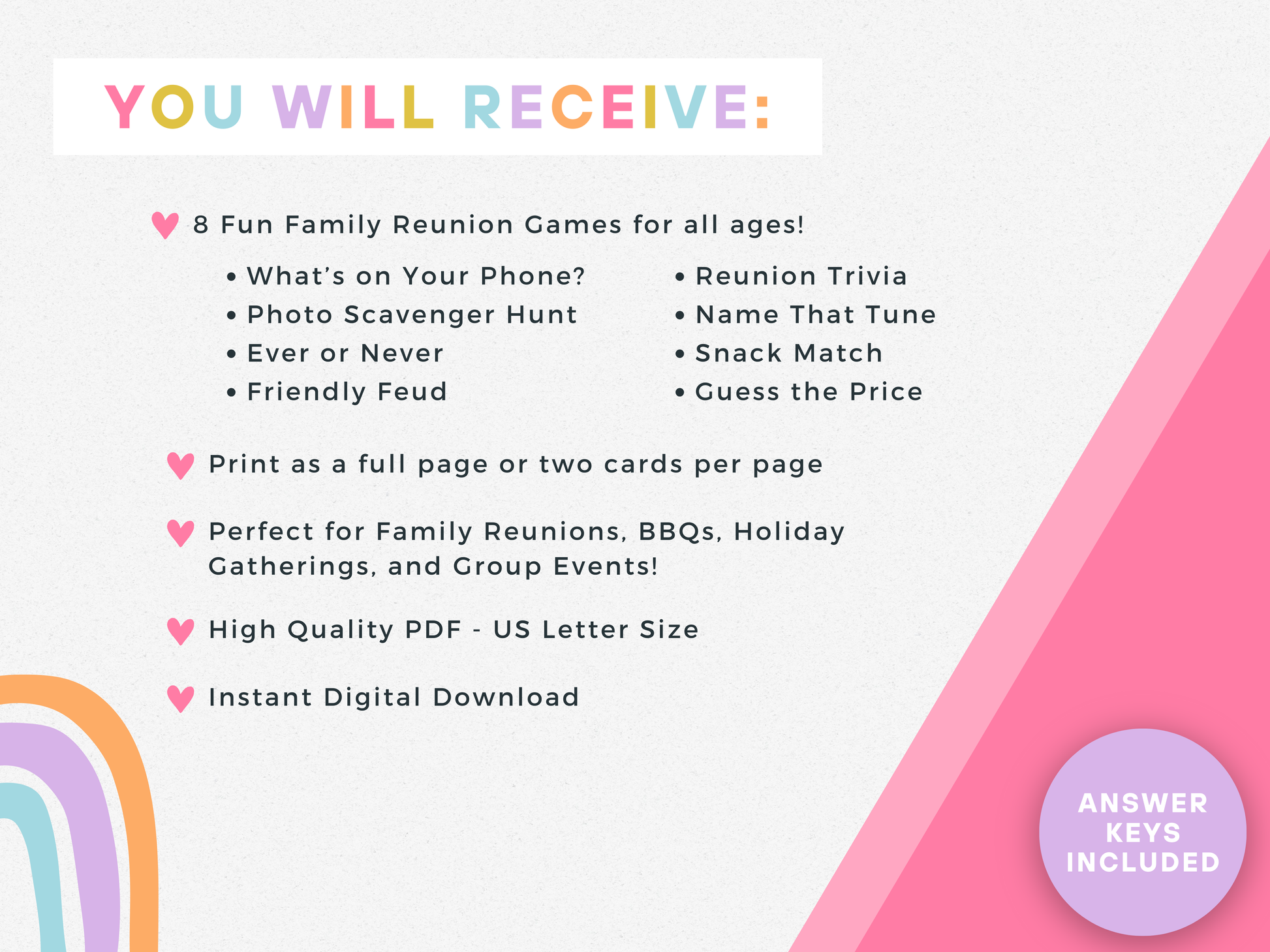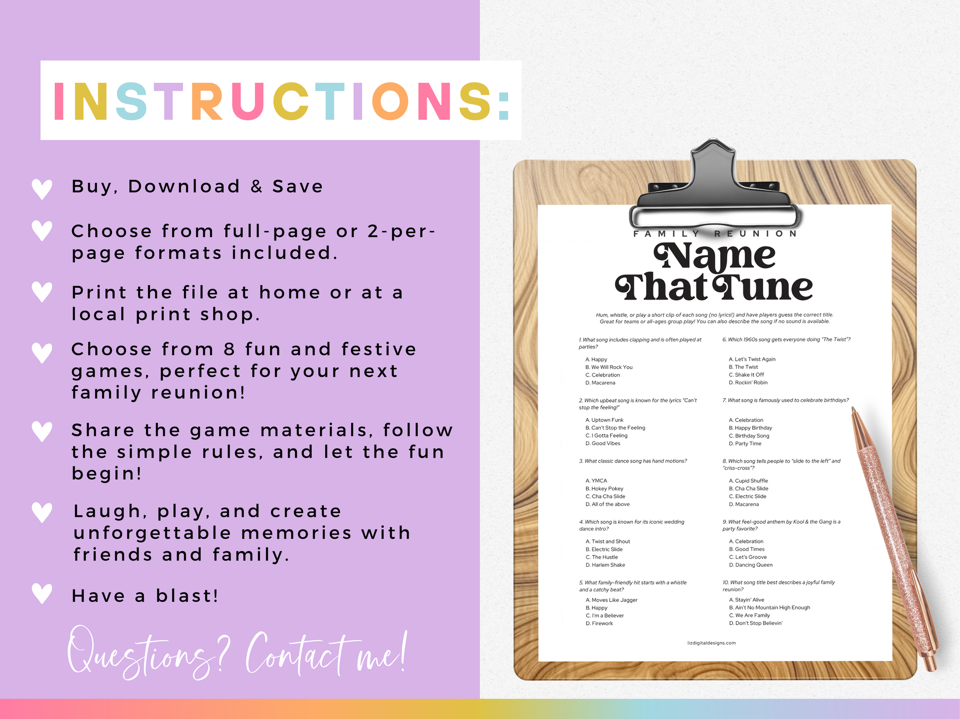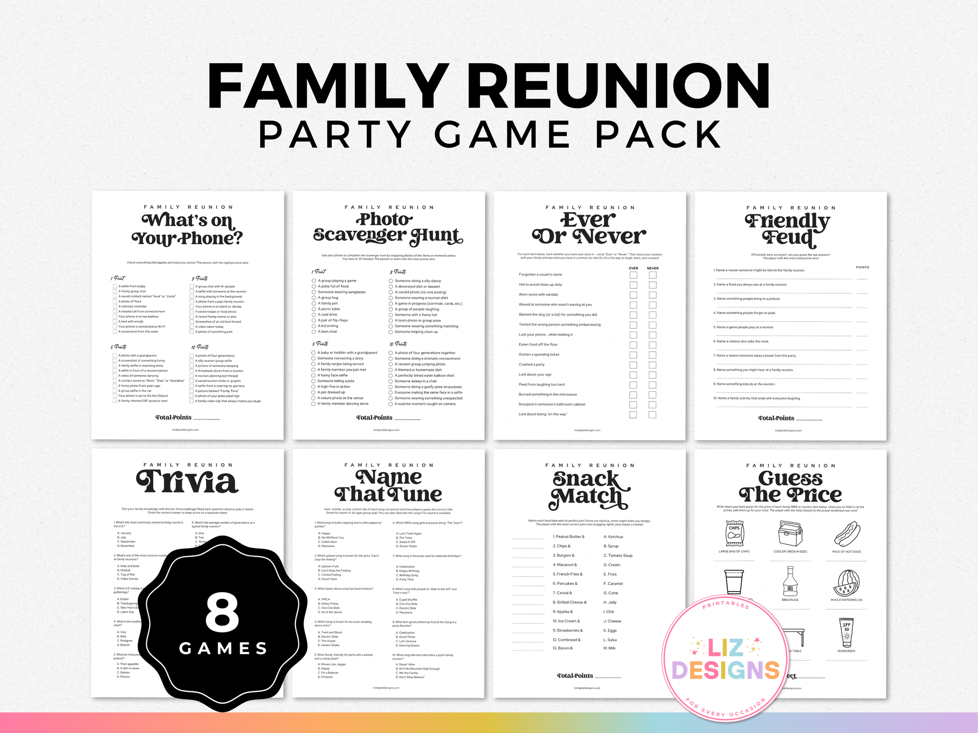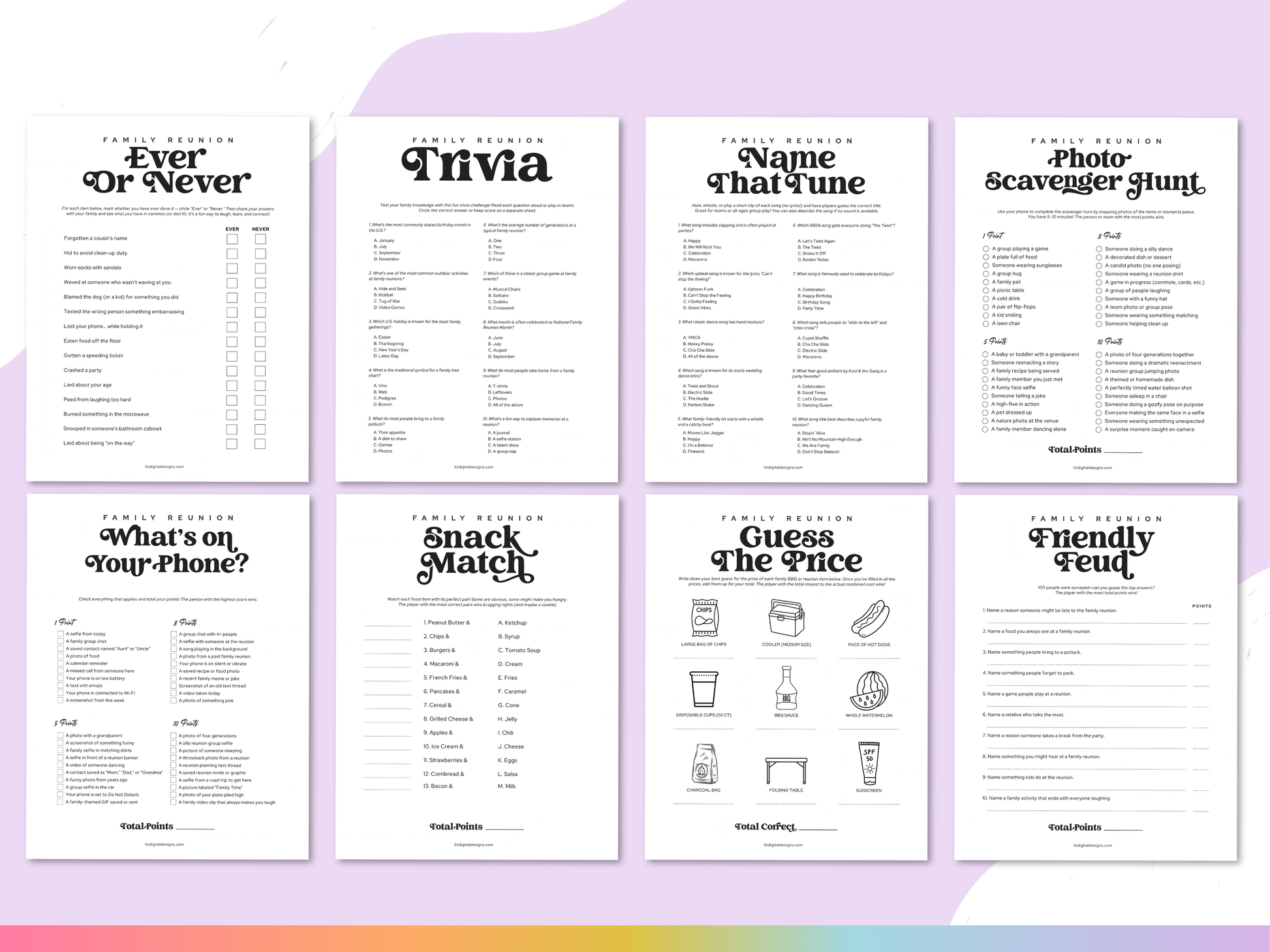 Featuring crowd-favorite games like trivia, name that tune, and a price guessing challenge, this bundle is designed to create connection and fun for all ages. Just download, print, and play!