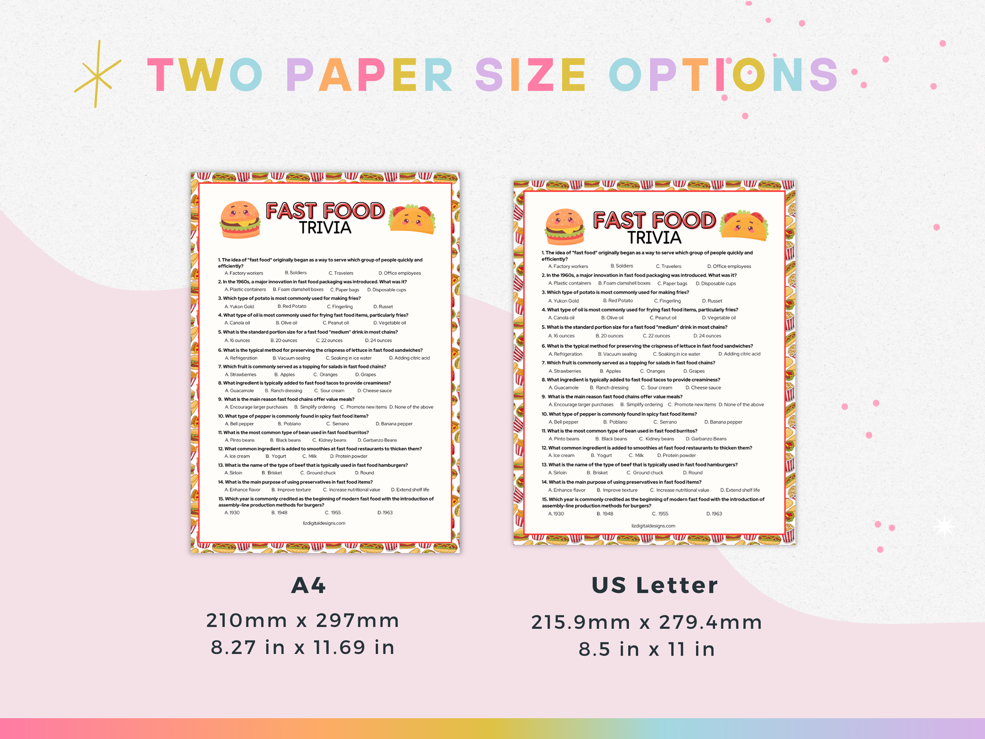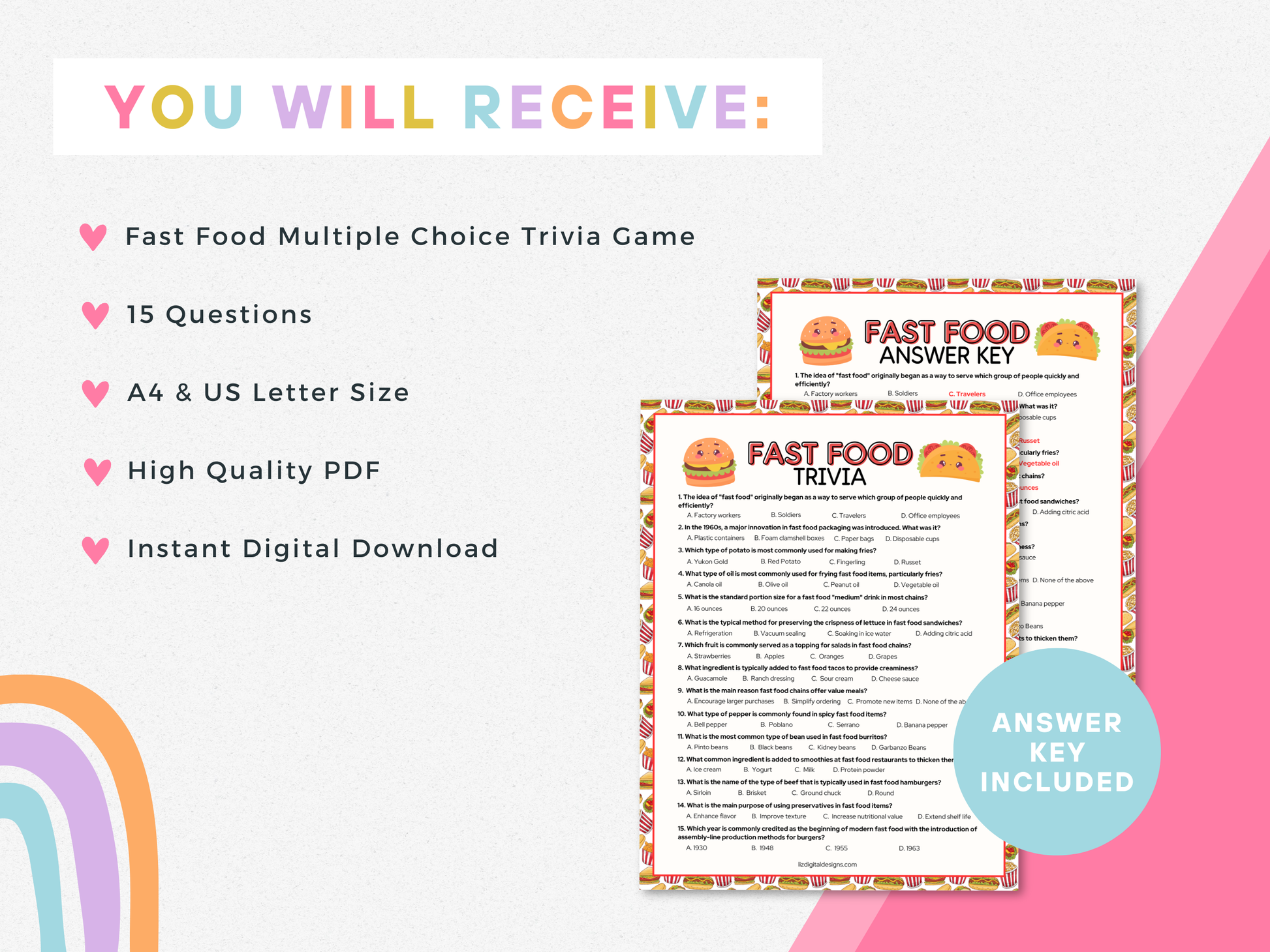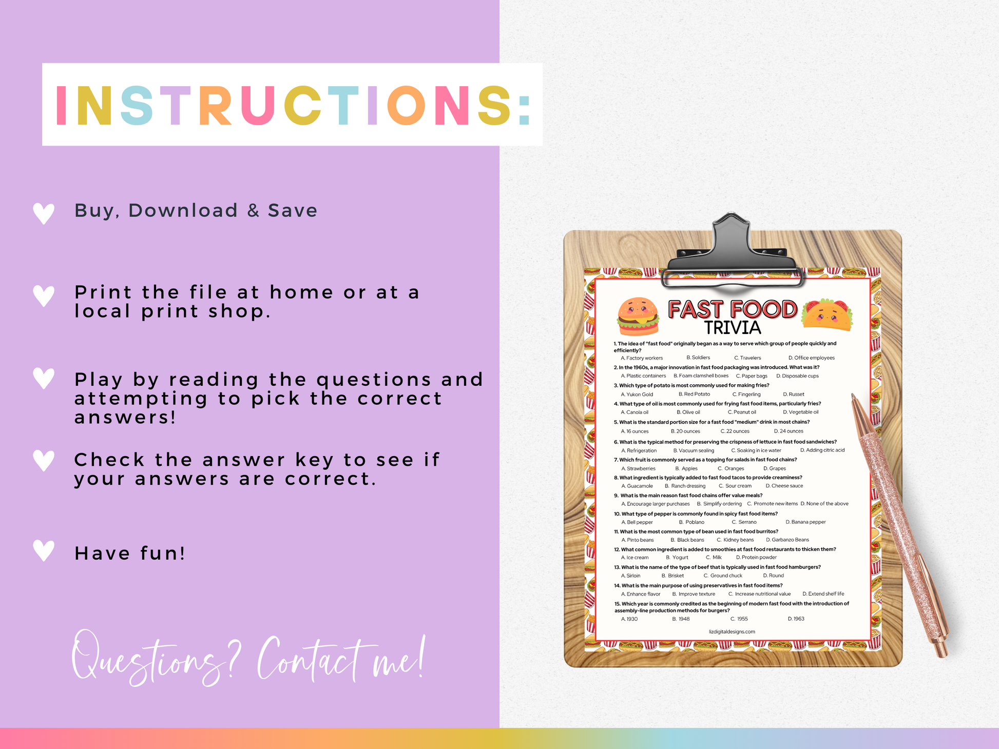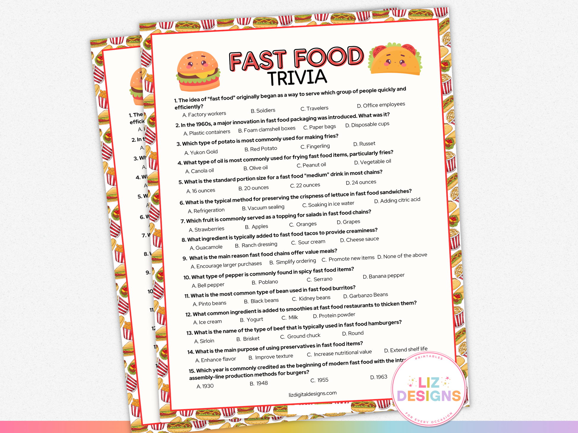 π Group Play: Distribute the trivia sheets to each player or team. Take turns answering the questions and see who knows the most about fast food! The player/team with the most correct answers wins.