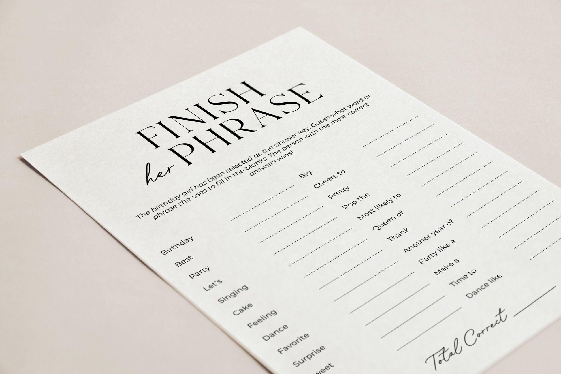 Test how well your guests know the birthday girl with this π πππππ πππ ππππππ ππππ - ππππππππ ππππ πππππππ! Players will guess how the birthday girl completes each phrase, and the person with the most correct matches wins! This simple and easy game is perfect for any group birthday party, girlsβ night, or adult birthday celebration!