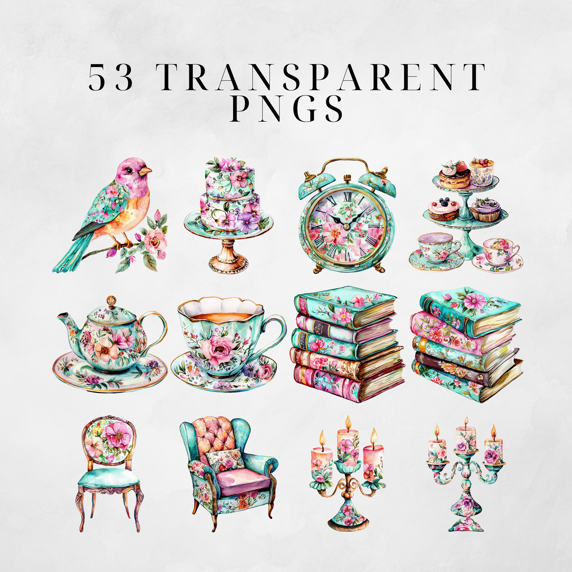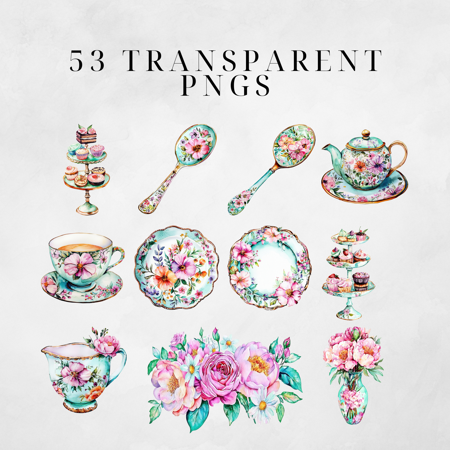 Step into a world of elegance with this π πππππ πππ πππππ πππππππ ππππ, featuring 52 transparent PNGs in high-resolution watercolor designs. Perfect for creating tea party invitations, vintage tea party decorations, and garden tea party printables, this collection includes beautiful teacups, teapots, floral plates, desserts, butterflies and charming birds for an exquisite touch.