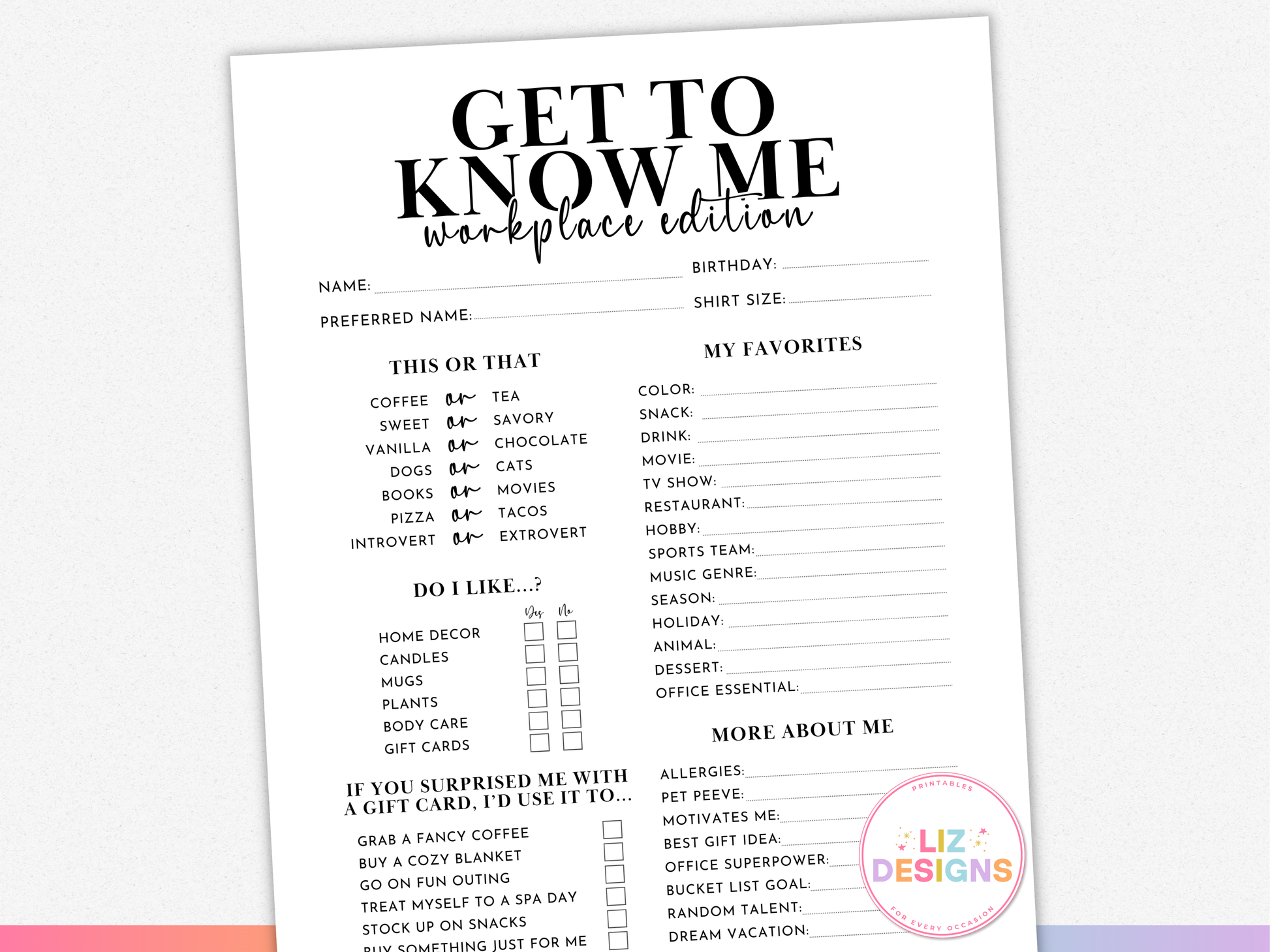 π Get to Know Me Questionnaire (Workplace Edition) Printable