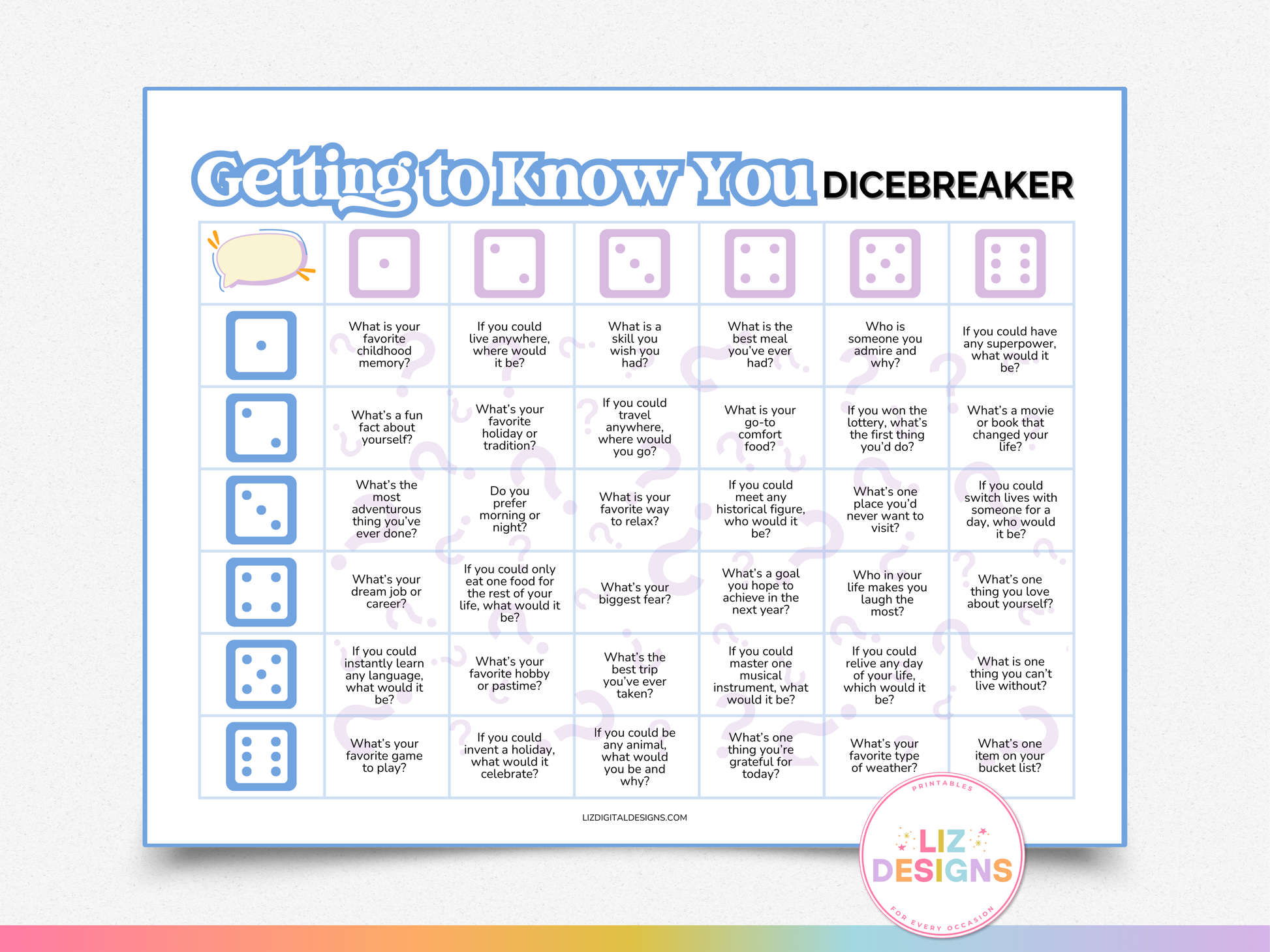 Break the ice and spark meaningful conversations with the πππππππ ππ ππππ πππ πππππππππππ ππππ! Perfect for groups of all ages, this printable icebreaker combines the fun of dice rolling with engaging icebreaker questions that are ideal for parties, team building, and family gatherings. Whether itβs an office party game, a family reunion, or a casual group hangout, this conversation starter will get everyone talking and laughing!