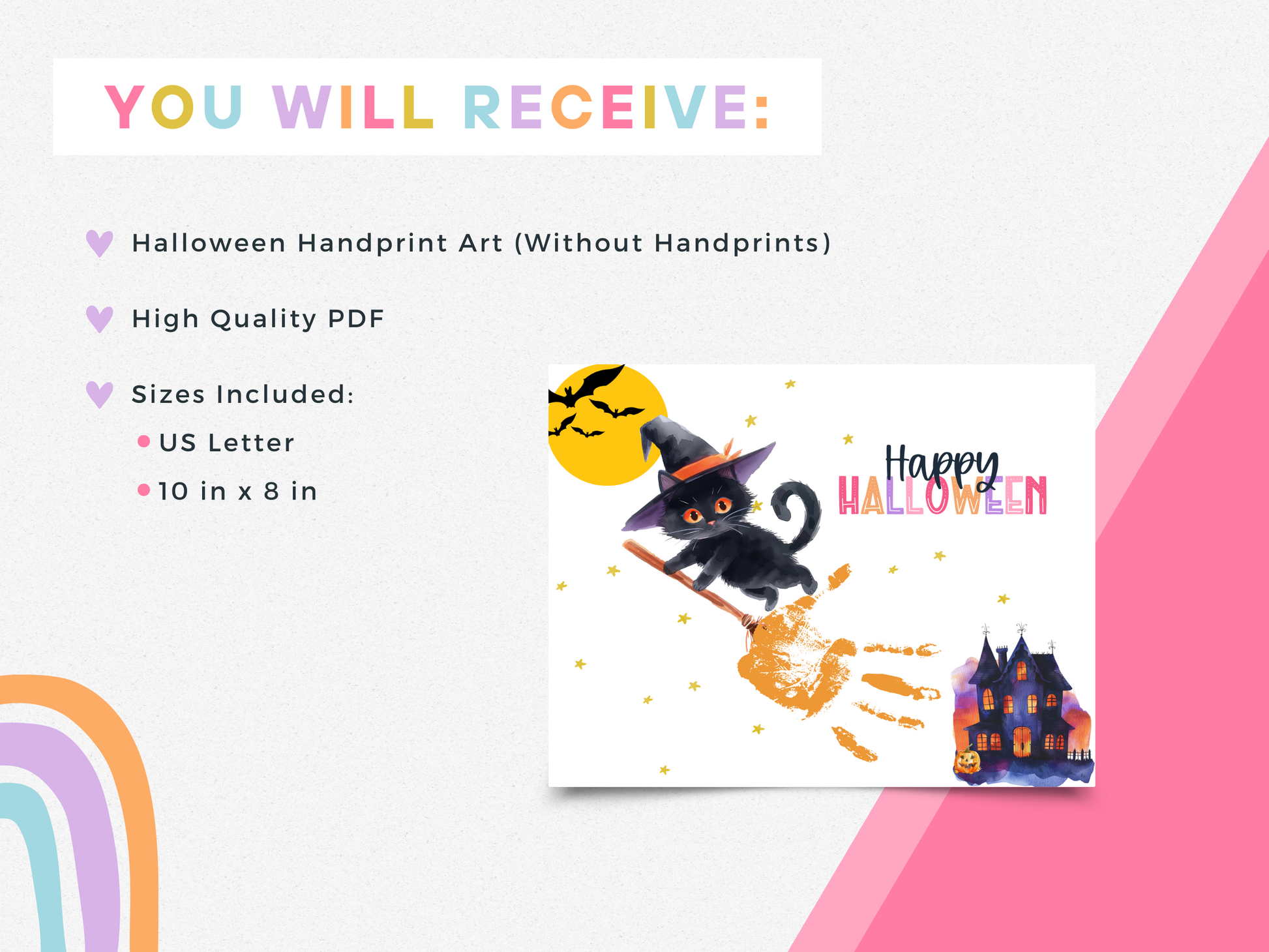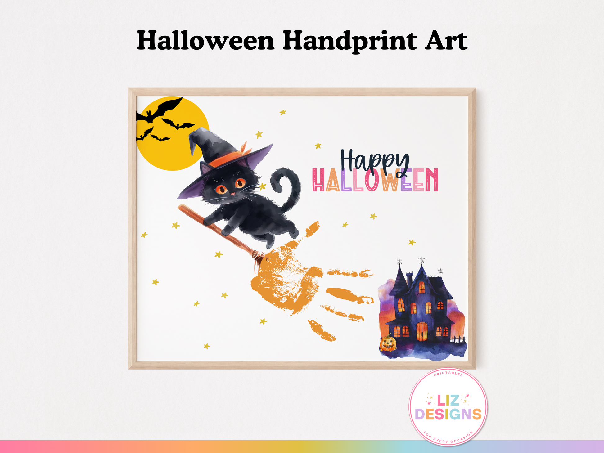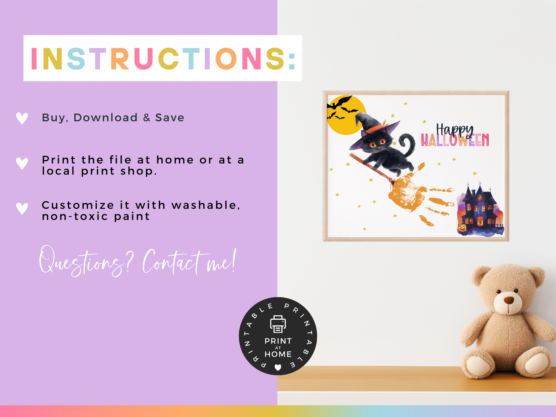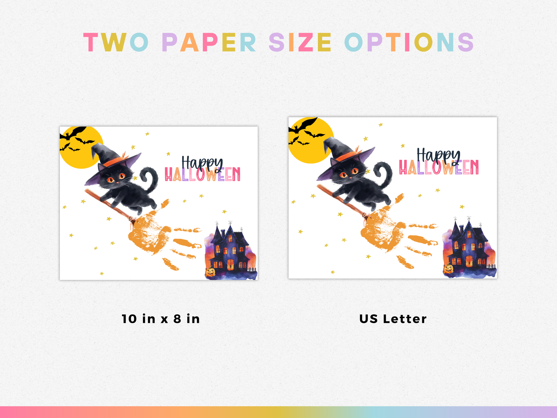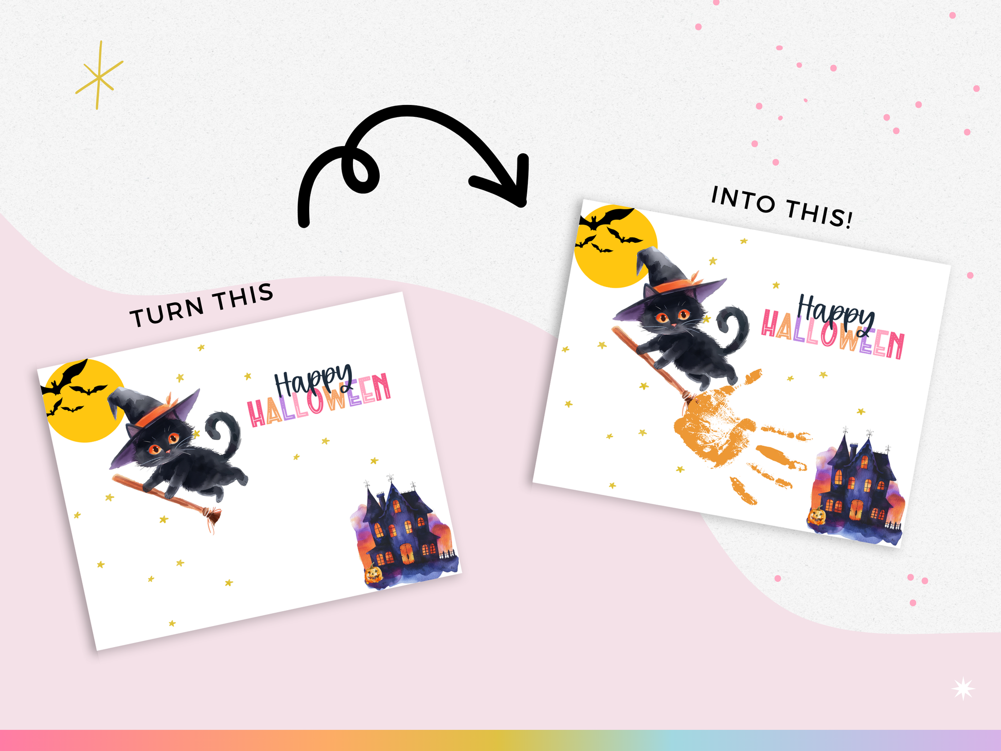 Create lasting memories this Halloween with this πππππππππ πππππππππ πππ featuring an adorable black cat flying through the night sky on a witch's broom! Capture your little oneβs handprint or footprint and turn it into a cherished fall handprint craft that can be used year after year as festive Halloween decor.