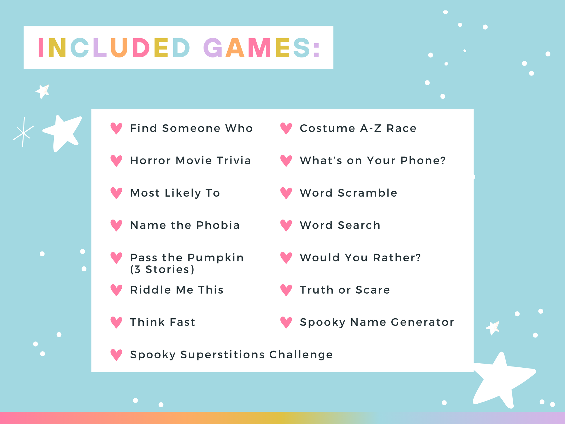Get ready for a fun-filled Halloween party with the πππππππππ πππππ ππππ ππππ! Featuring 15 exciting games, this pack is perfect for both kids and adults, making it a great addition to any Halloween celebration. Whether you're hosting a party or family gathering, these games will bring hours of entertainment.