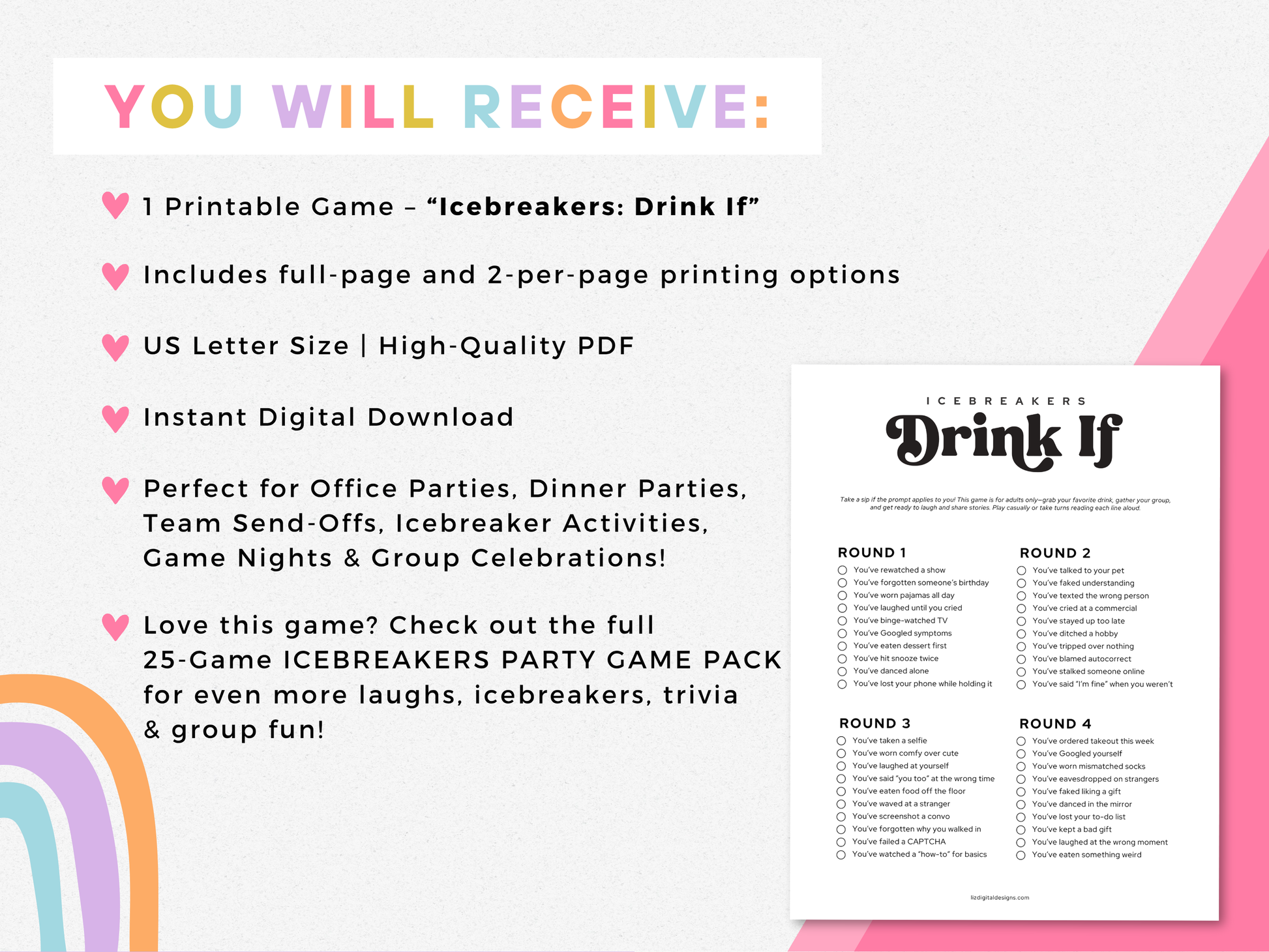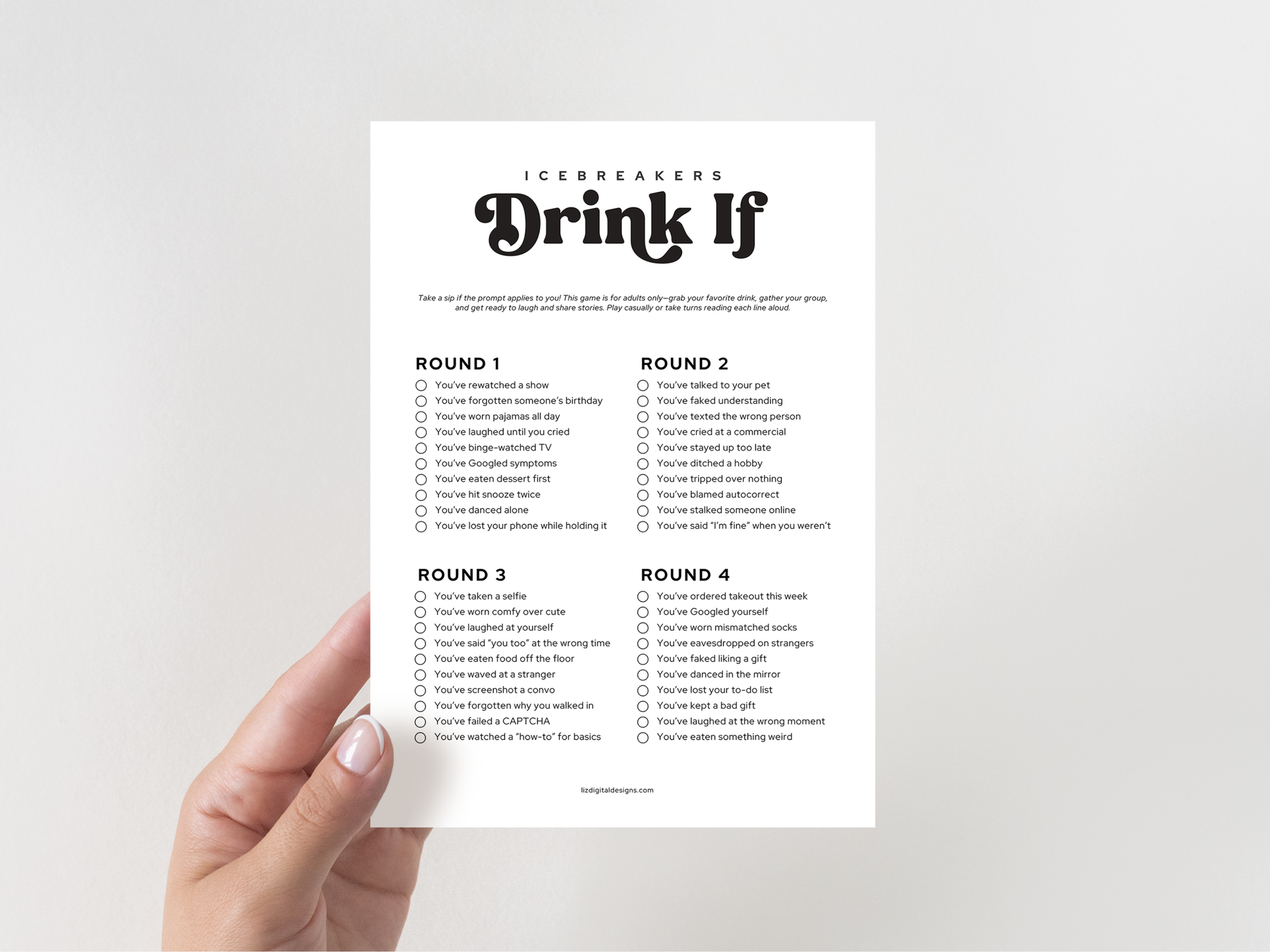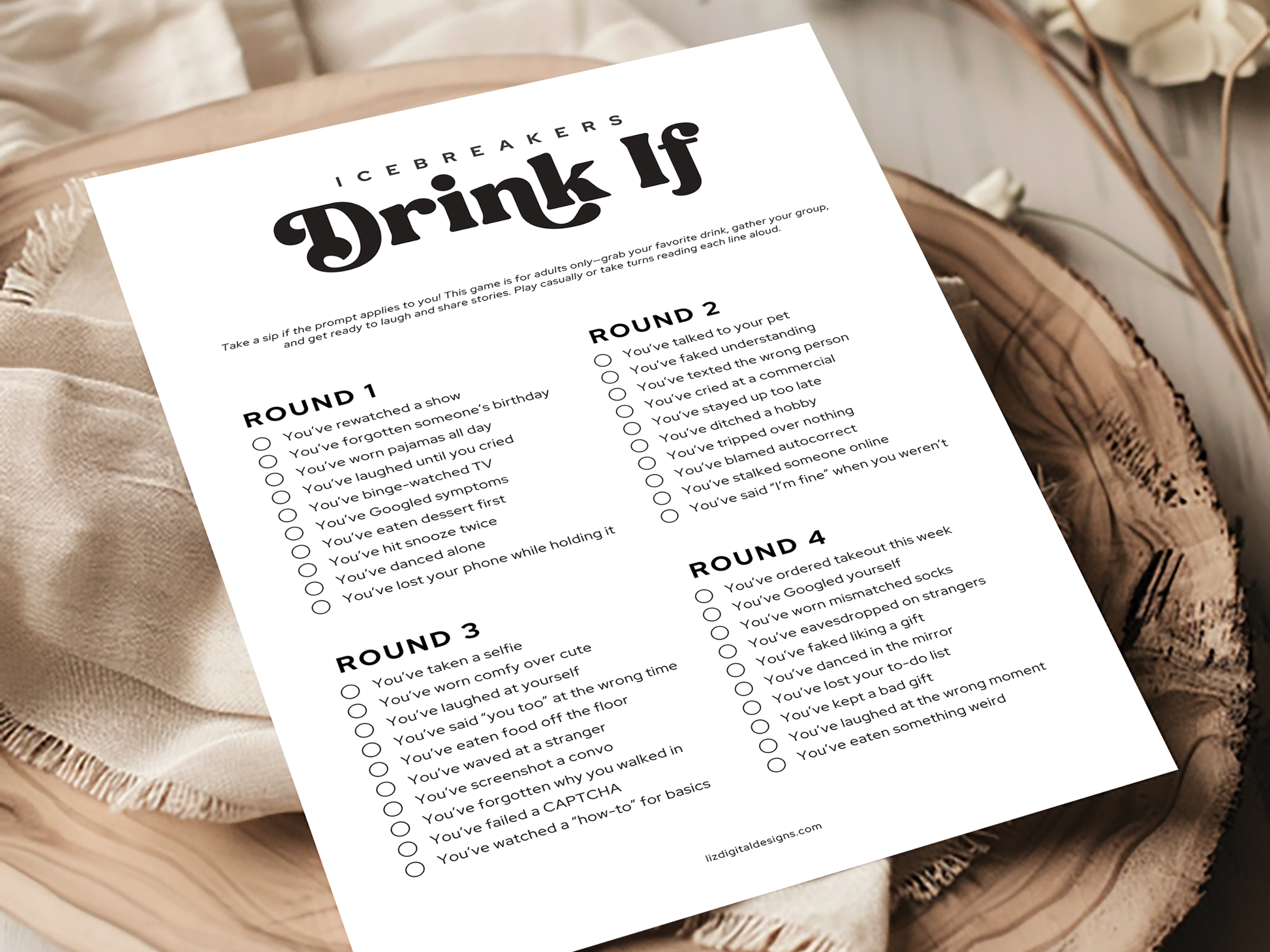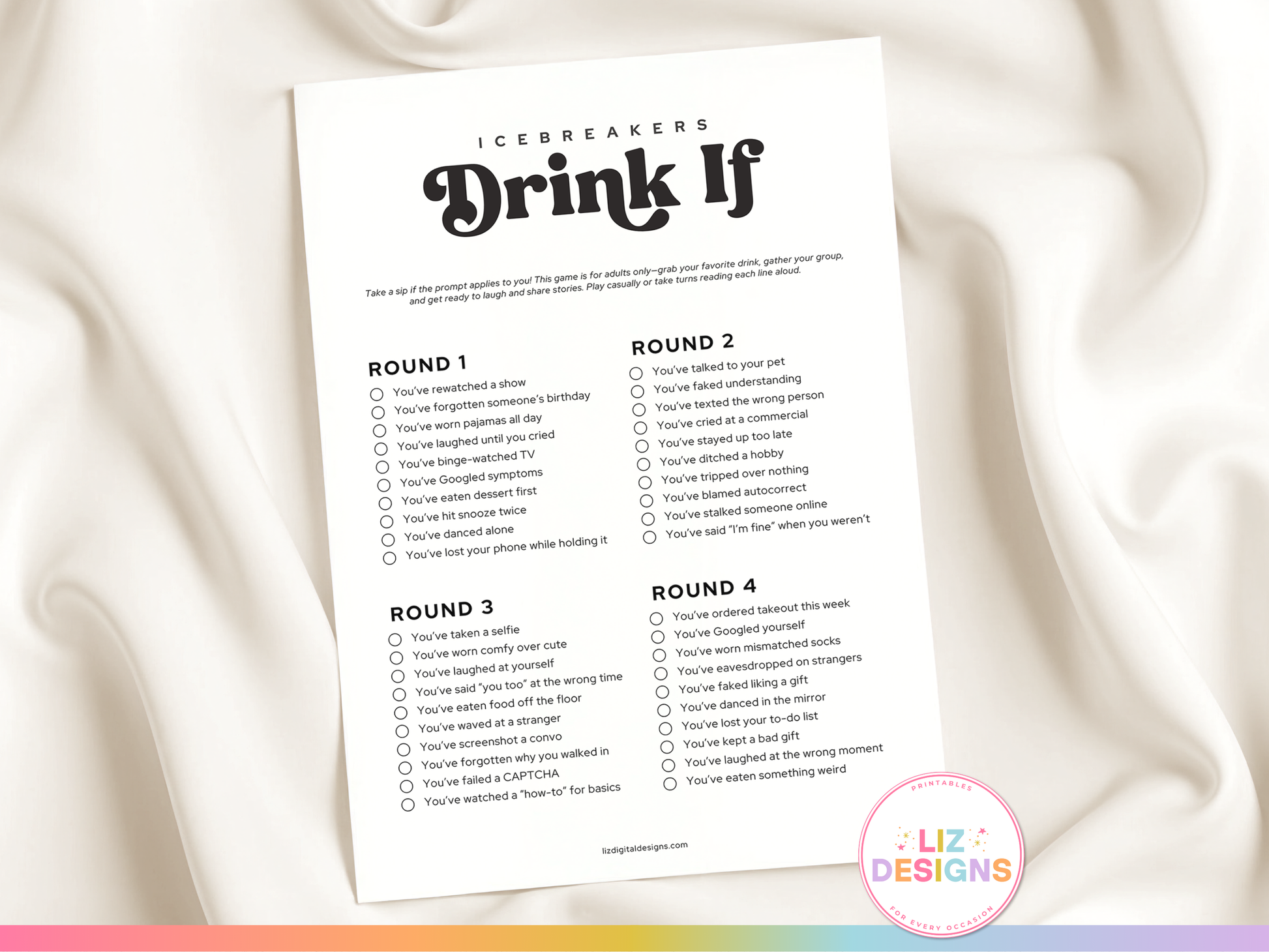 Take a sip and break the ice! This fun and relatable πππππππππππ: πππππ ππ game is the perfect party-starter for adults. Whether youβre hosting a game night, girls night, happy hour, or just want some good laughs, this printable game brings the fun. With 40 hilarious prompts across four rounds, everyone will have a chance to share, sip, and connect. Great for casual gatherings or as an icebreaker at dinner parties, this game is easy to play!