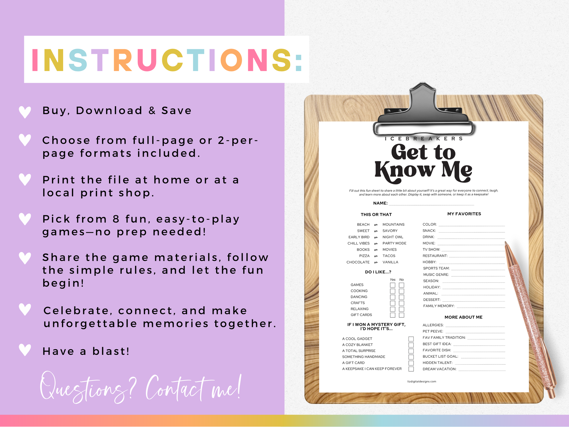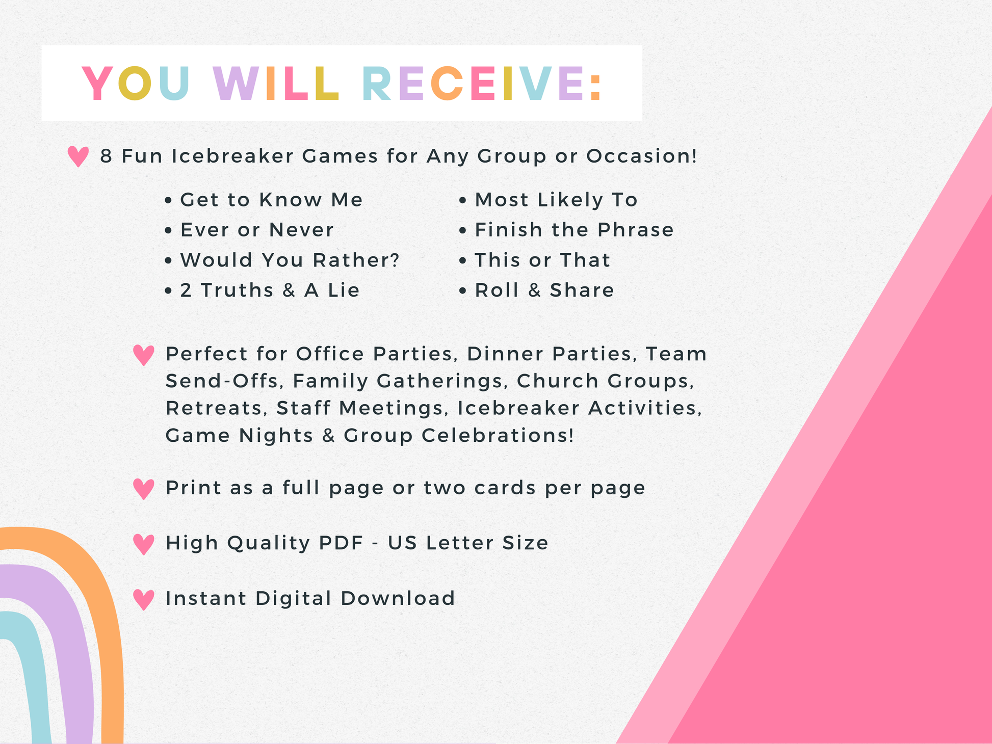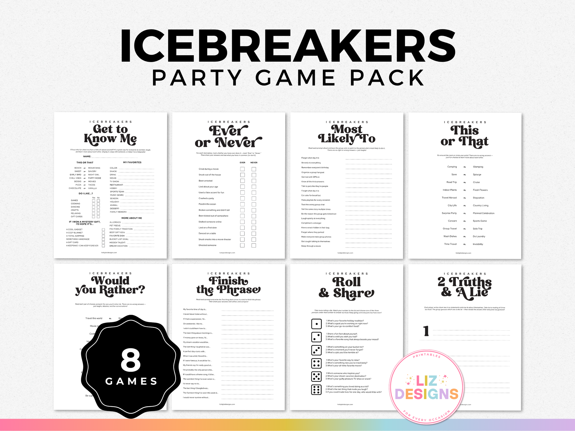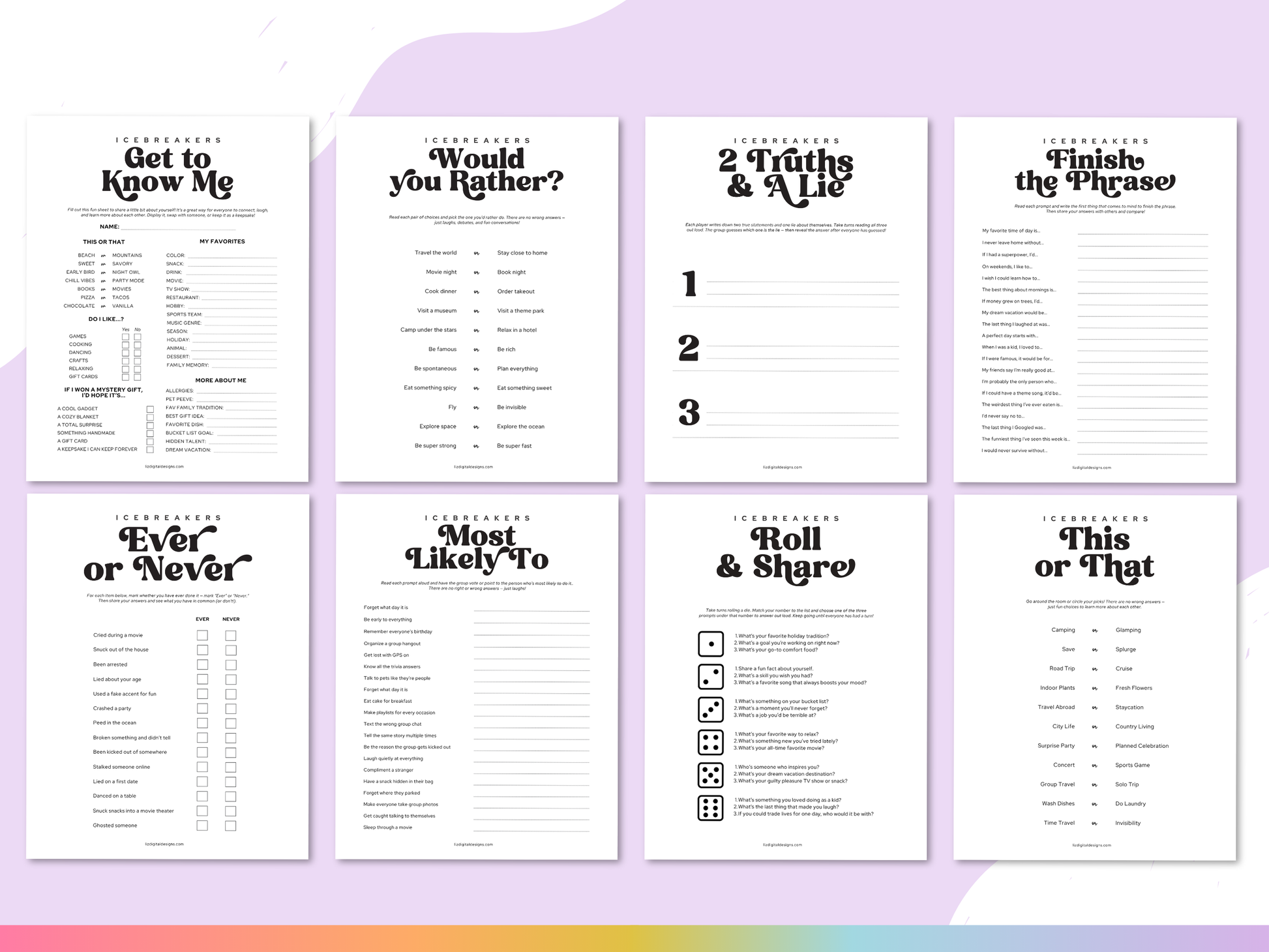 Break the ice and get your guests laughing with the πππππππππππ πππππ ππππ ππππ! This printable bundle includes 8 fun and easy games to spark conversations, share stories, and create connection. Perfect for all types of gatherings from casual dinners and birthday parties to office events and family reunions. Inside youβll find get-to-know-you favorites like Get to Know Me, Ever or Never, Would You Rather, Roll & Share, and more!