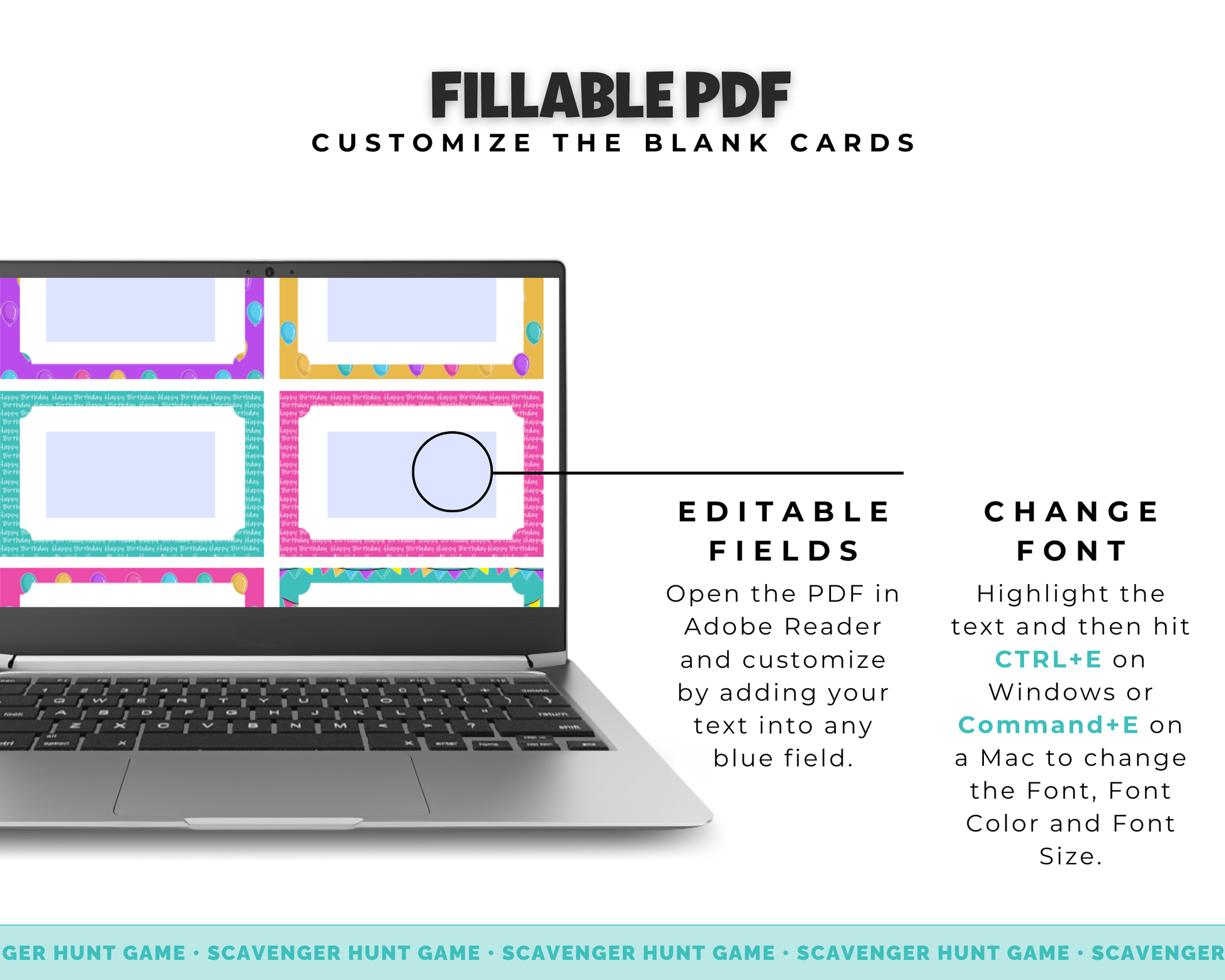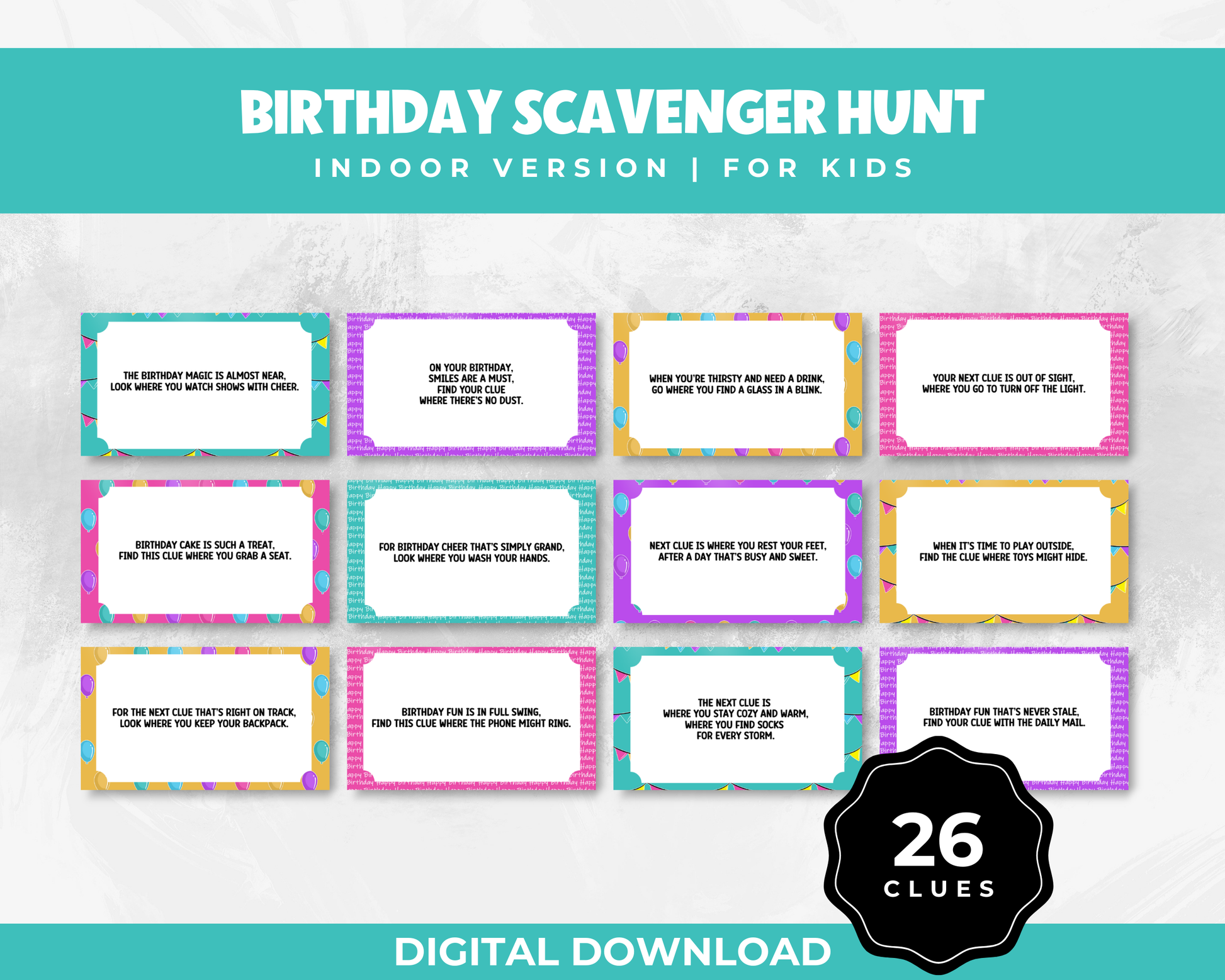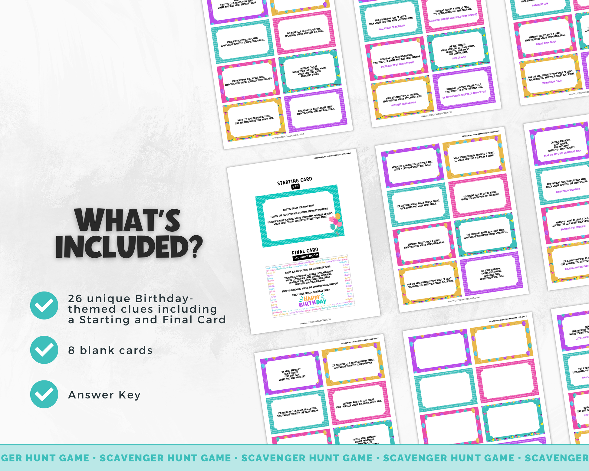 π 26 Clue Cards: 26 unique Birthday-themed clues, including a starting card and a final card to guide the hunt from beginning to end