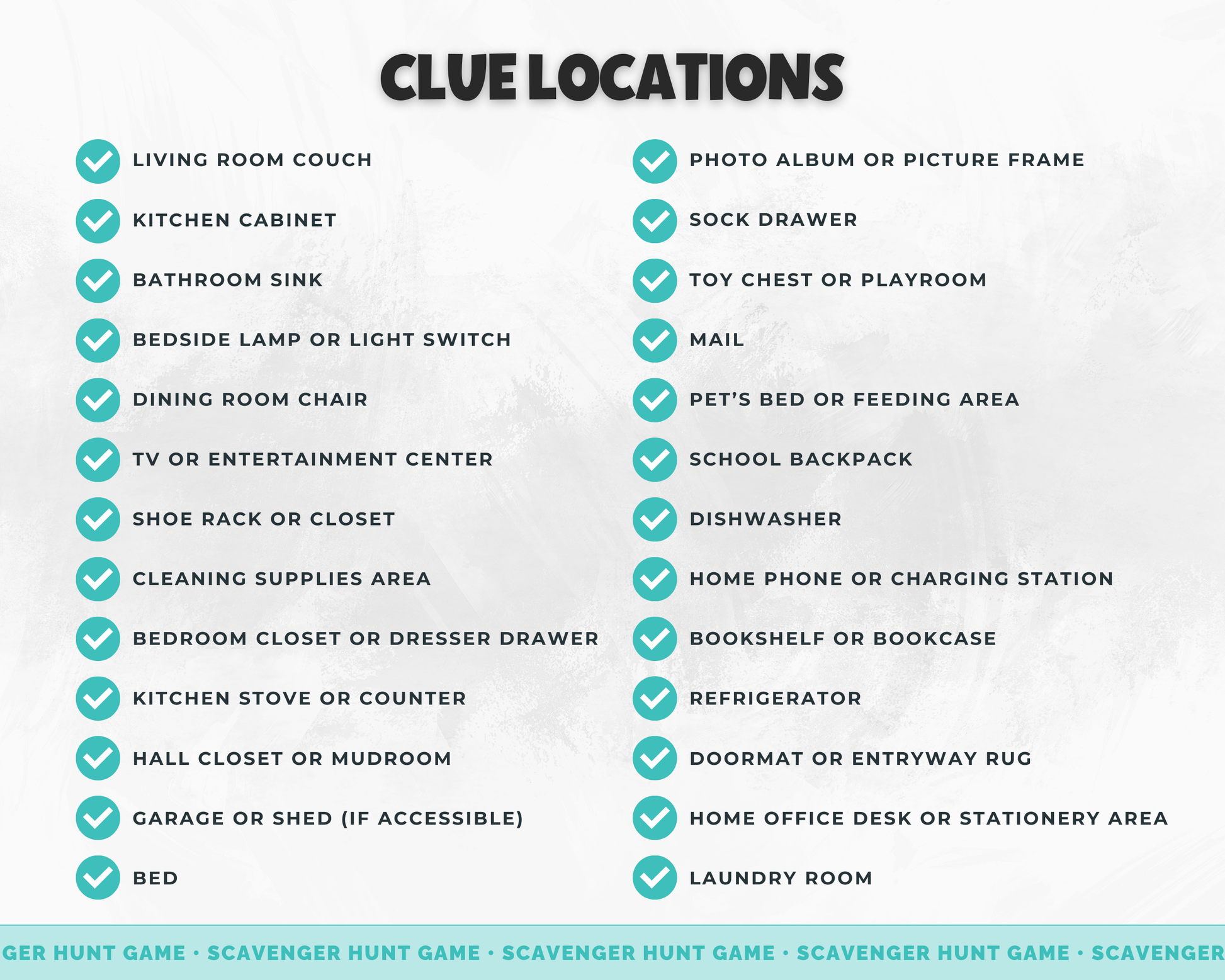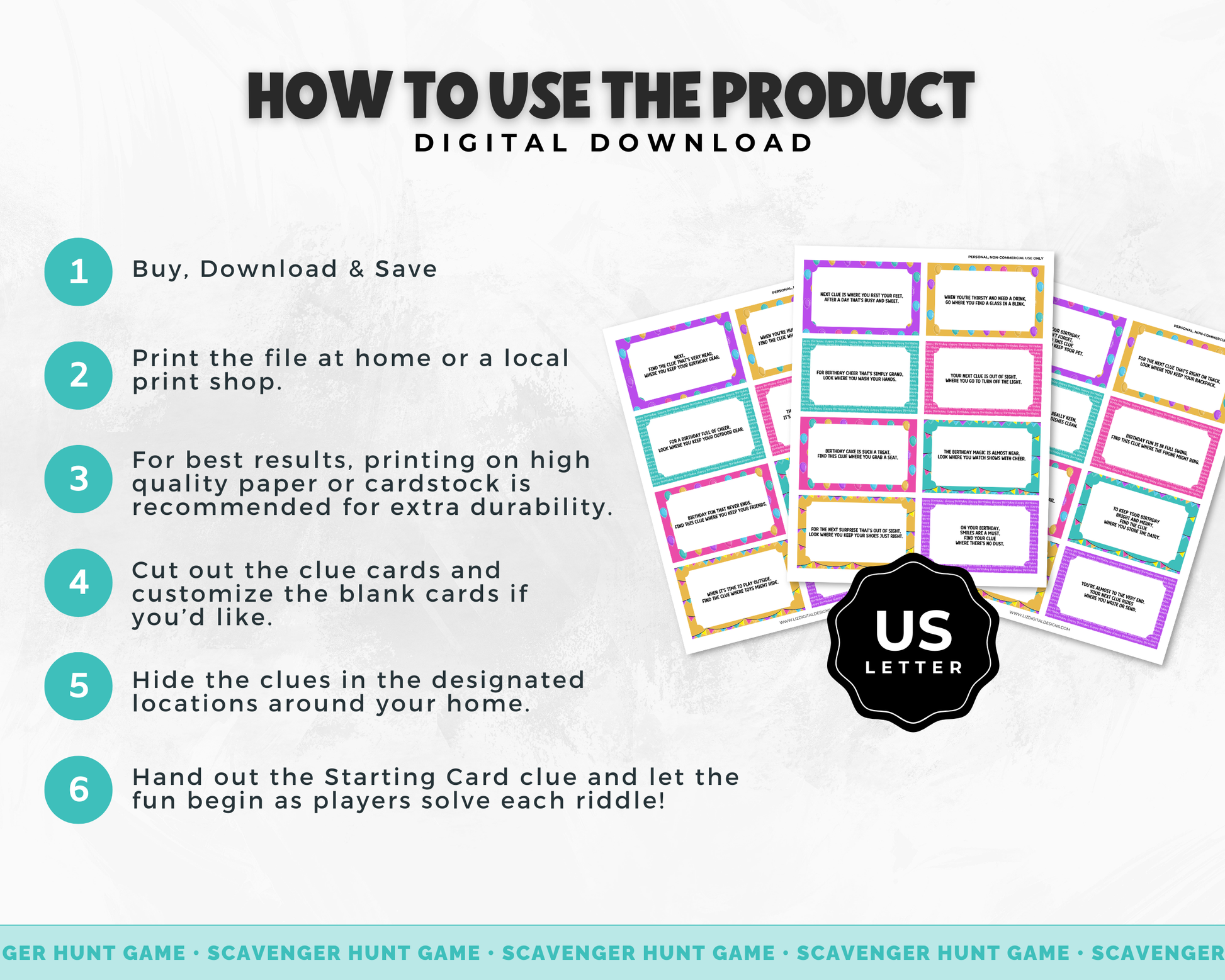 π Hand out the Starting Card clue and let the fun begin as players solve each riddle and find the hidden items, leading them to the Final Card and their ultimate prize!