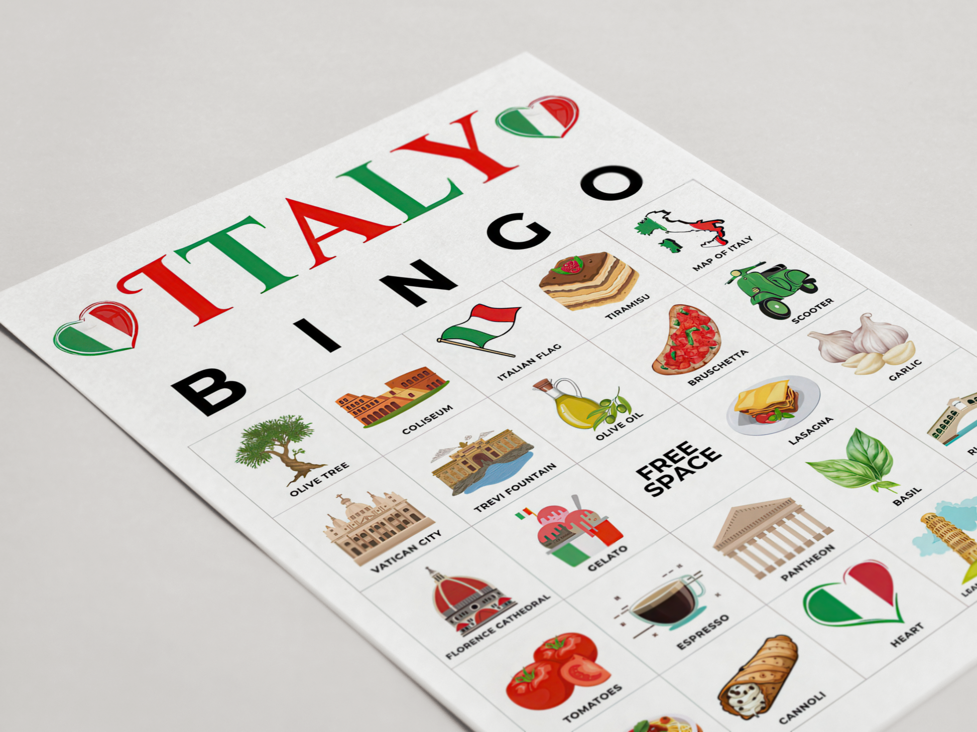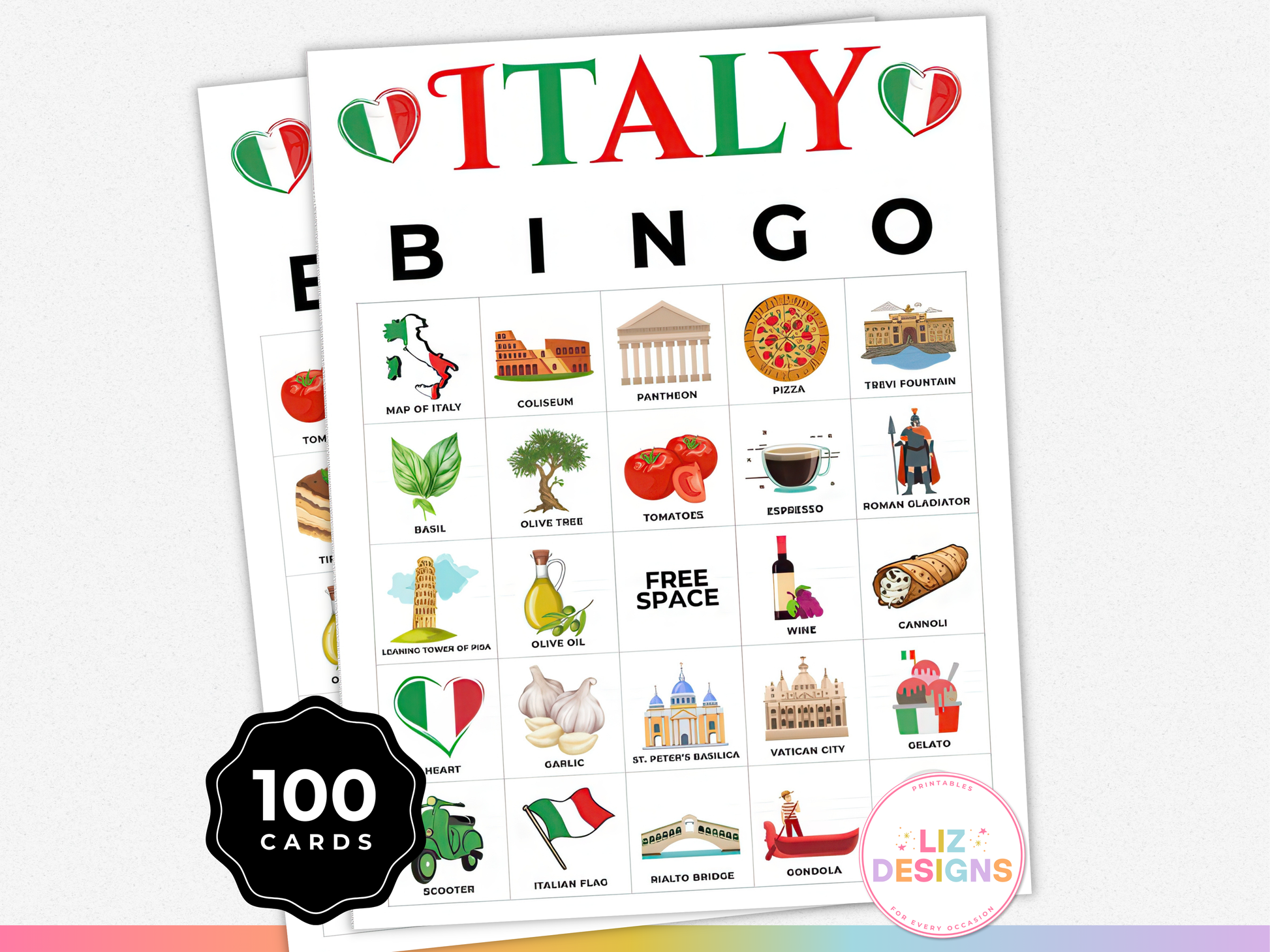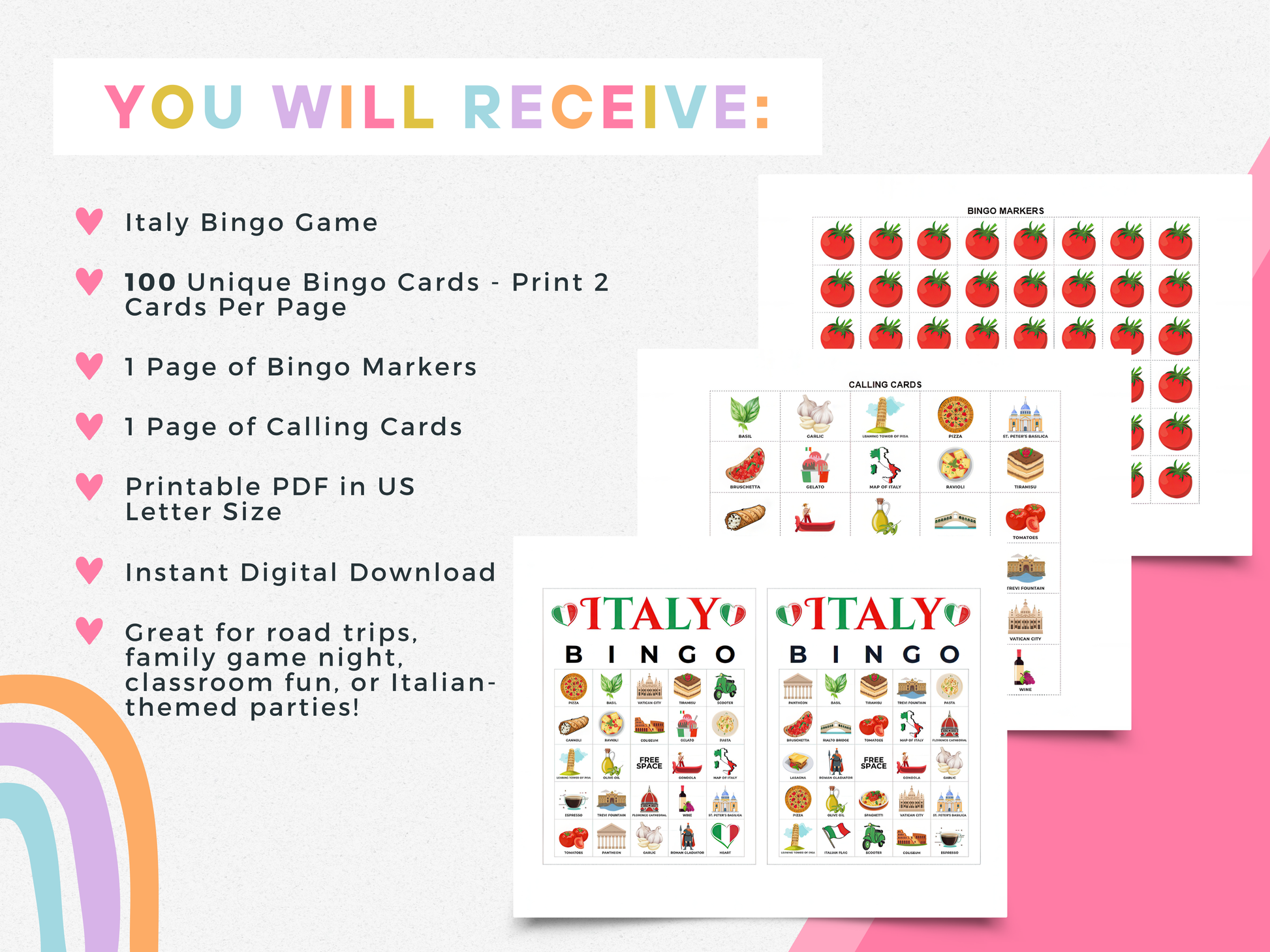 With 100 unique bingo cards, charming Italian icons (think pizza, pasta, landmarks, and more), plus calling and marker sheets, this instant download is a great way to entertain groups of all ages.