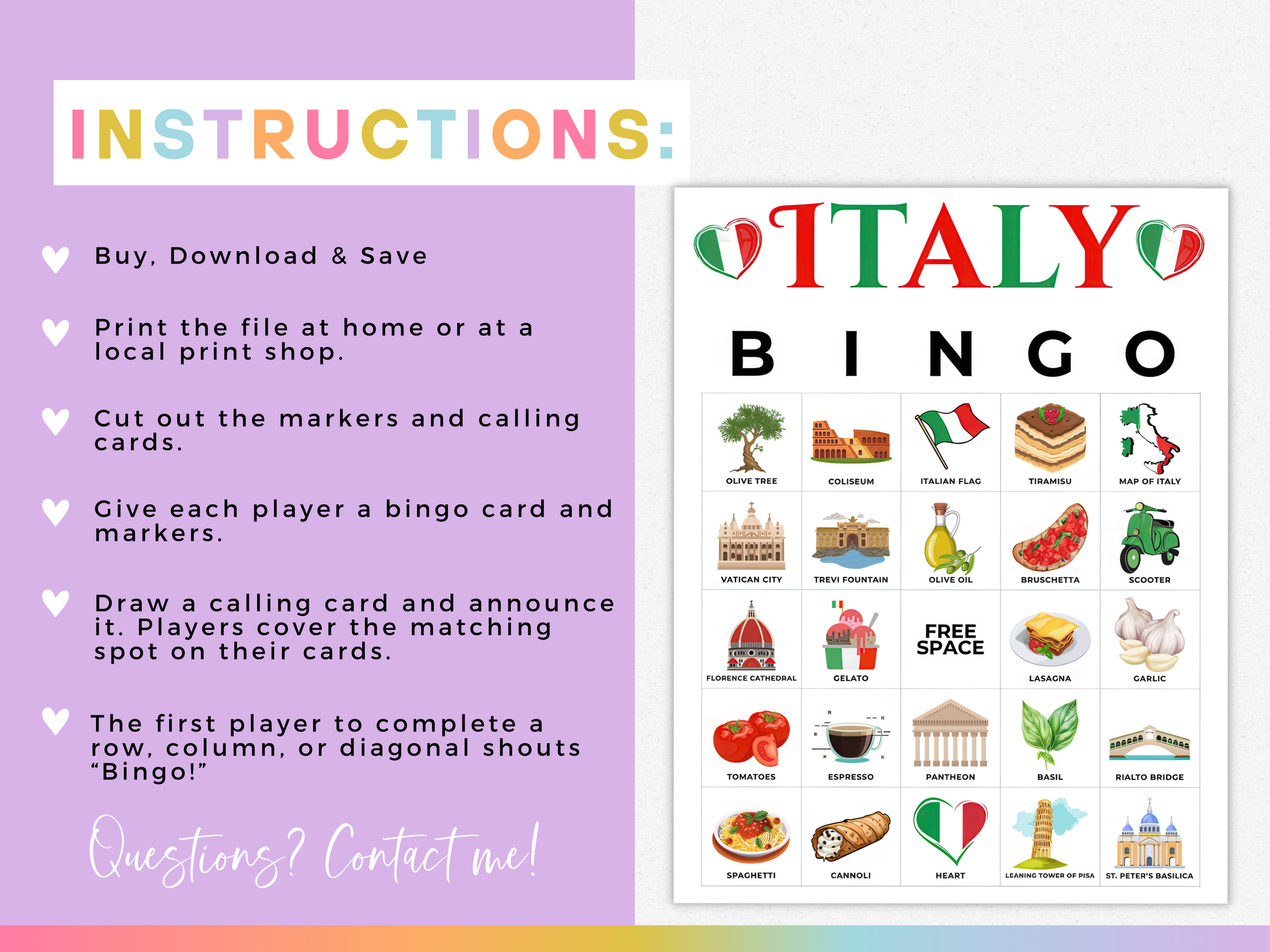 Bring a slice of Italy to your next celebration with this fun and colorful πππππ πππππ Game! Whether you're planning a travel-themed classroom activity, a baby or bridal shower, or a party inspired by Rome, Venice, and Florence this printable game is a perfect fit.