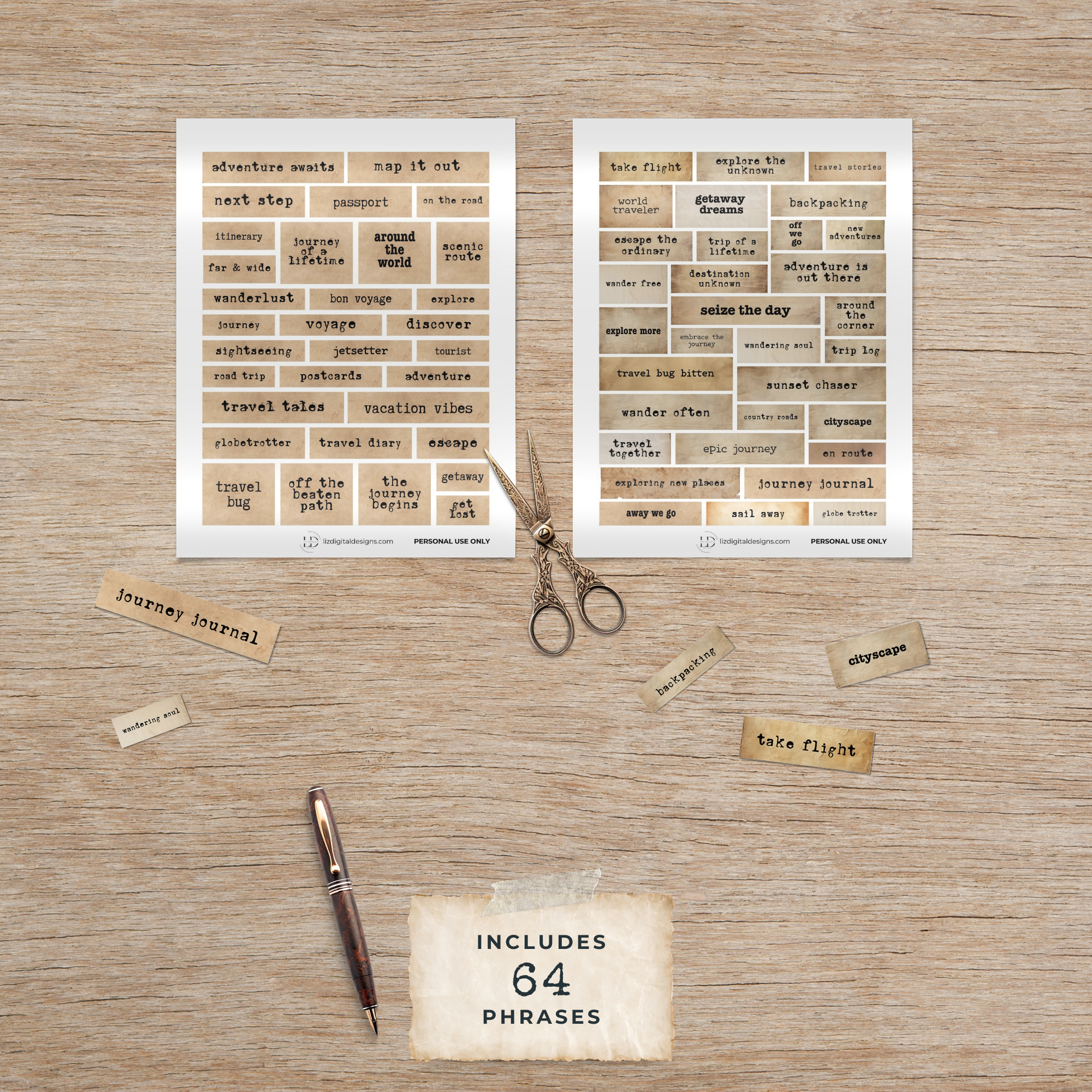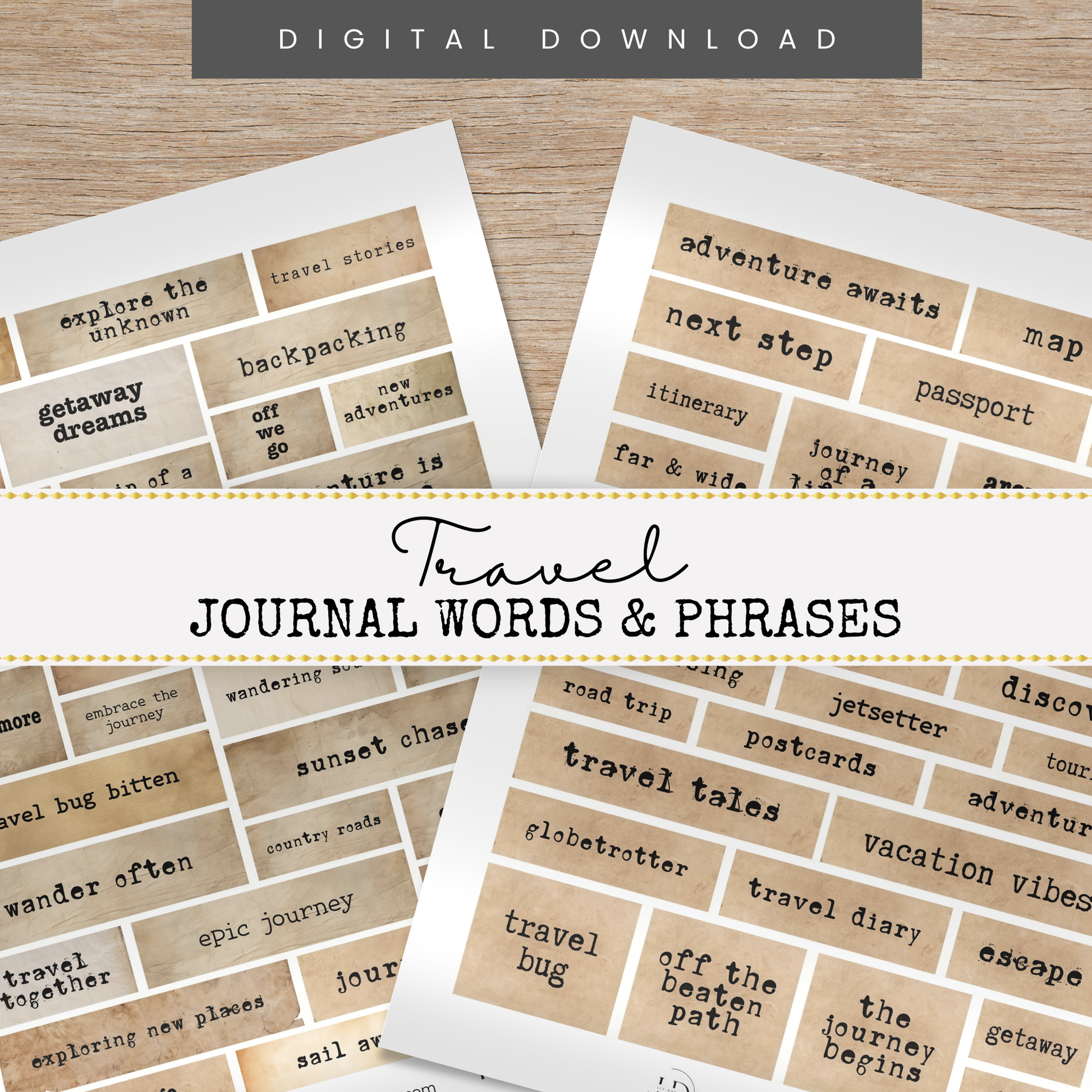 Add these travel-related words and phrases from the ๐๐ฎ๐ง๐ค ๐๐จ๐ฎ๐ซ๐ง๐๐ฅ ๐๐จ๐ซ๐๐ฌ & ๐๐ก๐ซ๐๐ฌ๐๐ฌ ๐๐จ๐ฅ ๐ - ๐๐ซ๐๐ฏ๐๐ฅ collection to your journal, scrapbook and paper crafts today! This collection includes 64 words and phrases on beautiful, vintage scrapbook paper.