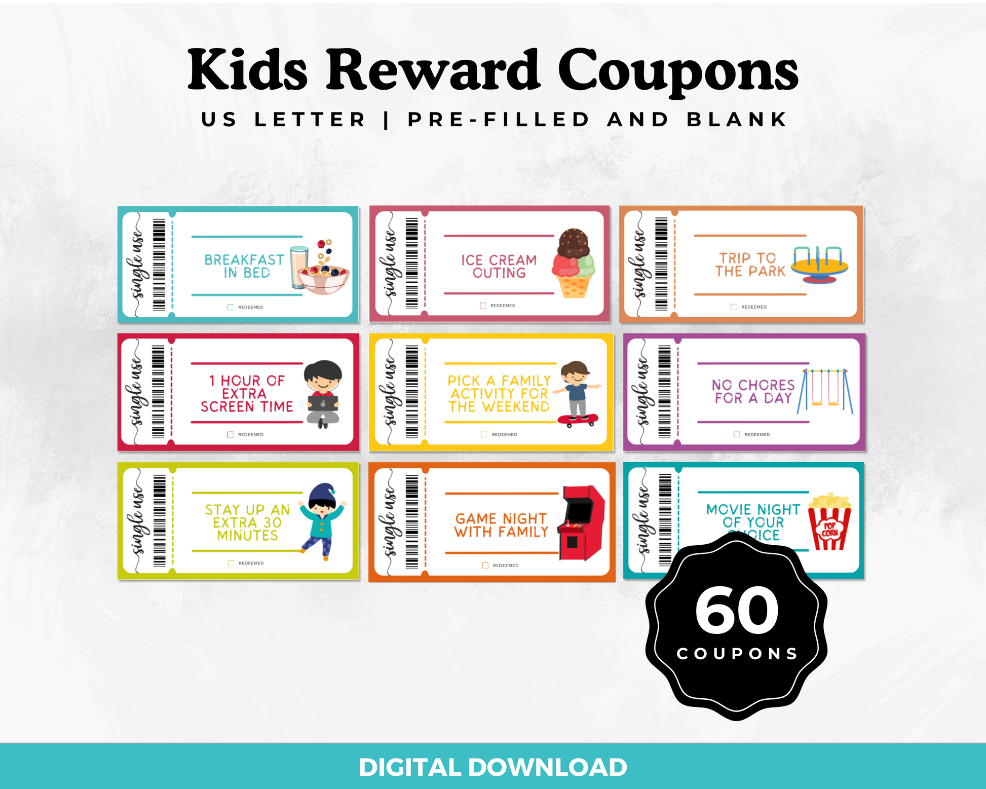 Looking for a fun way to motivate your kids? The ππππ ππππππ ππππππ ππππ is perfect for children ages 8-15! This digital download includes 60 printable reward coupons (including 10 blank coupons) for positive reinforcement and family activities. Use them as a reward system for kids, with options for chore coupons, extra screen time, and more!