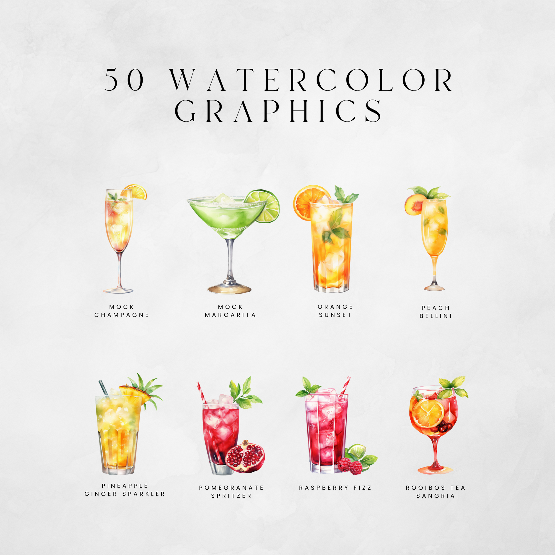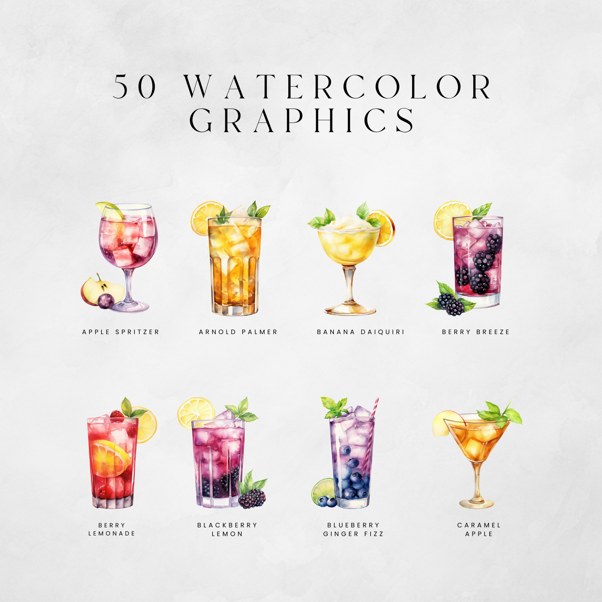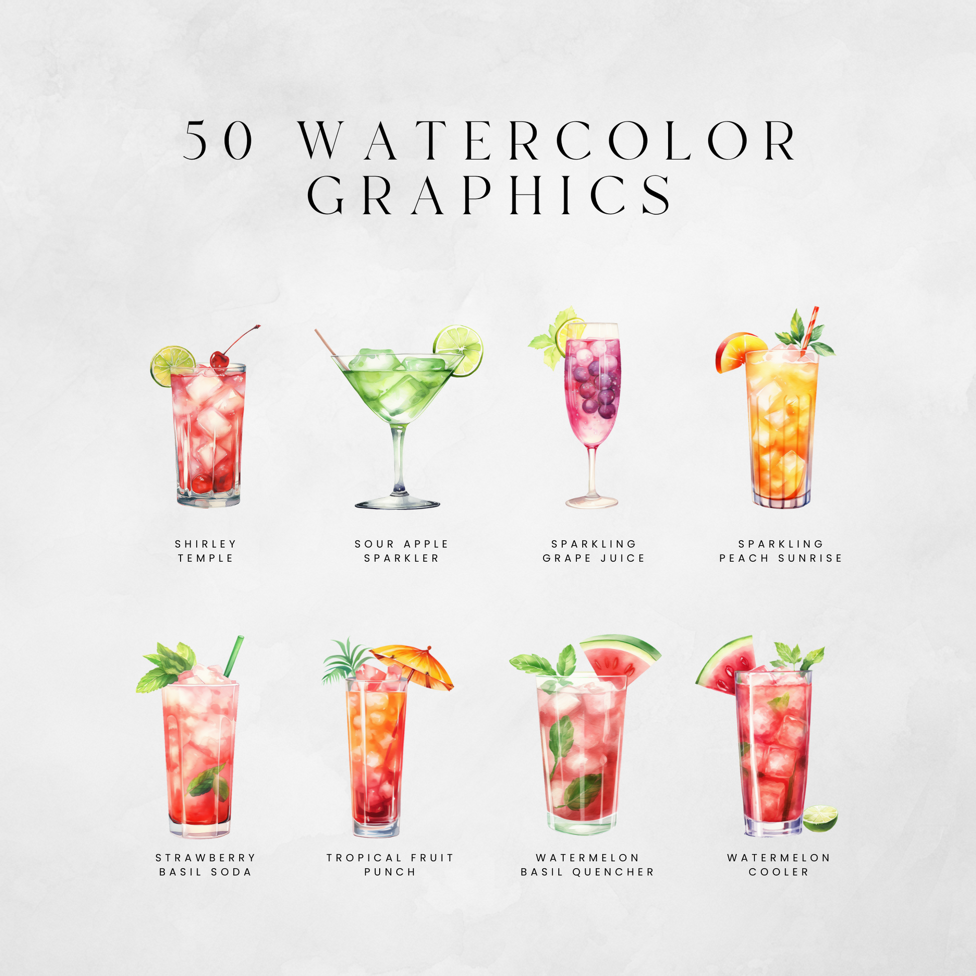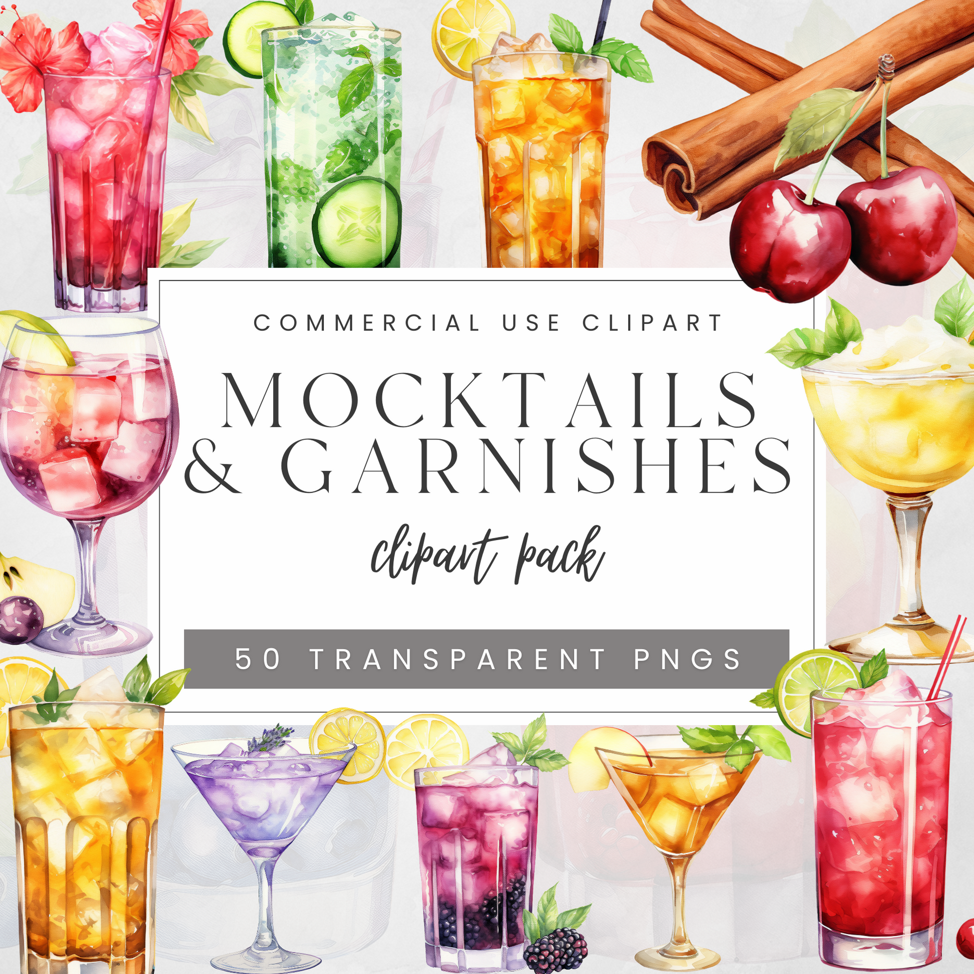 This ππ¨ππ€πππ’π₯π¬ & πππ«π§π’π¬π‘ππ¬ ππ₯π’π©ππ«π ππππ€ consists of 50 transparent PNG images of vibrant watercolor mocktails and garnishes ! These versatile illustrations are perfect for both personal and commercial projects such as invitations, posters and social media graphics. These high-quality images are also great for showcasing your favorite signature cocktails or creating a festive beverage menu!